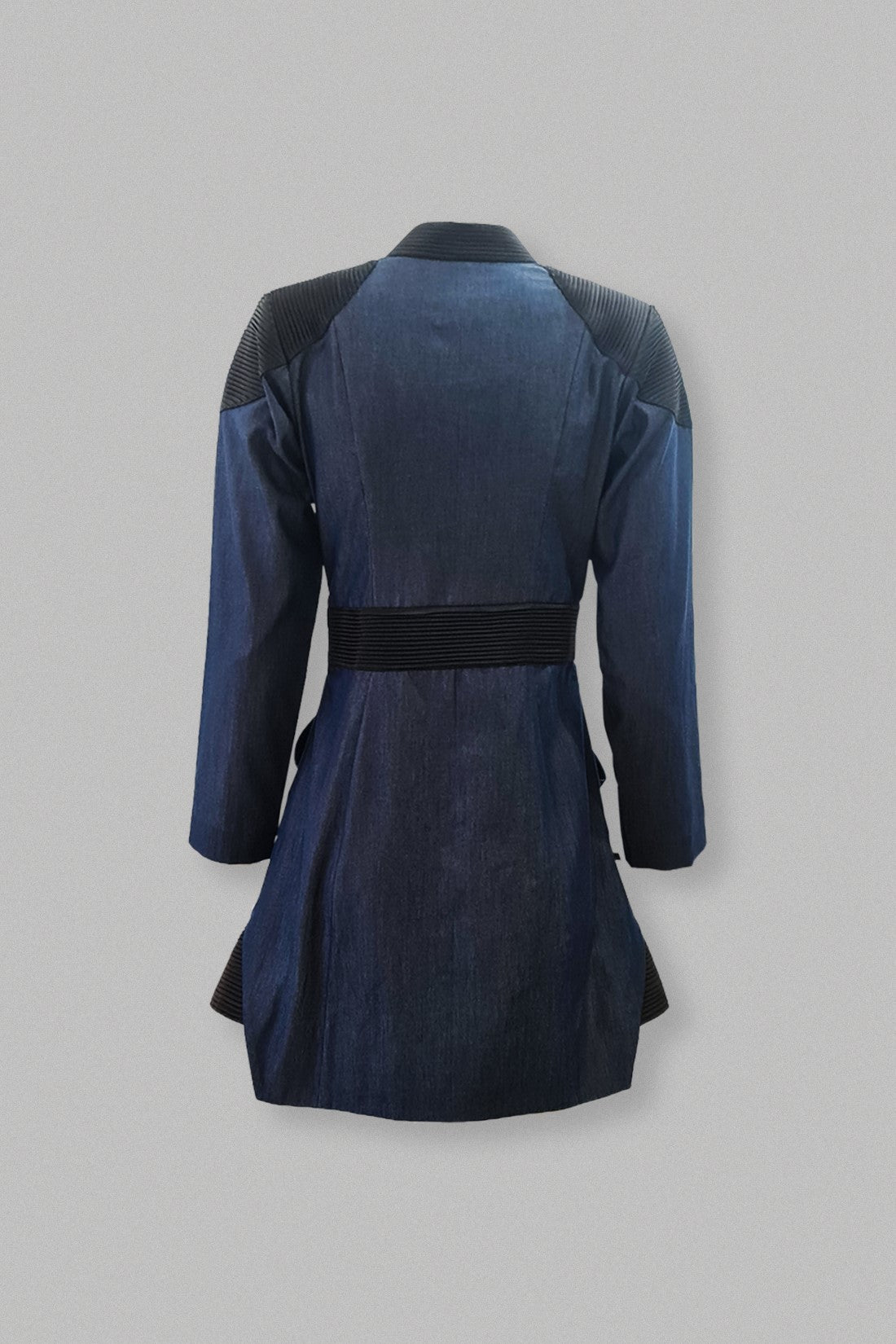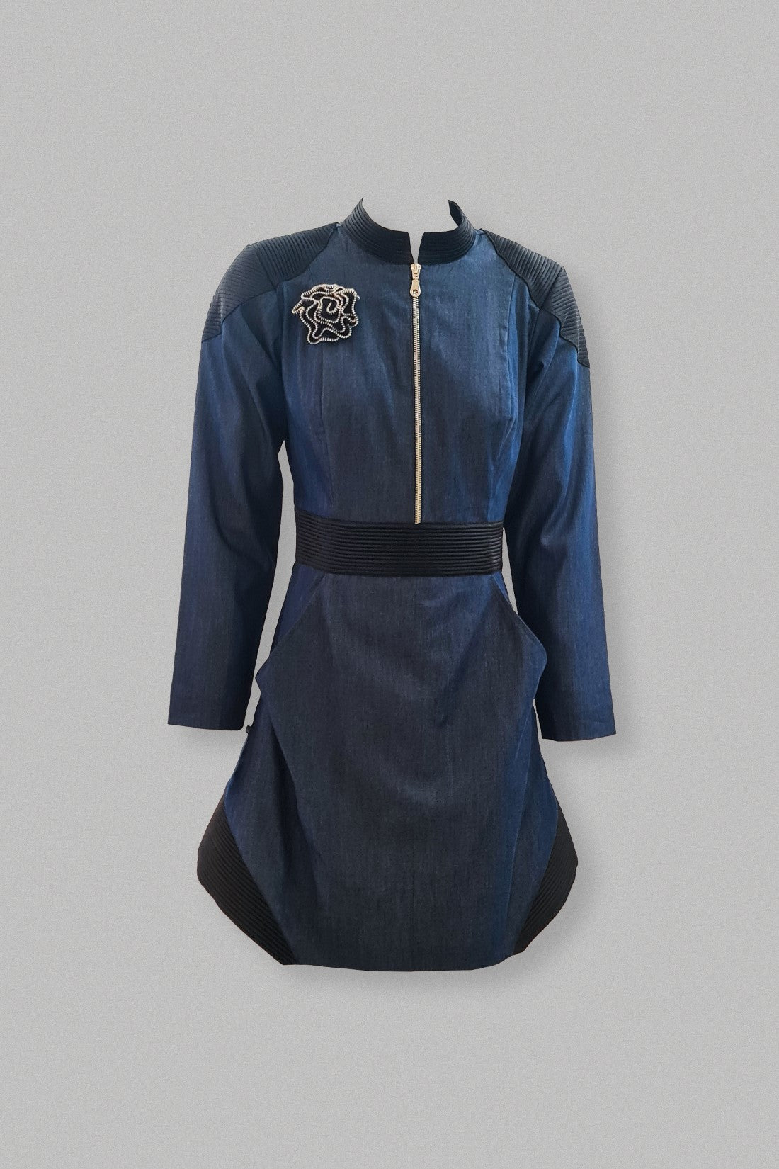 A chic denim dress with sharp shoulders accentuated with cord detailing in contrast fabric on shoulder, collar and waistbelt and a handmade brooch.