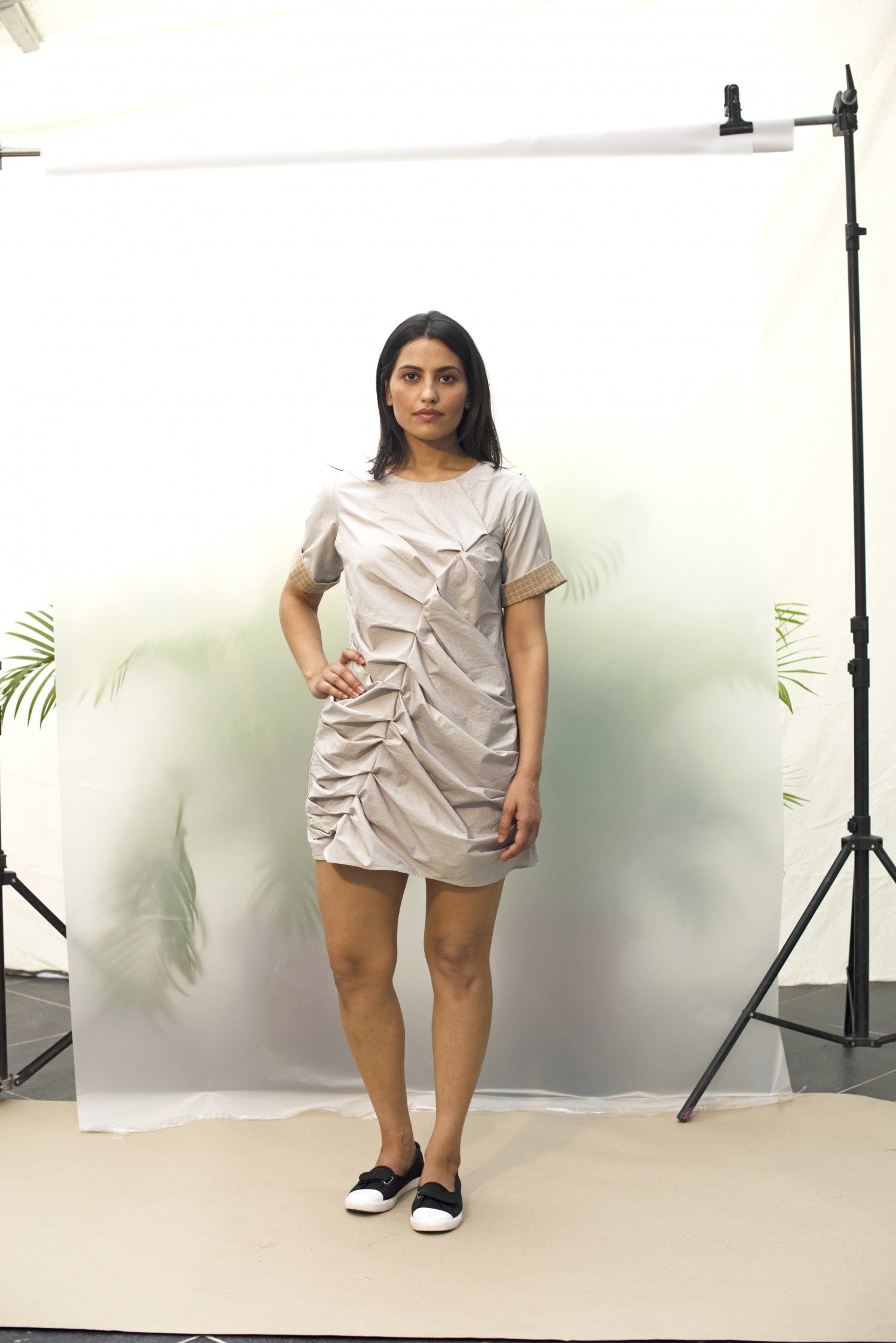 Shift dress with fabric manipulation across the dress in an asymmetrical cut