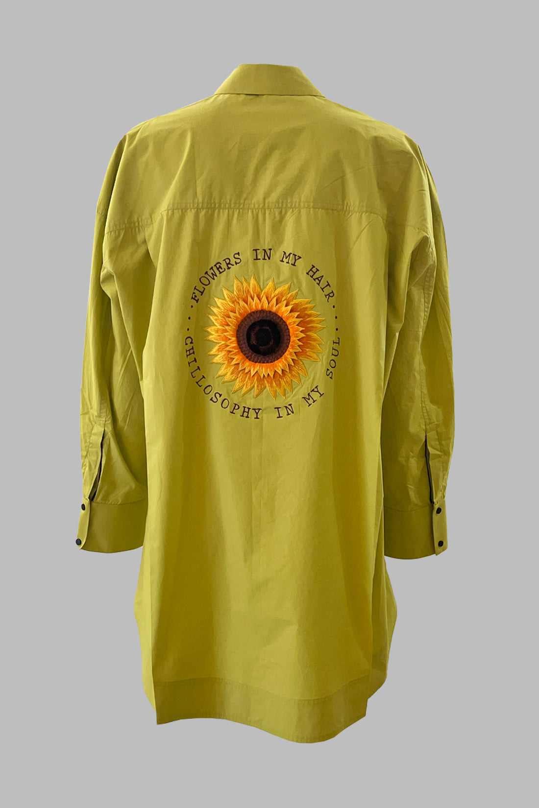 Elevate your wardrobe with our mid-length oversized shirt, featuring a sunflower embroidered patch at the back. Perfect for work, travel, and those effortless after-work outings. This versatile piece is one of our current faves—stylish, comfortable, and ready to make a statement wherever you go