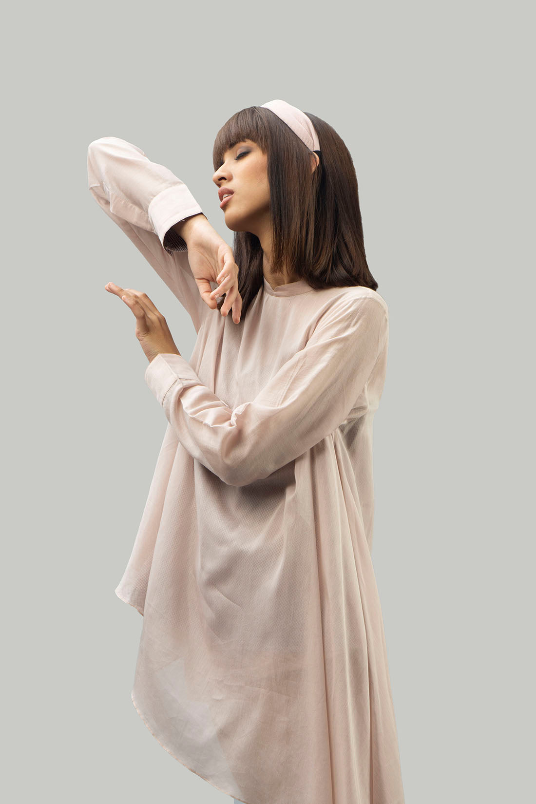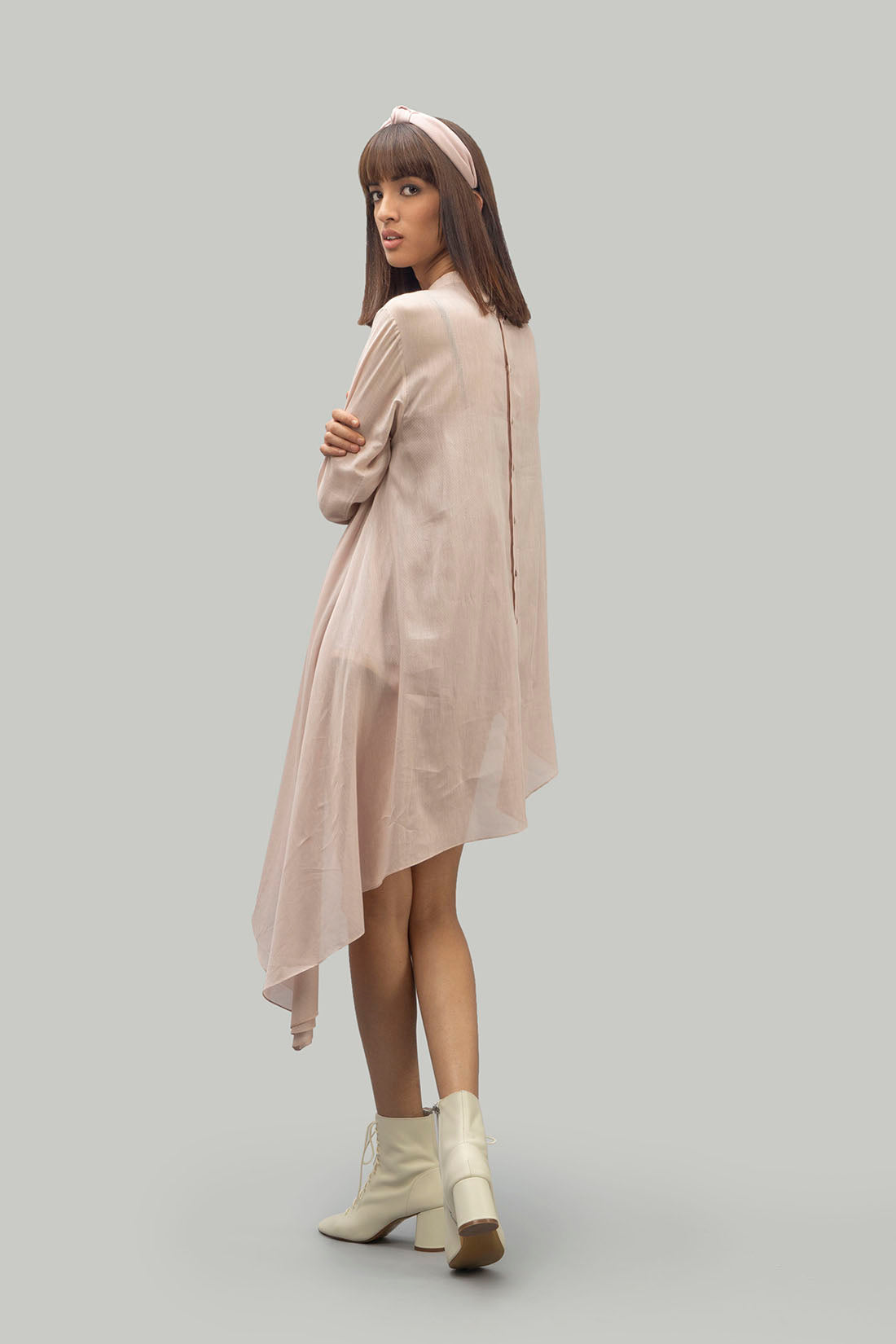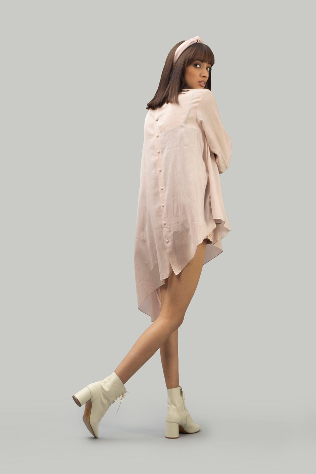 Asymmetrical mid length tunic with round handmade buttons at the back