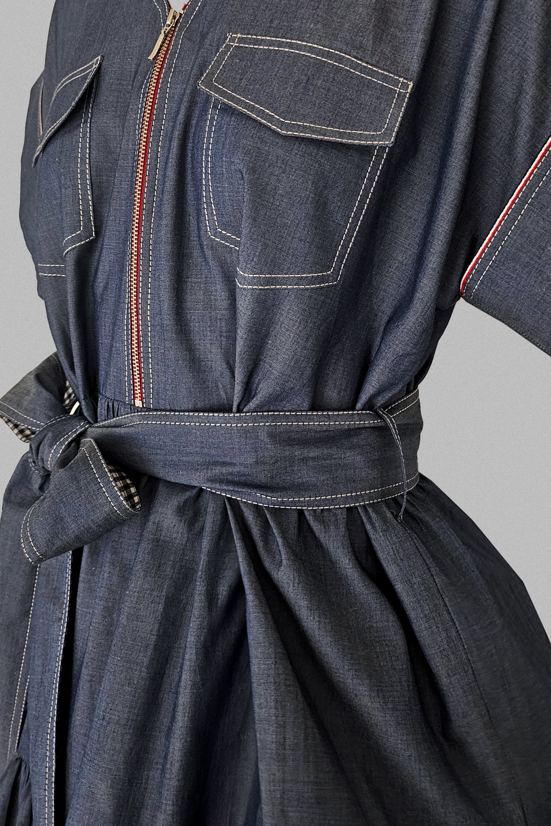 Coquette and classic. The bow-adorned dress version of our beloved jumpsuit—because, let's face it, we could all use a little more movement. This classic denim garment features a full-zip front, cord lining, and deep pockets.
