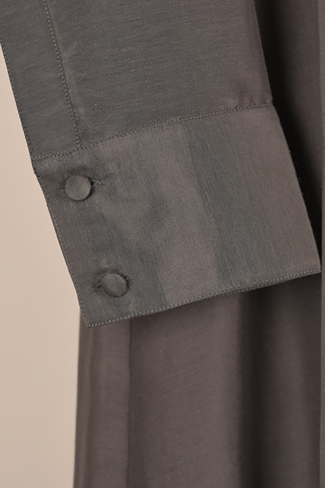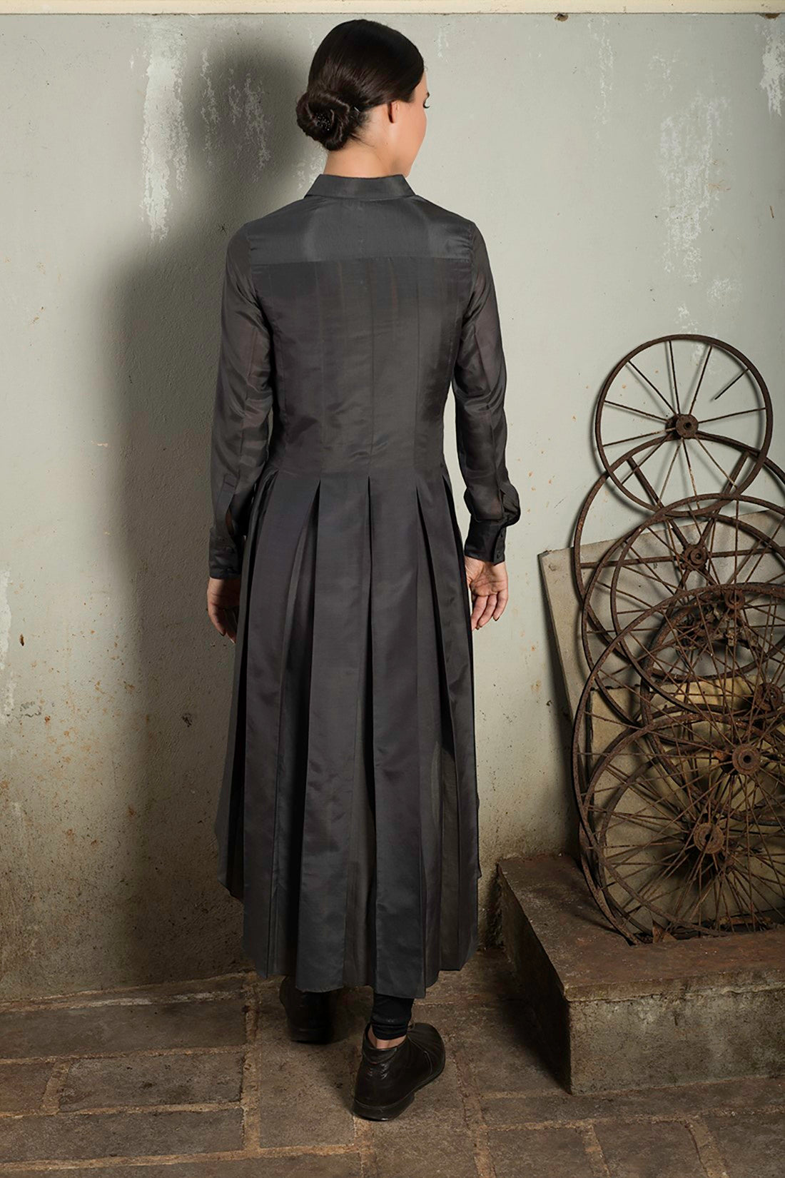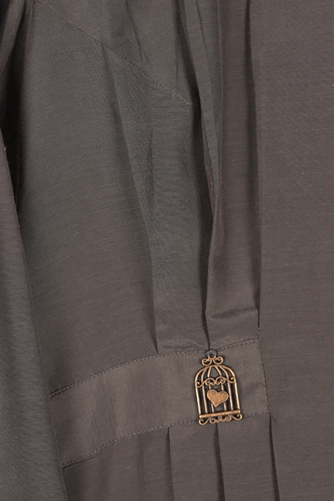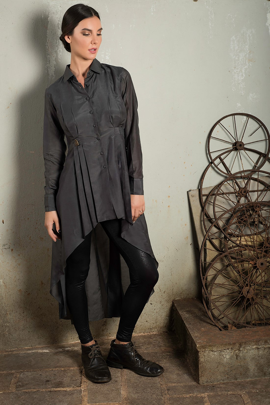 Shirt dress with cascade length to the back and pleat details on the waist and unique metal charm detail