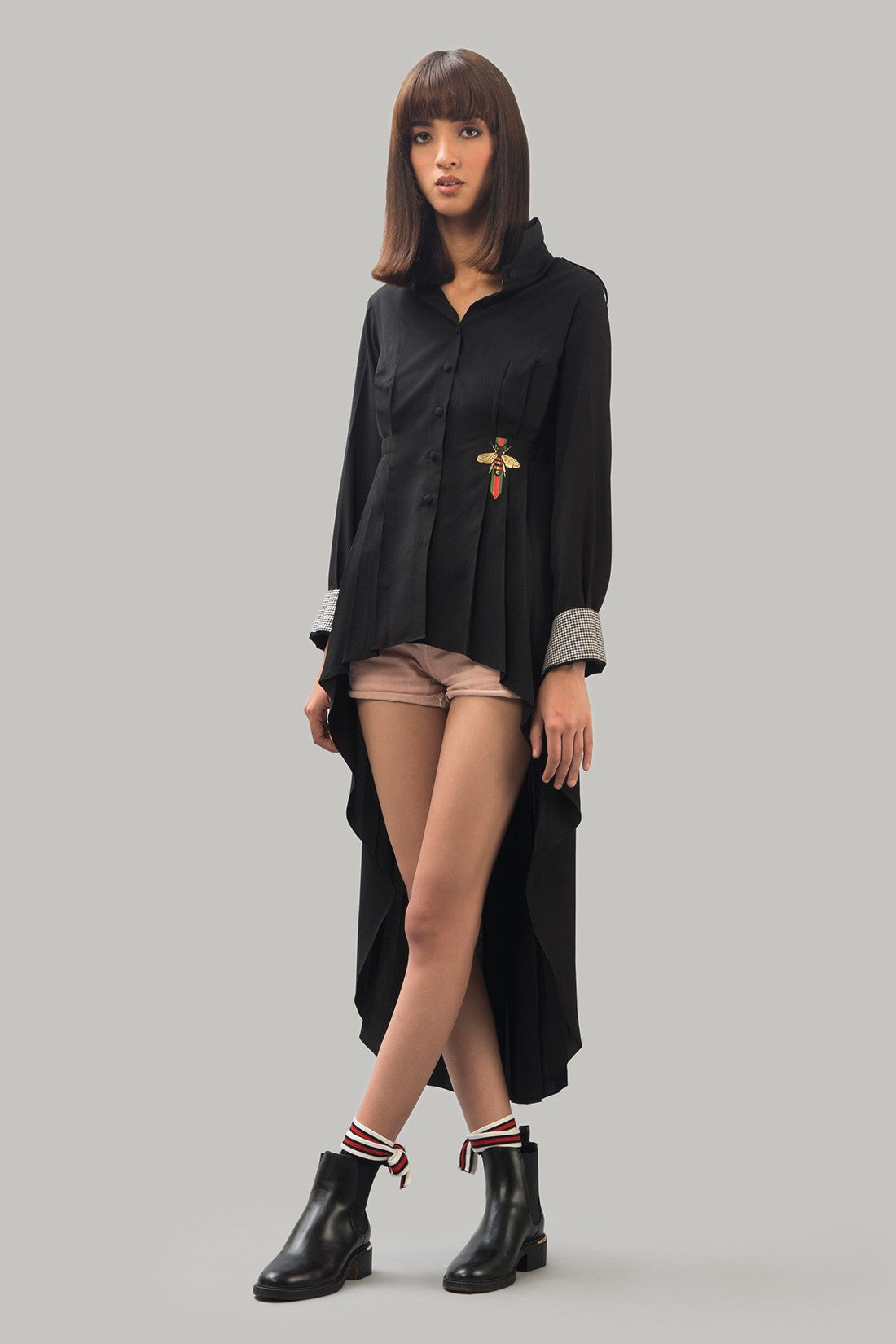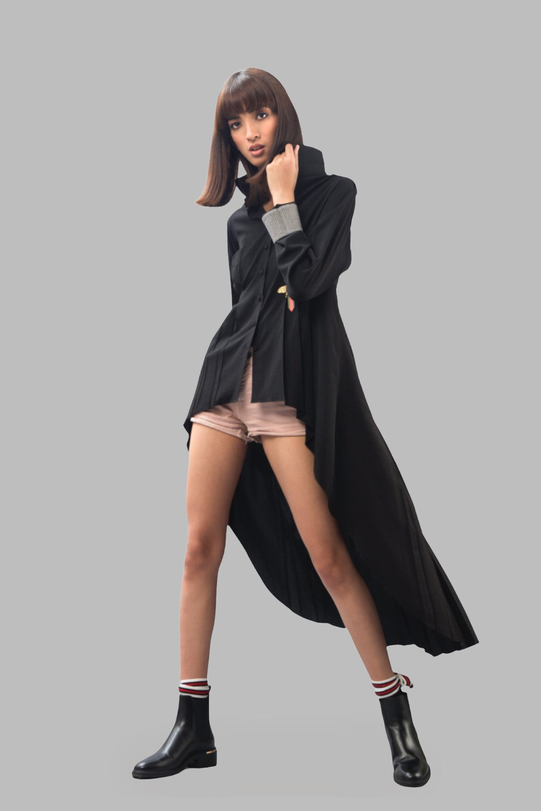 A cascading shirt dress with box pleats details to create a flare silhouette completed with military accents and shoulder straps
