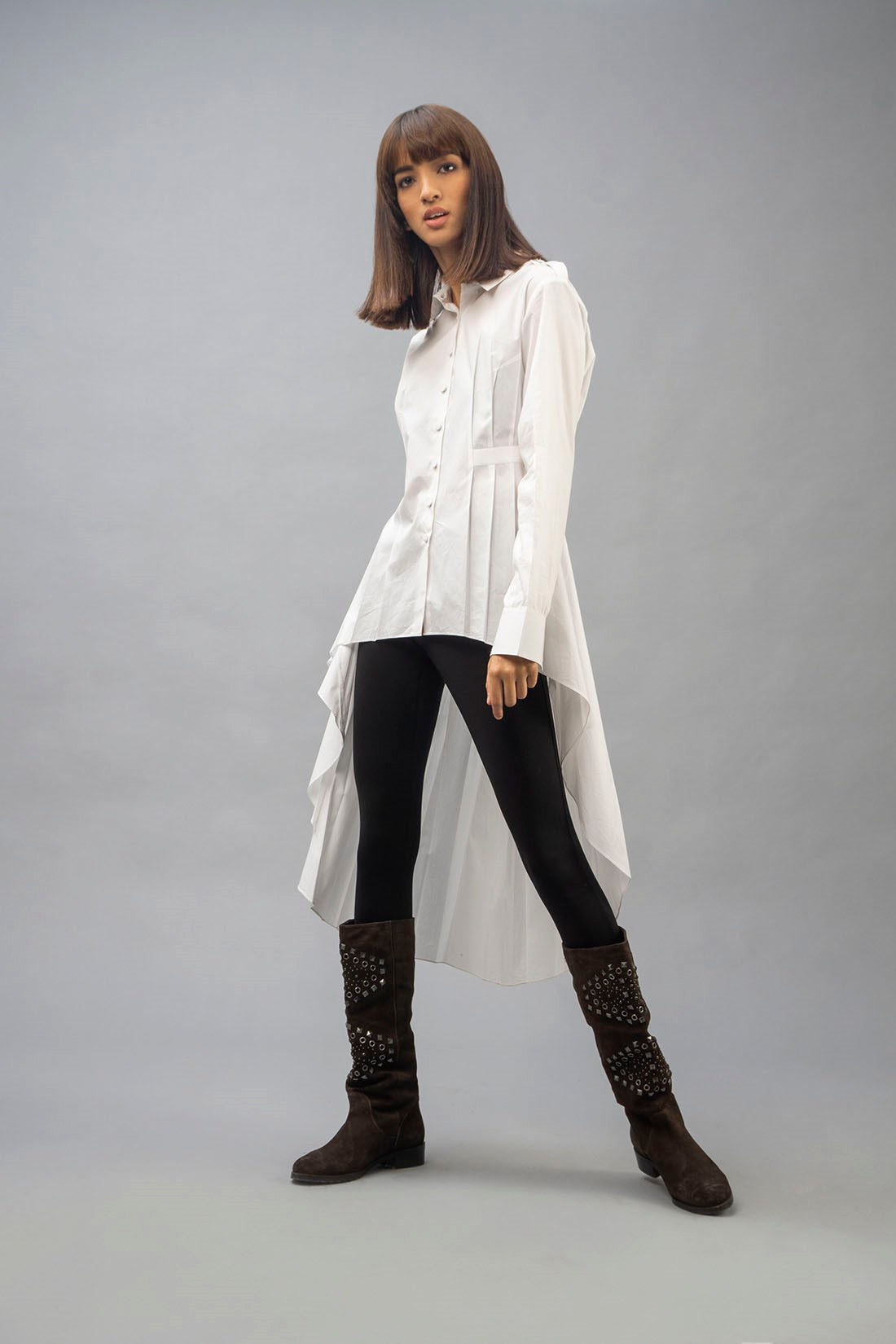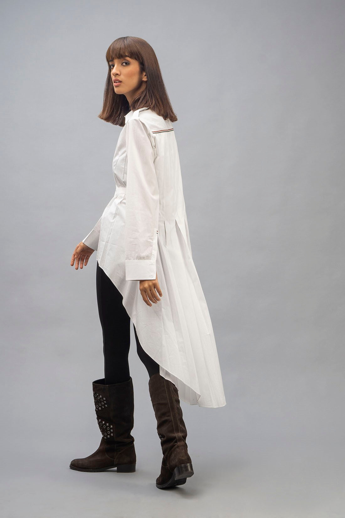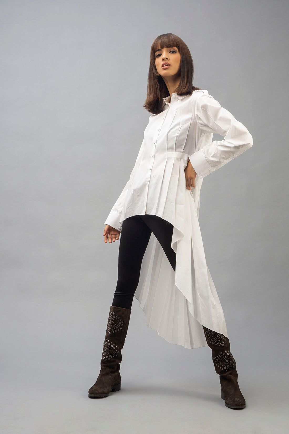 Shirt dress with cascade length to the back and pleat details on the waist and unique pop art detail