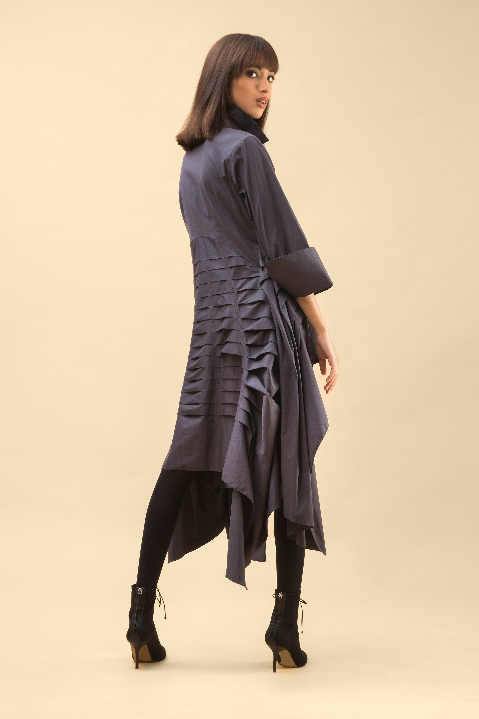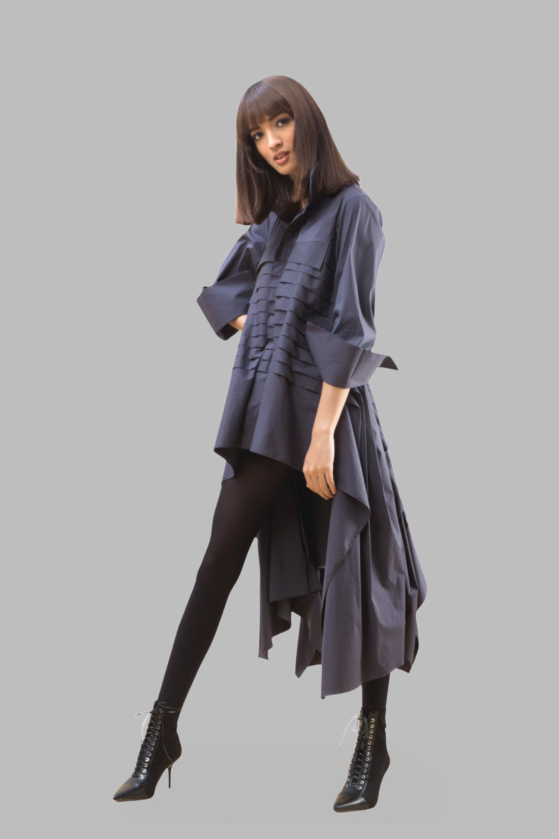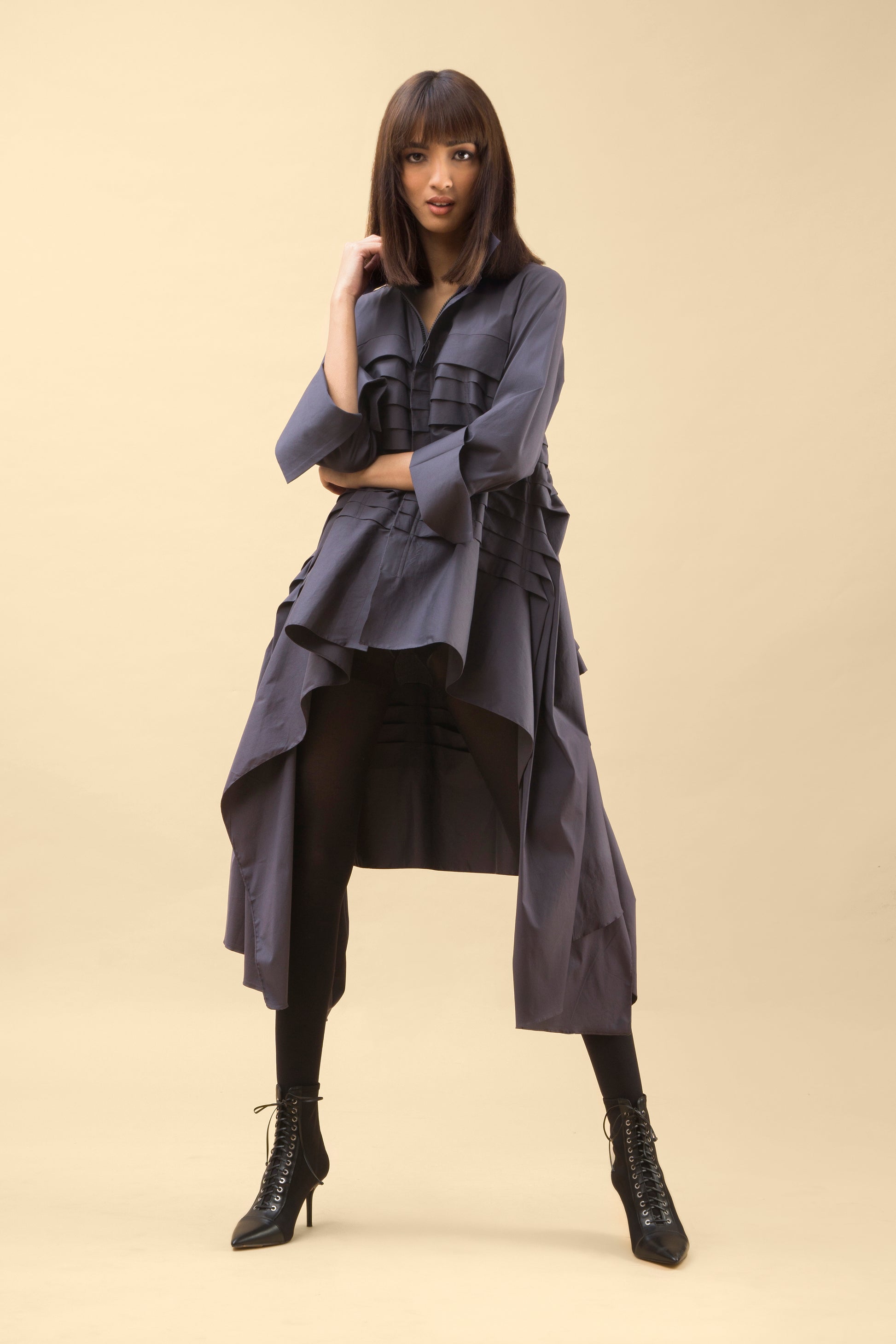 This edgy, sophisticated, wearable meet avant garde outfit features sharp tailoring and fabric manipulation throughout. The best part? It looks equally stunning when it’s worn as a jacket or a cover up over a dress, tunic or a pair of formal pants.
