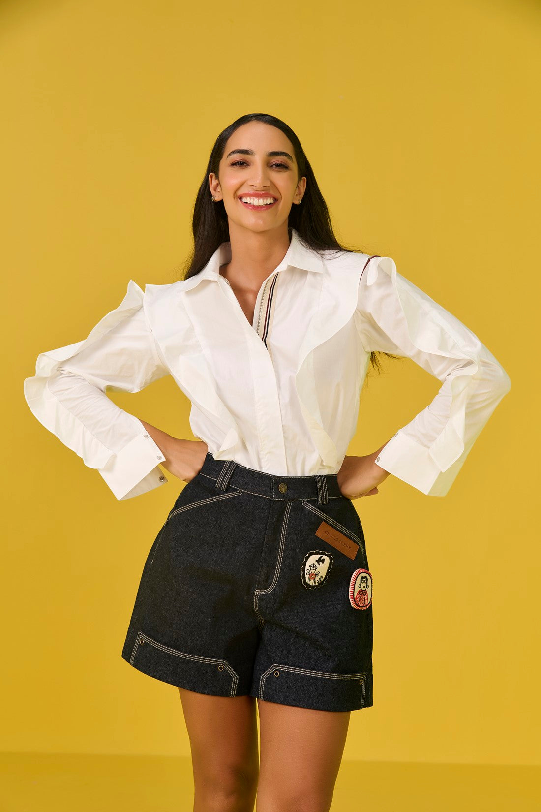 Step out in style with these mid-thigh length shorts with a slight flare at the hem that’s comfortable and effortlessly chic. The shorts feature quirky brooches thoughtfully placed around one pocket- each of a little statement piece, adding a touch of personality and fun.