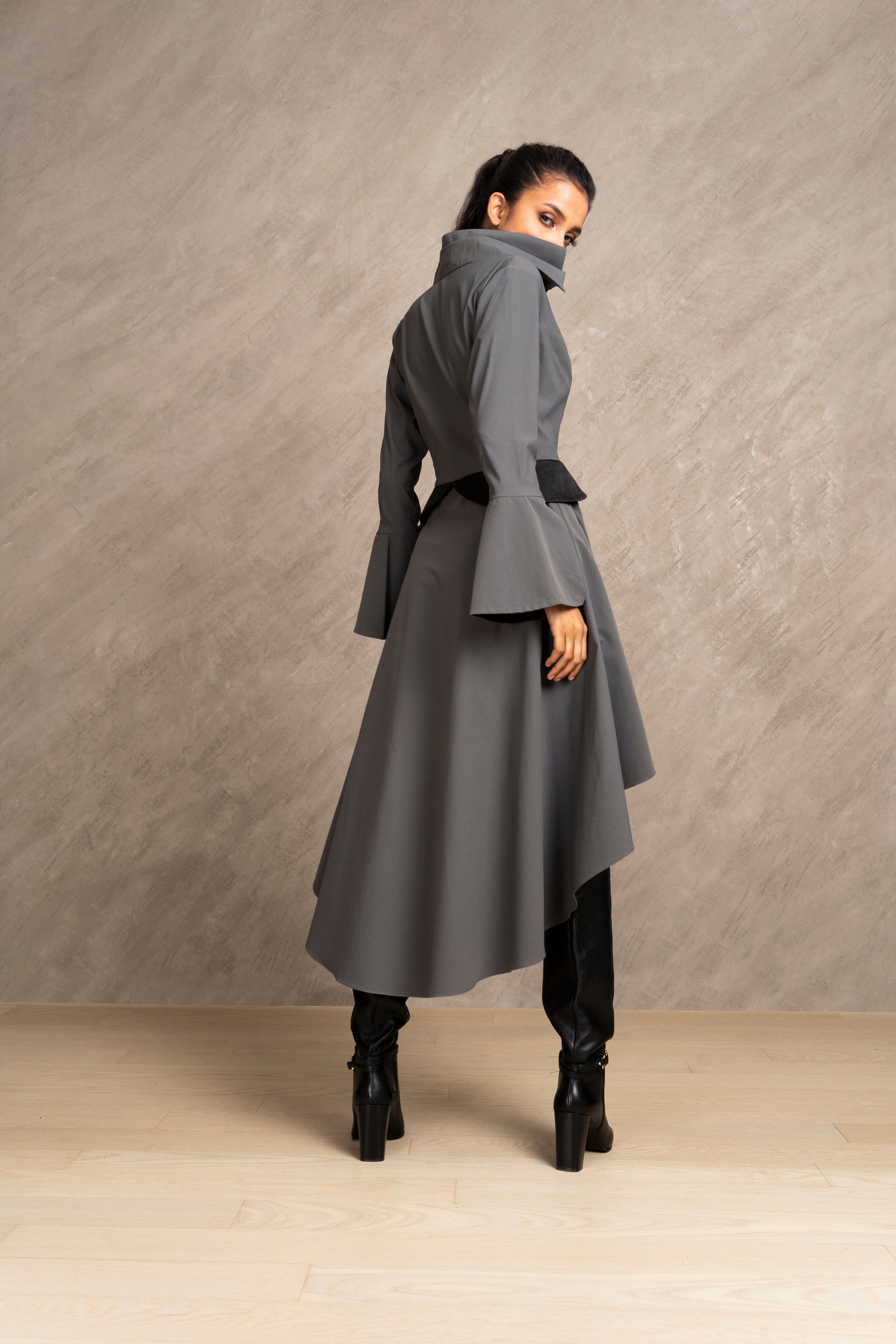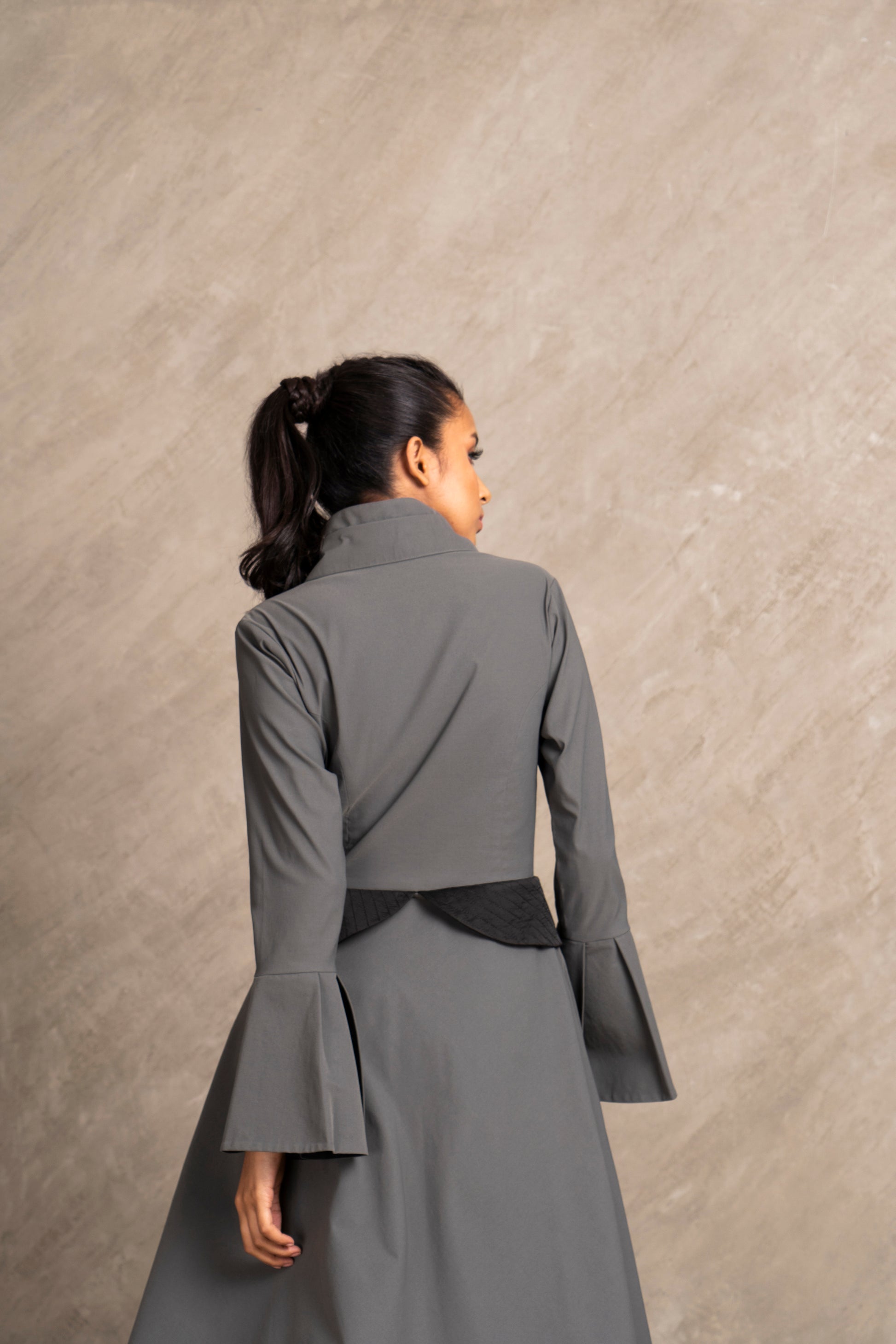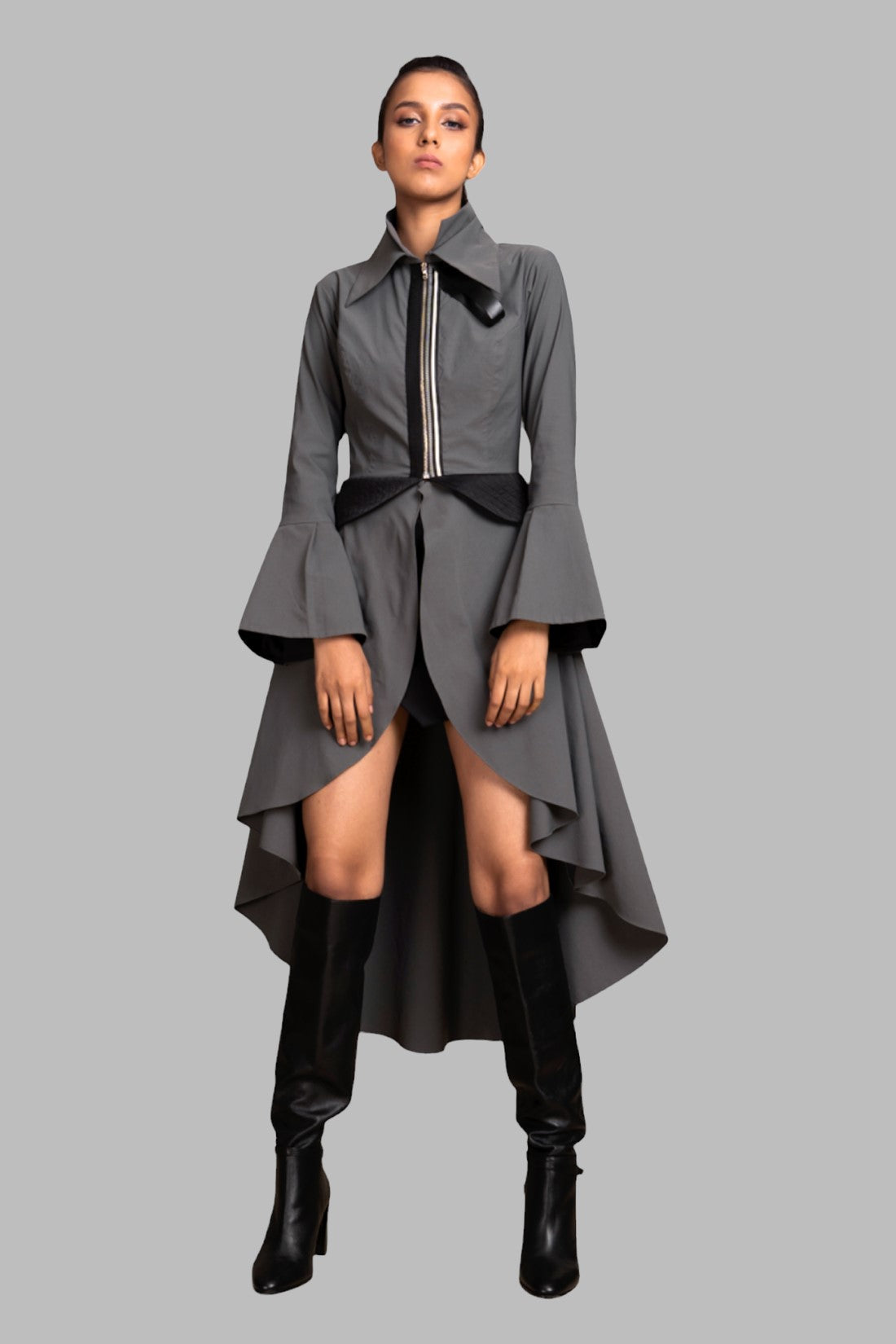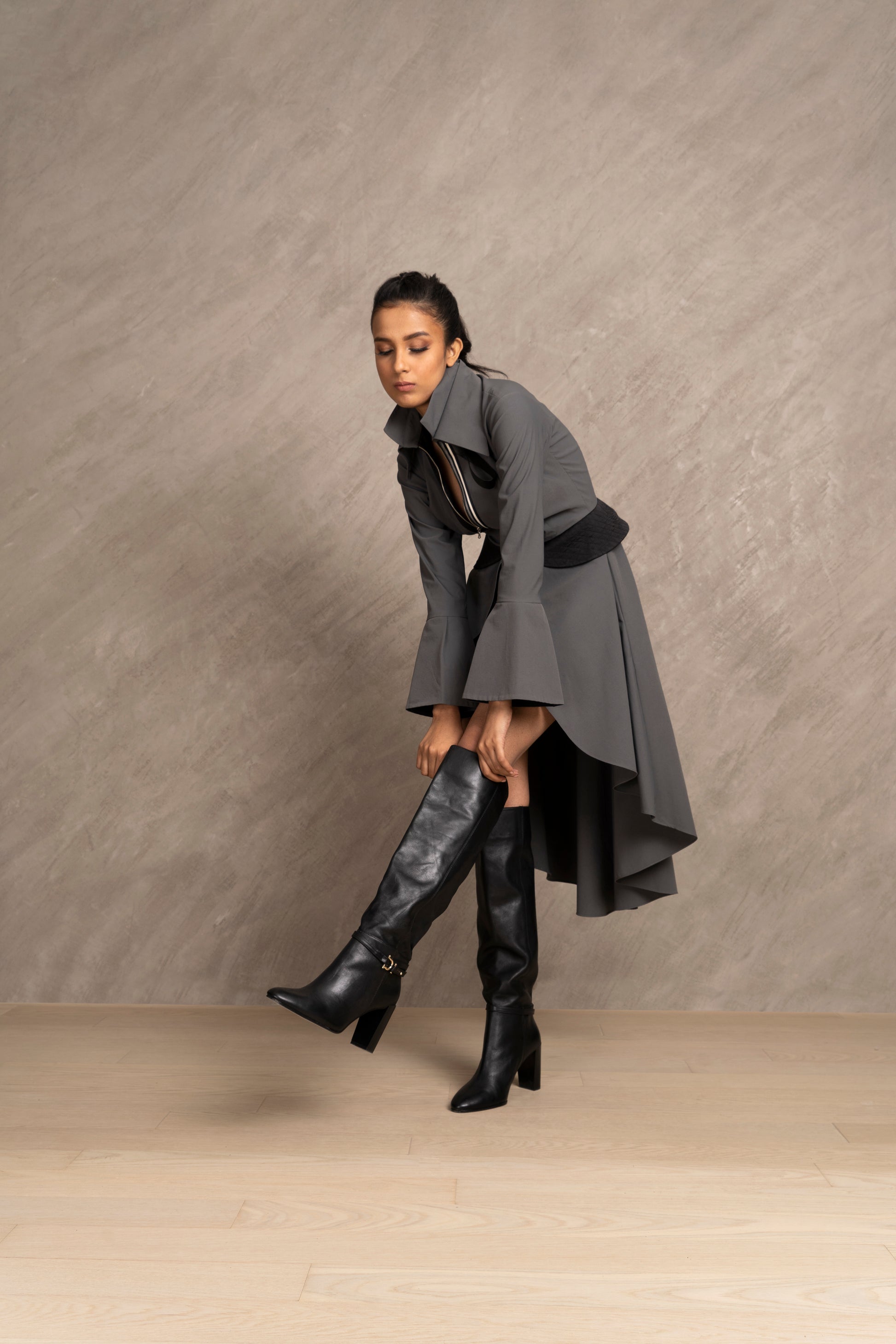 Elevate your style with our statement piece, Black Mamba – tunic dress with sharp silhouette, front opening metal zipper, cascading skirt and high double collar detailed with imported lace and quilted satin wings on the waistline.