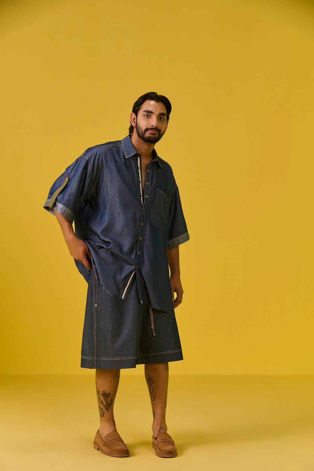 These boxy-cut shorts are all about laid back structure with subtle details. The elastic waistband with multicoloured drawstring keeps it easy yet stylish. The pseudo button fly adds just enough character to the shorts. Clean lines, relaxed volume keeps the outfit minimal on surface, max on attitude.