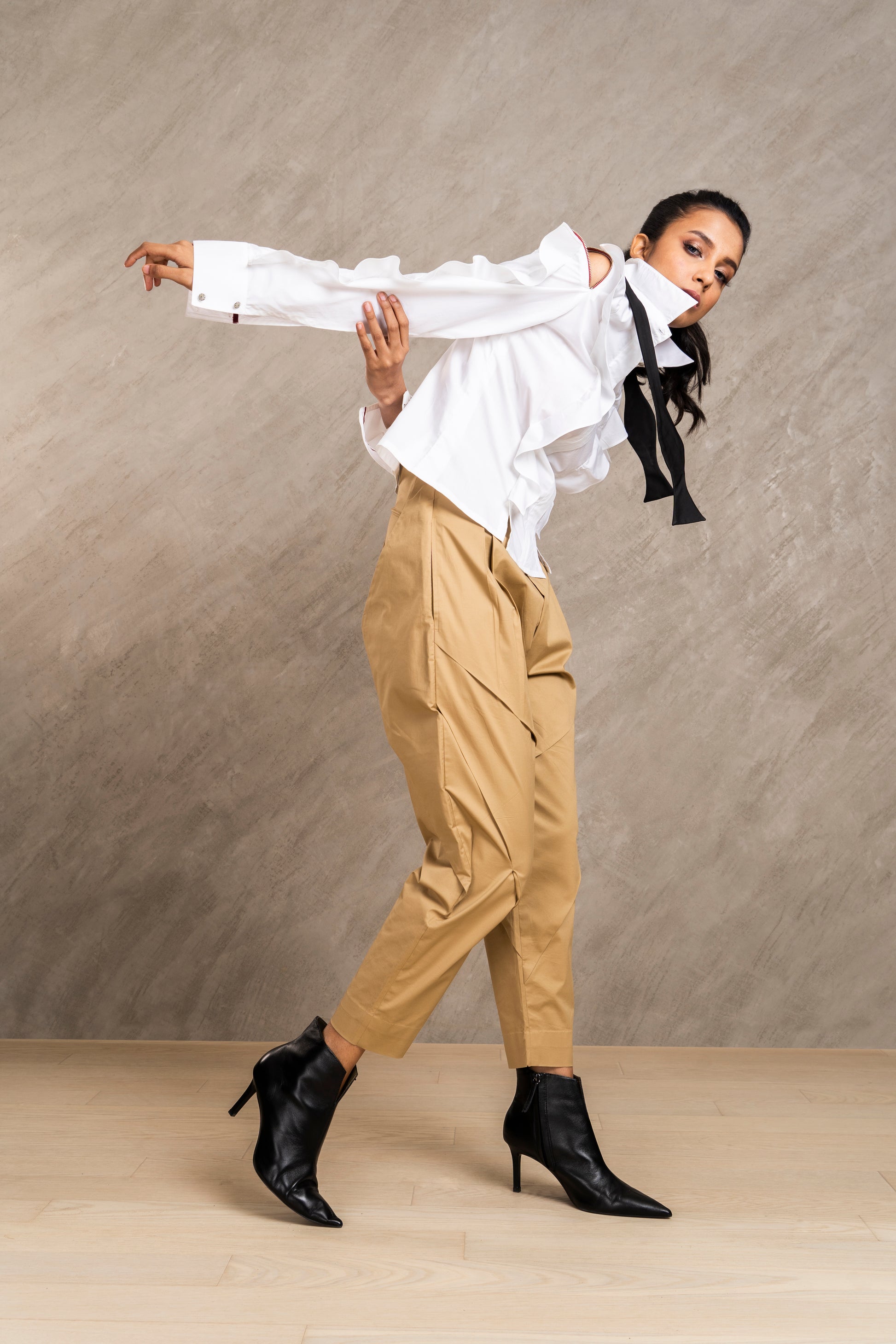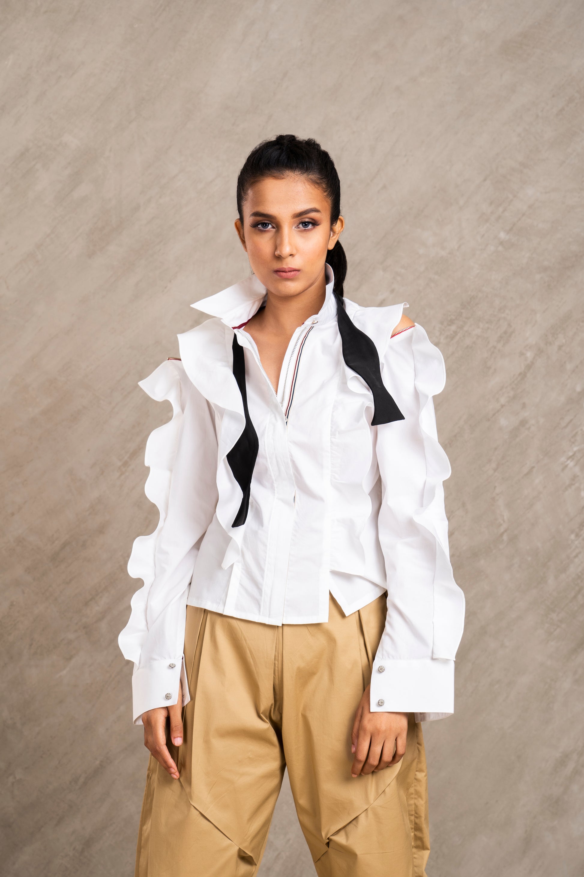 A tailored design shirt with oversized ruffles on the front and along the sleeves featuring red metal zipper on the shoulder, front opening zip with maroon, blue and khaki stripes and a star button on the collar. Draw focus to the dramatic silhouette by styling it with CLYDE pants