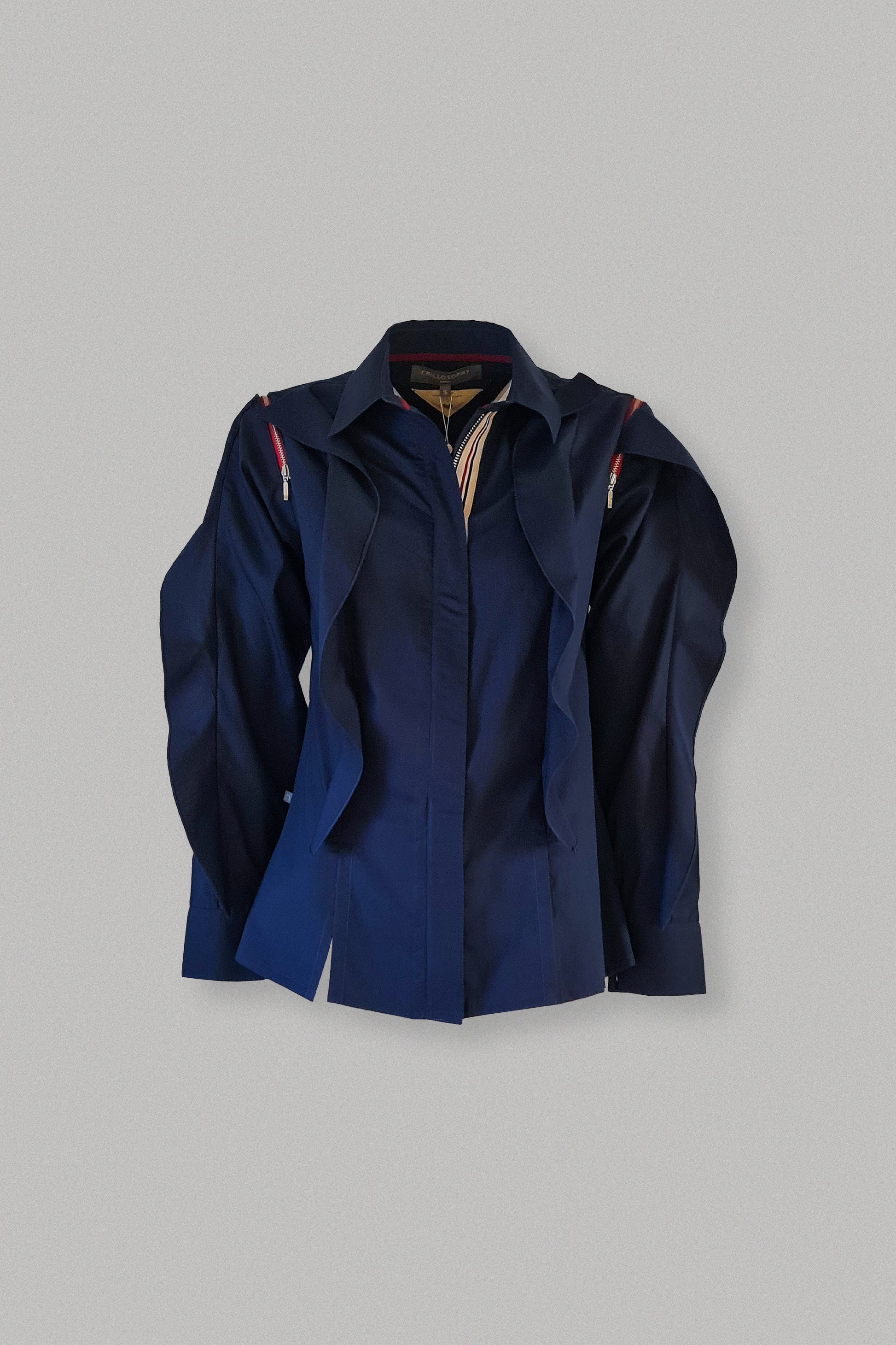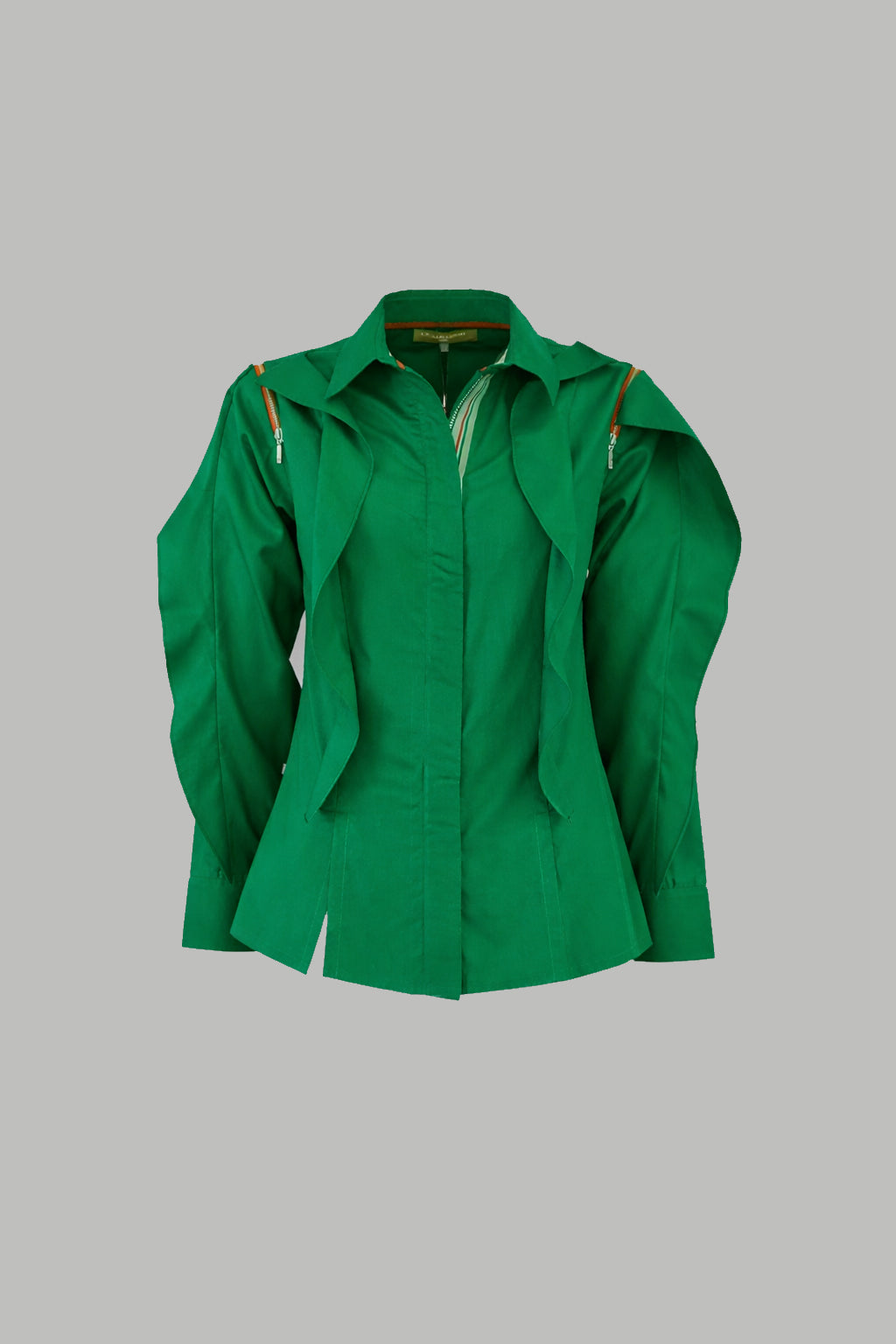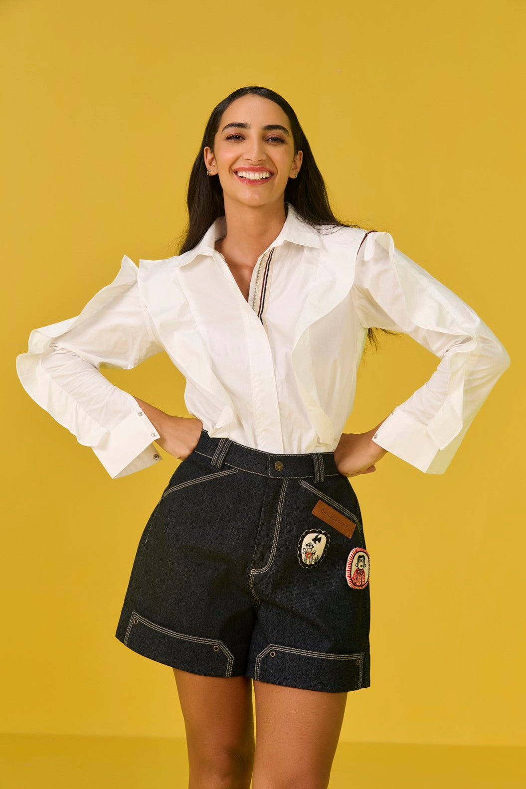 Step out in style in this crisp shirt, tailored to perfection with oversized ruffles, zip opening on shoulders and embellished with our signature rhinestone studded lip patches on the back.