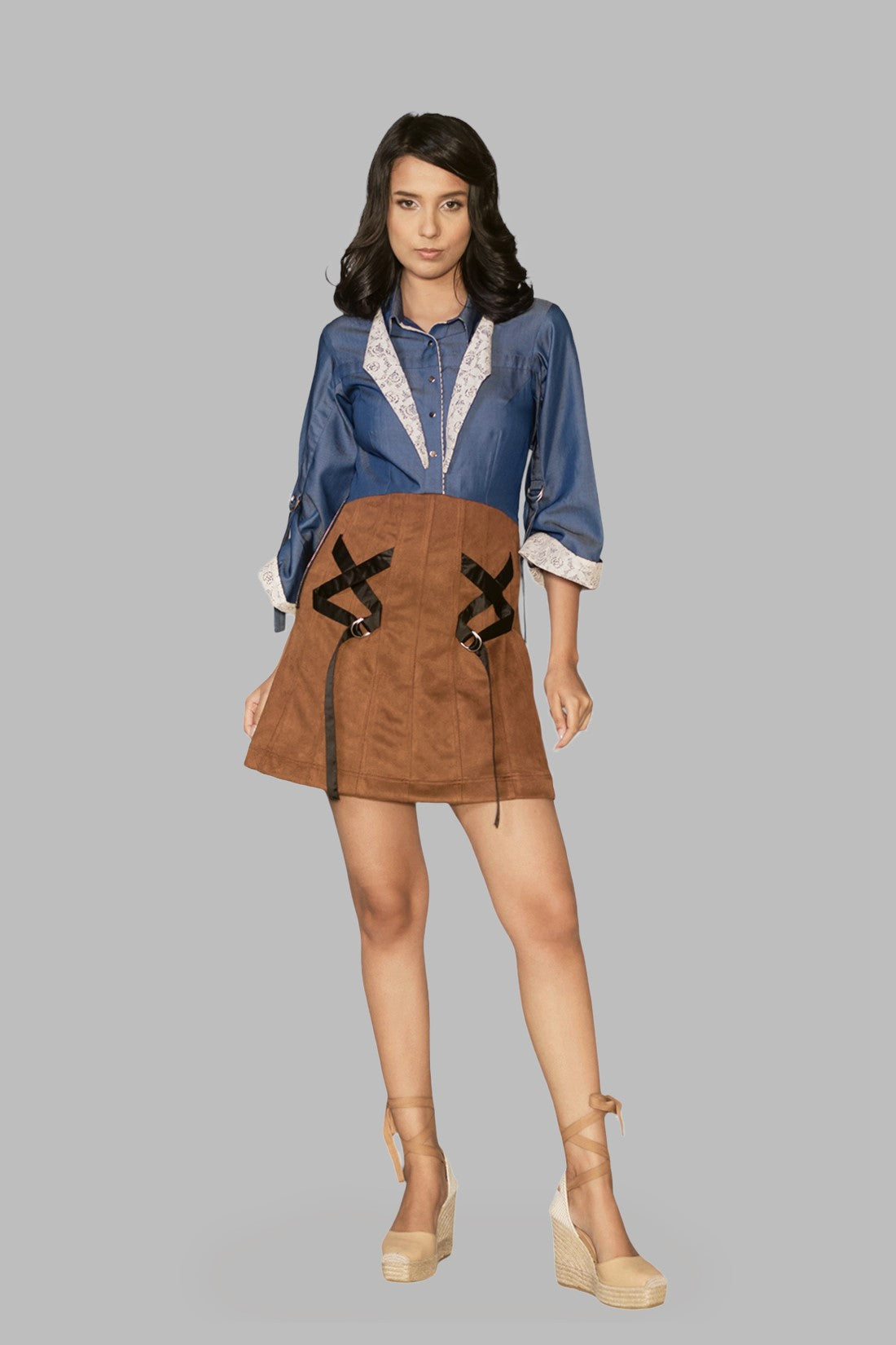 In this dress, we've reimagined the opulence of the Victorian era, infusing it with the casual chicness of chambray and the luxurious texture of suede. The result? A fashion revolution that embodies both sophistication and comfort, perfect for those who dare to make a statement.