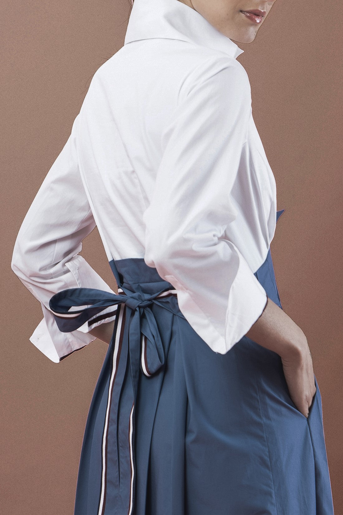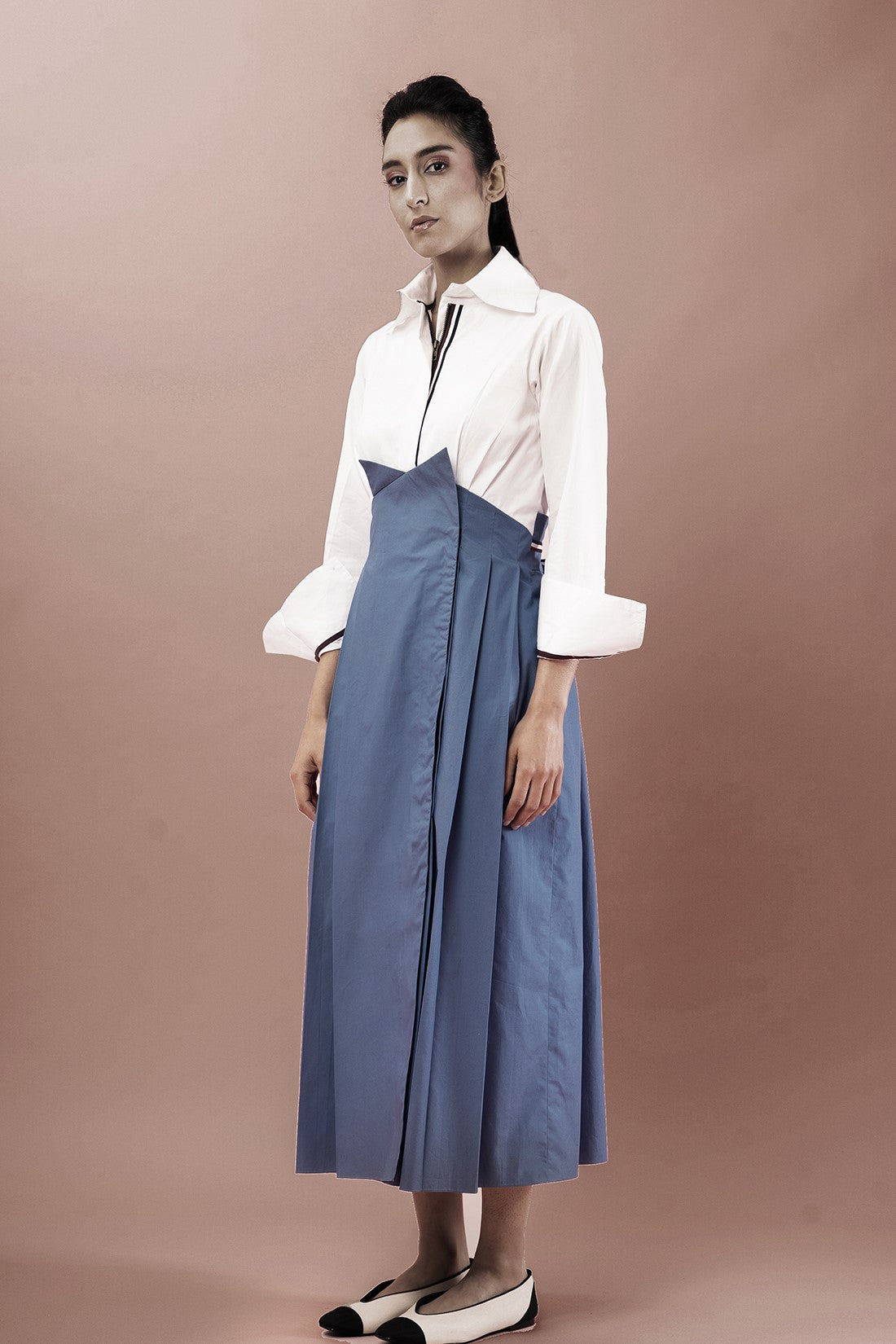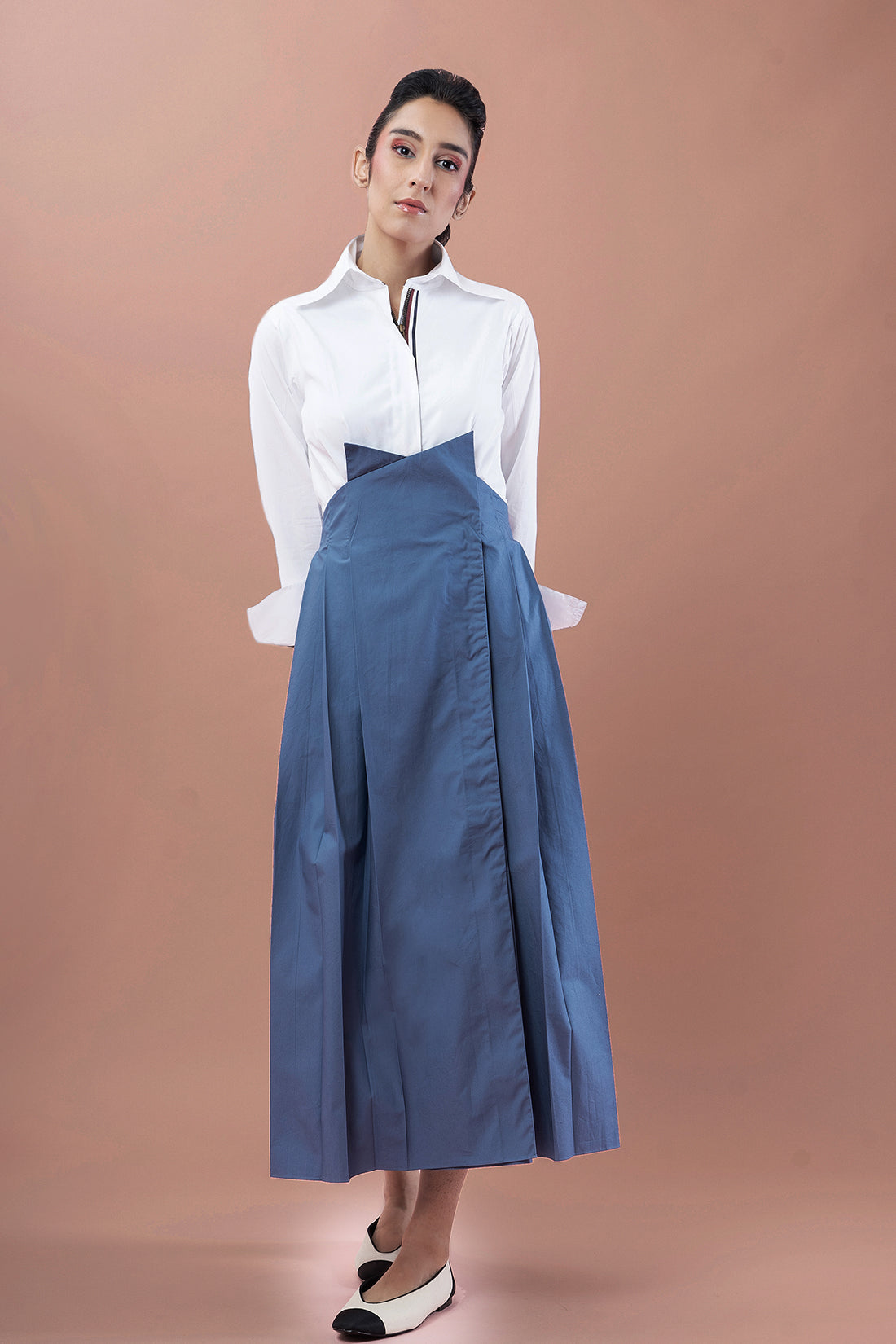 A long shirt dress with color-blocking and a sharp collar, Calypso is a statement in contrasts. Its overlapping design is an ode to layered perspectives.