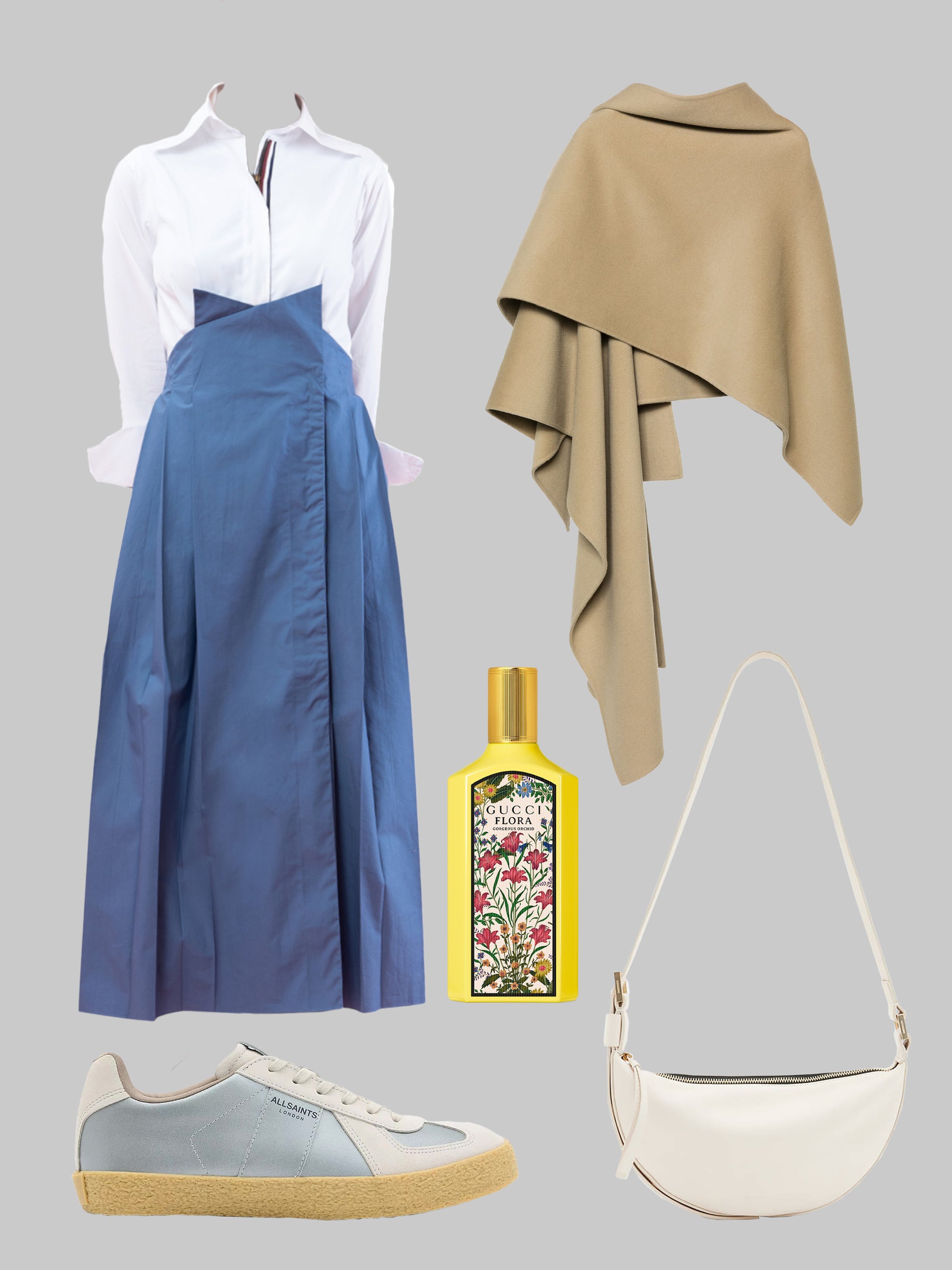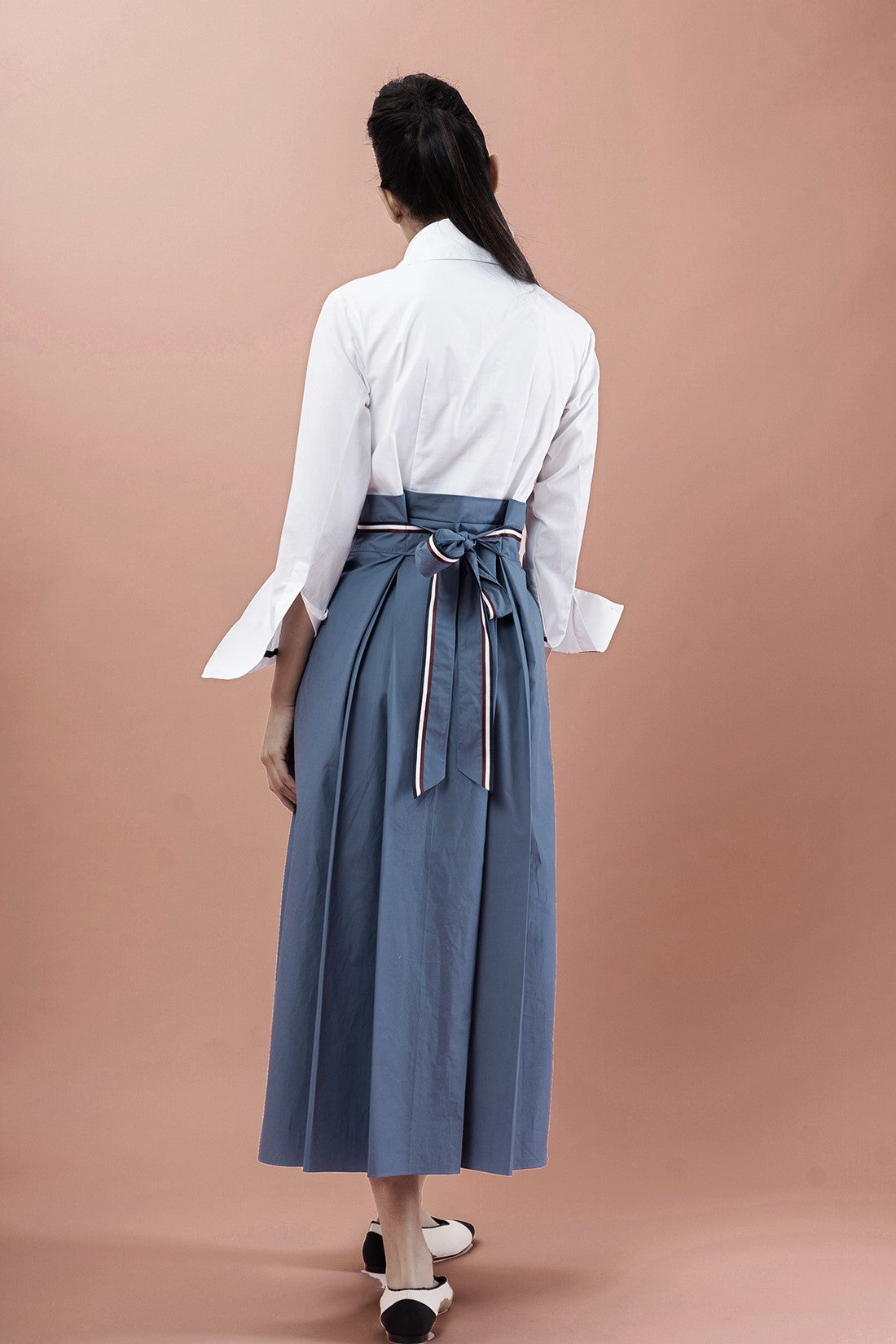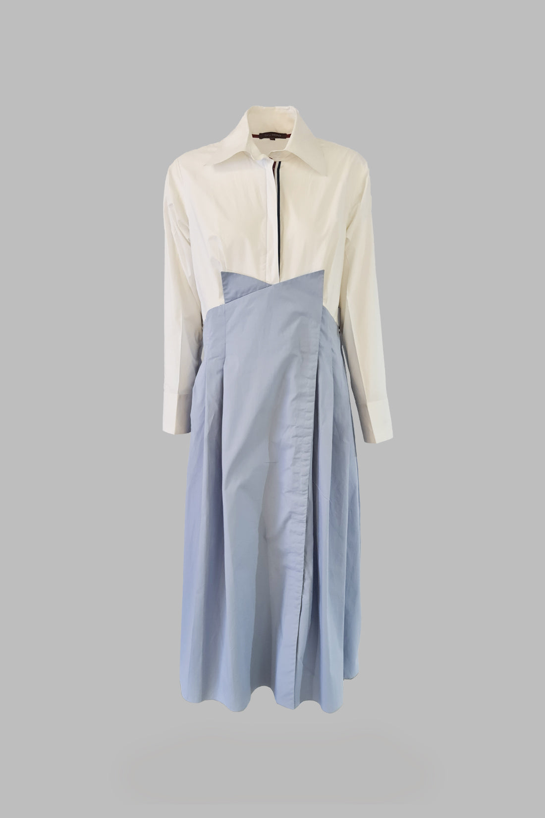 A long shirt dress with color-blocking and a sharp collar, Calypso is a statement in contrasts. Its overlapping design is an ode to layered perspectives.