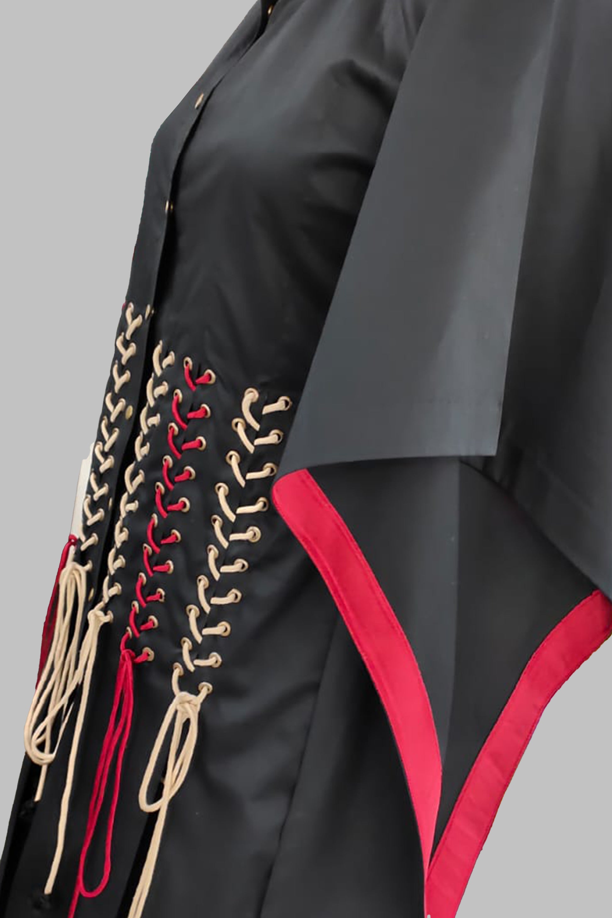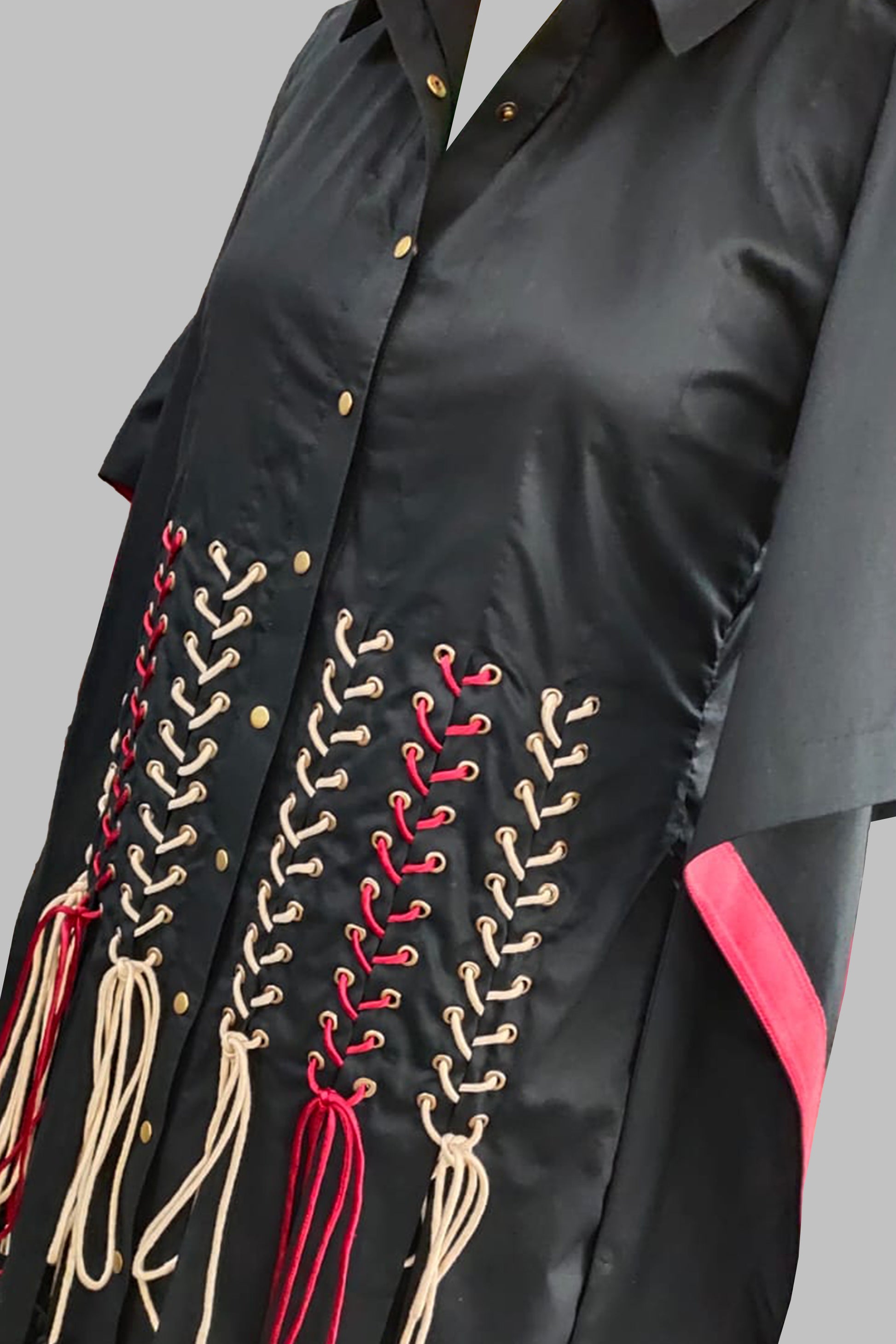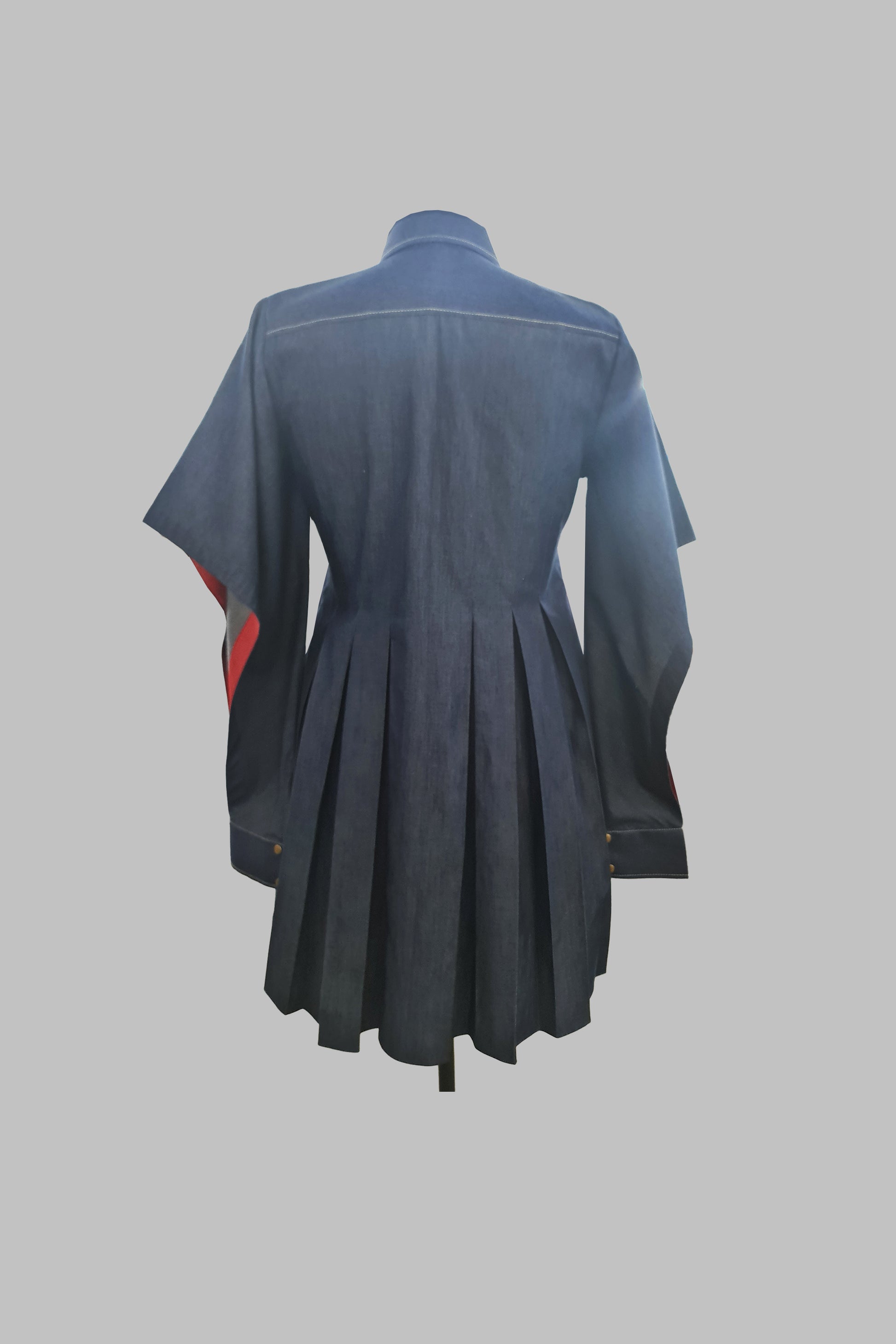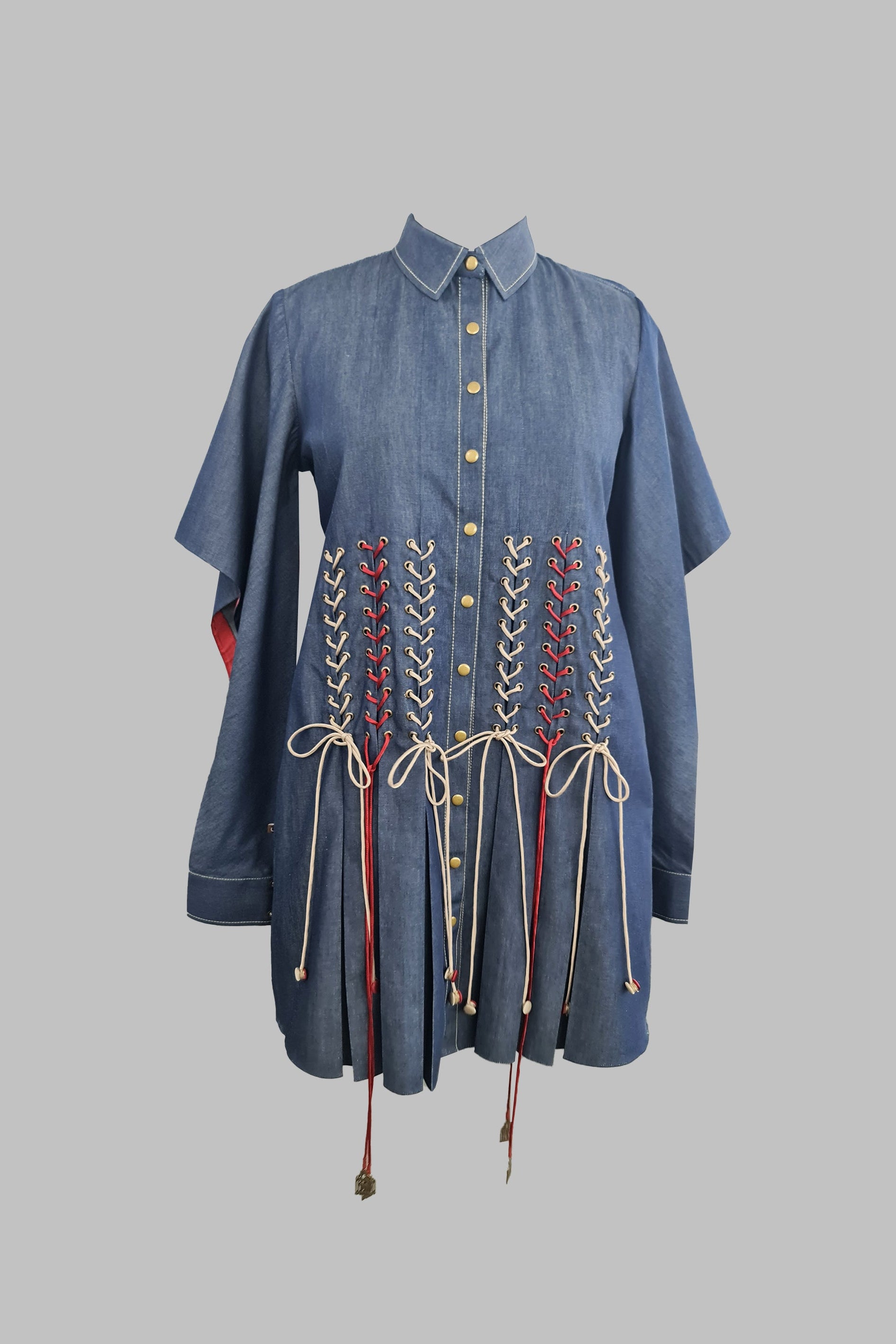 This shirtdress combines structure and style, featuring cut-out sleeves, box pleats reinforced with rivets, and tie lace details. It beautifully blends defiance and elegance, embodying a bold and unique aesthetic that breaks away from traditional norms. This garment celebrates individuality with a touch of rebelliousness, adding an edgy element to your look.