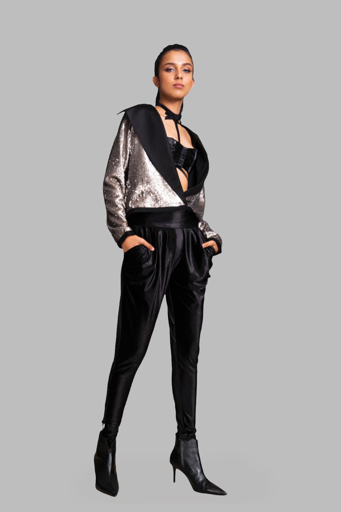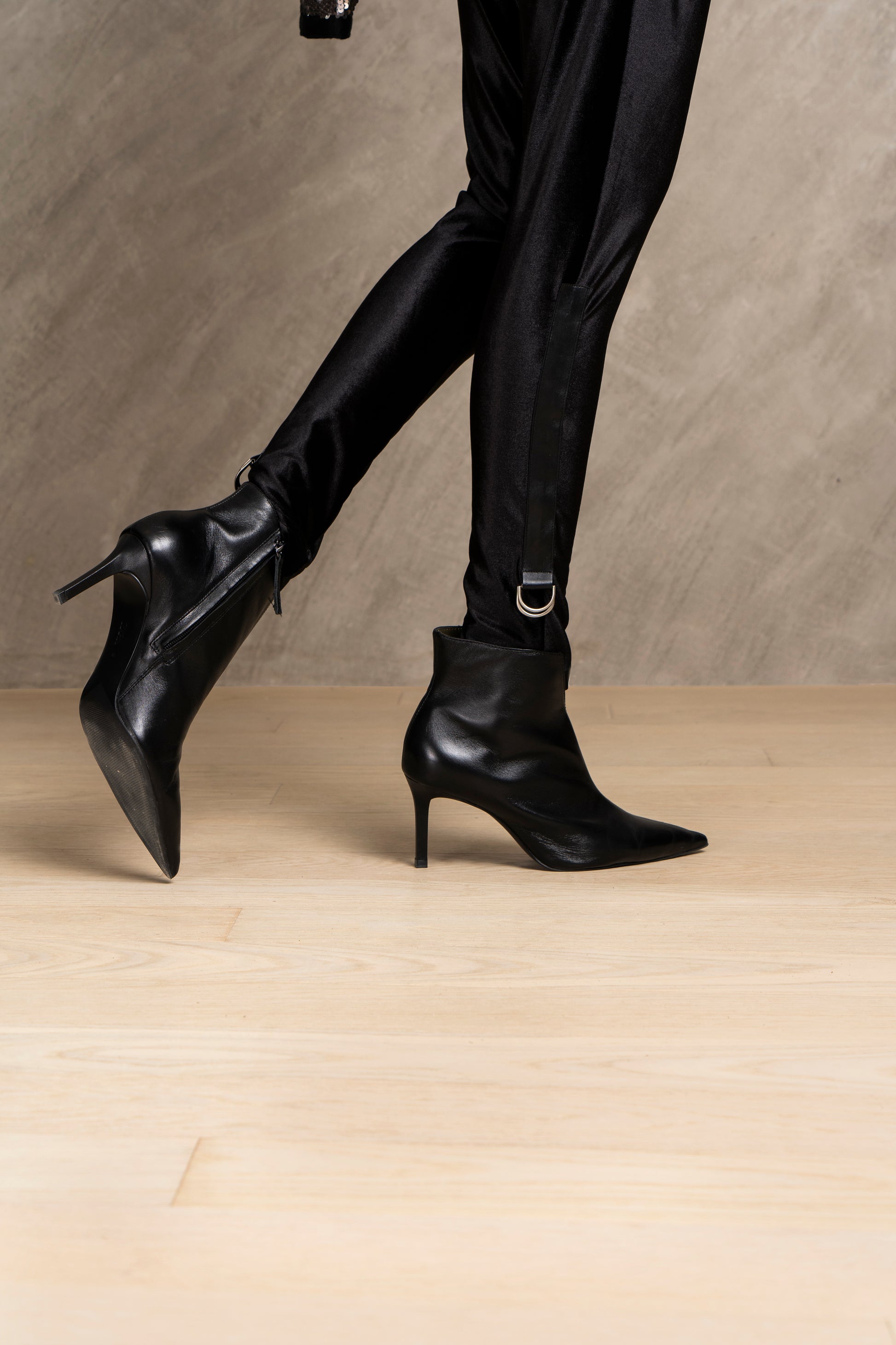 Super comfy yet glamourous tight pants featuring leather ribbon on side seams ending with metal loop details on the ankles and cowl pockets.