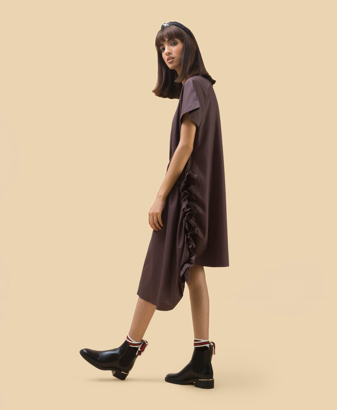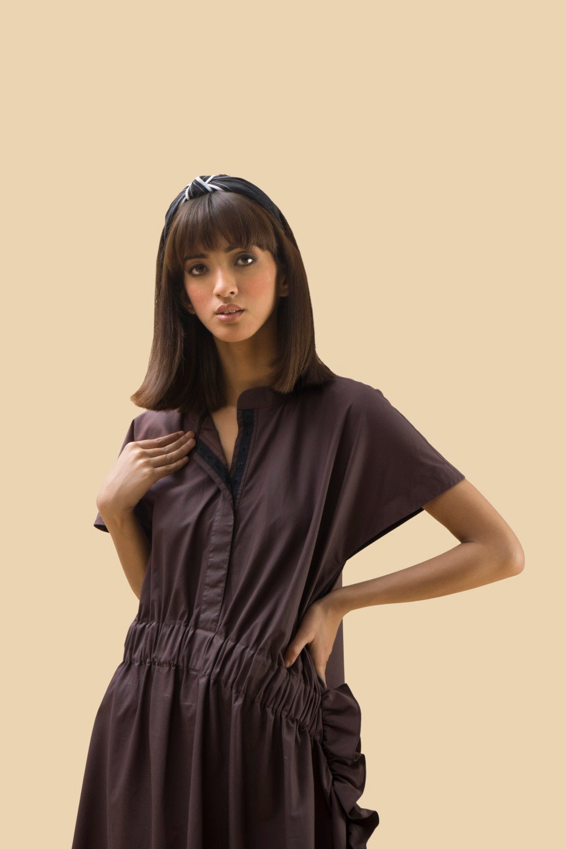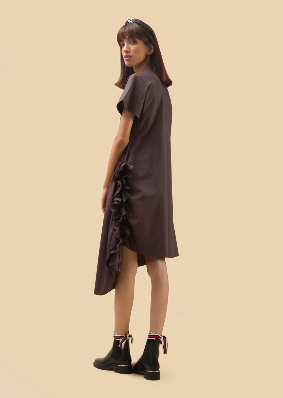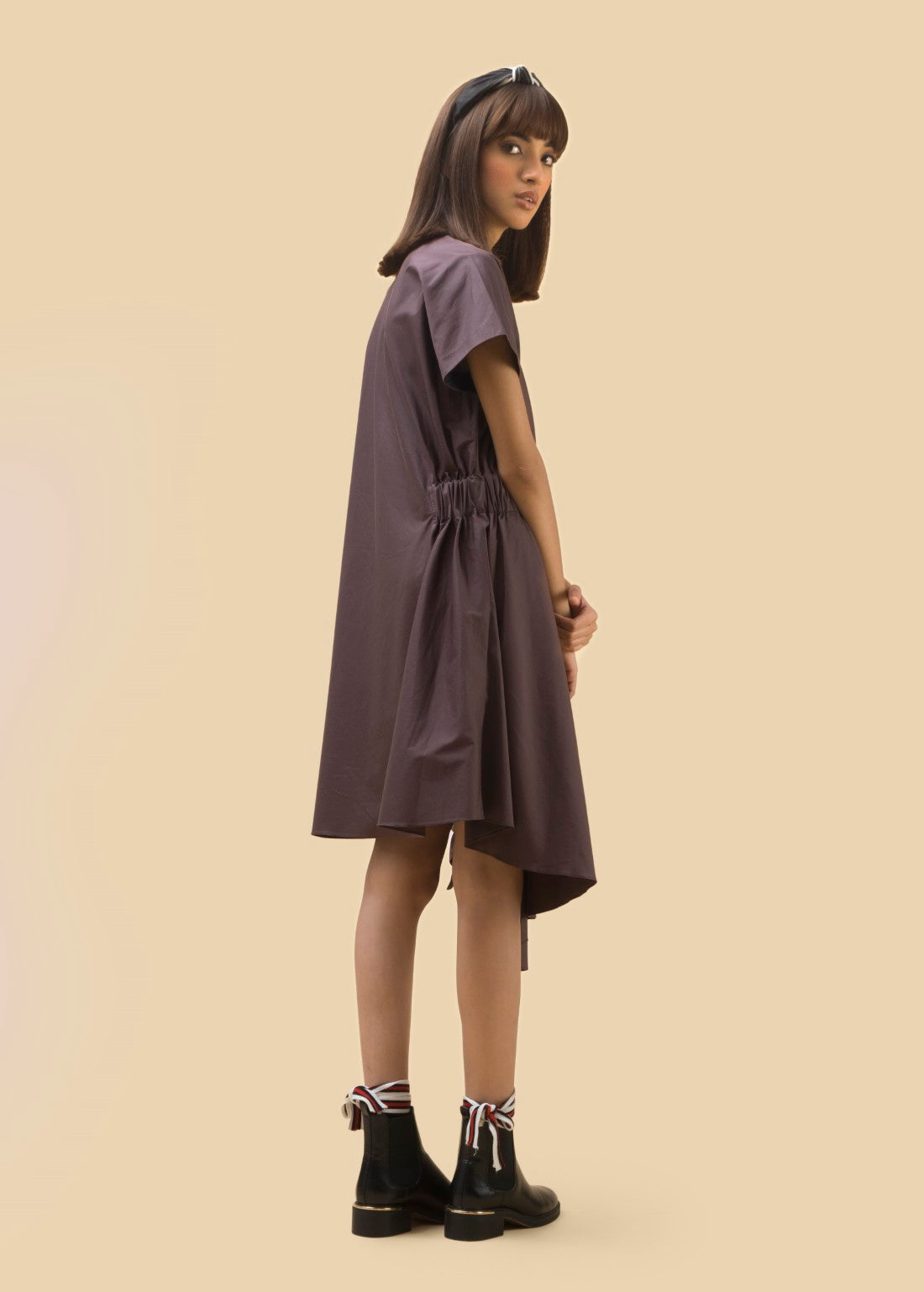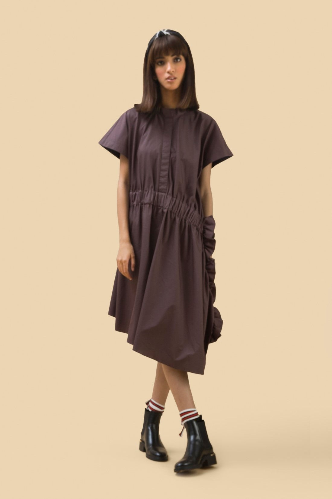 A midi length dress with exaggerated elasticated waistband flowing into fabric manipulation on the side and asymmetrical cut.