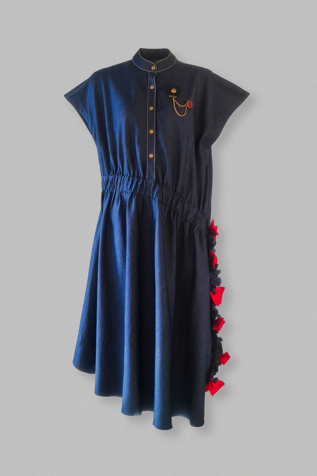 Paint the town red in this mid length dress with exaggerated fabric manipulation on the side highlighted with red bows.