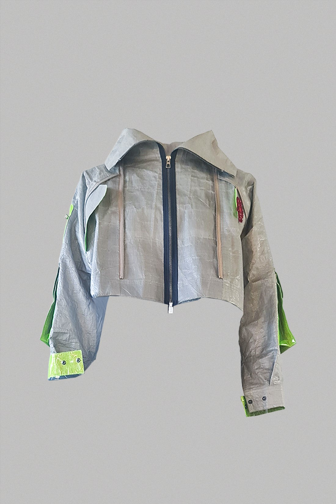 Our Freddie Jacket in Tarpaulin fabric and Neon PVC, inspired by Coldplay, is the ultimate statement piece. It features a long silver front zipper, a bold neon star patch on the back, an inspirational quotation embroidered on the collar, and a lip glitter patch for an added pop of personality.