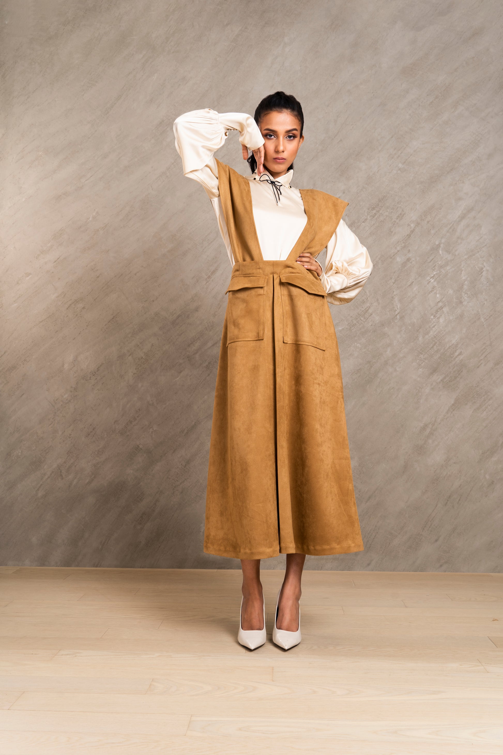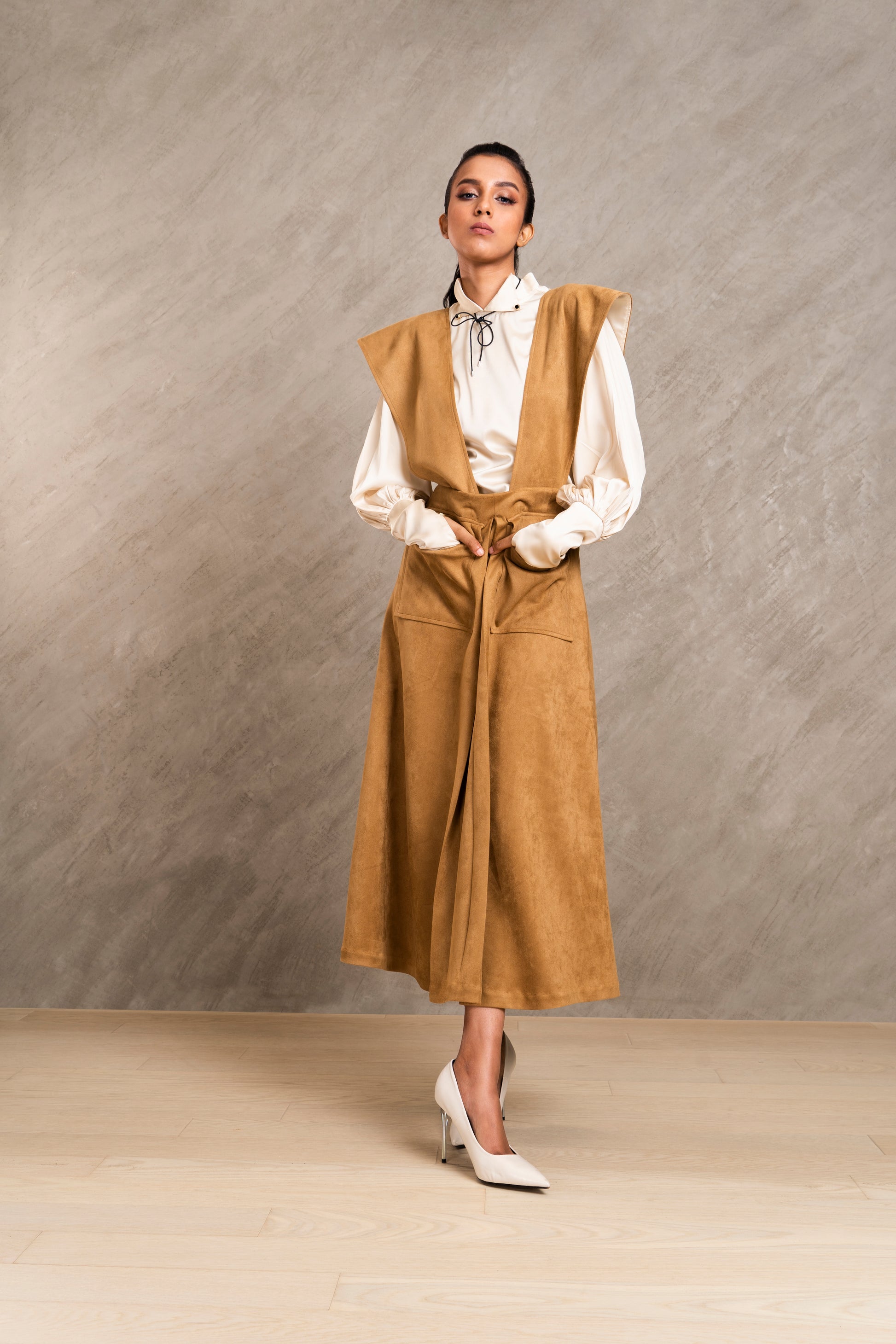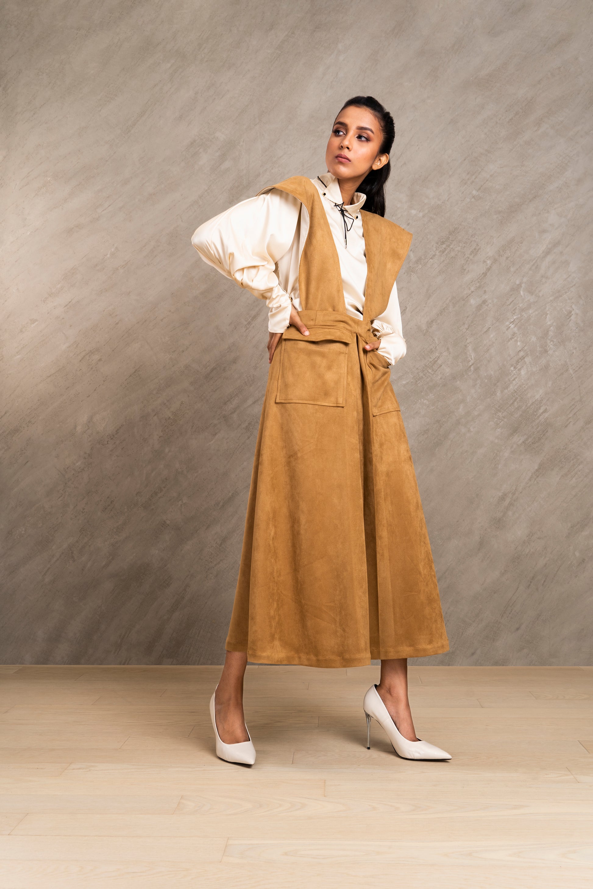 Rock in our super soft tan suede skirt dress with detachable wide shoulder straps and big comfortable front pockets. Stay ahead of the trends by pairing this texture with Liz Satin Shirt