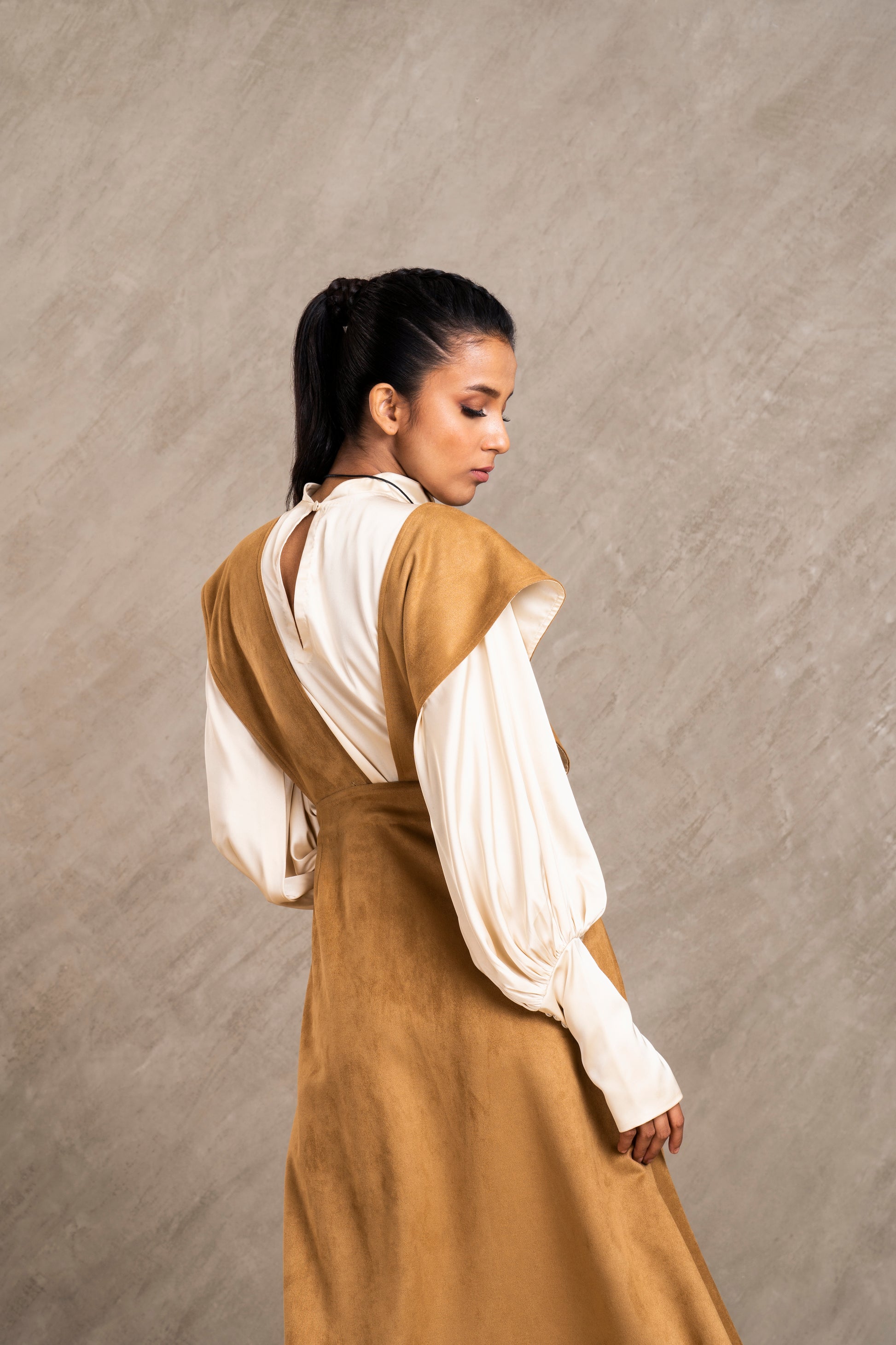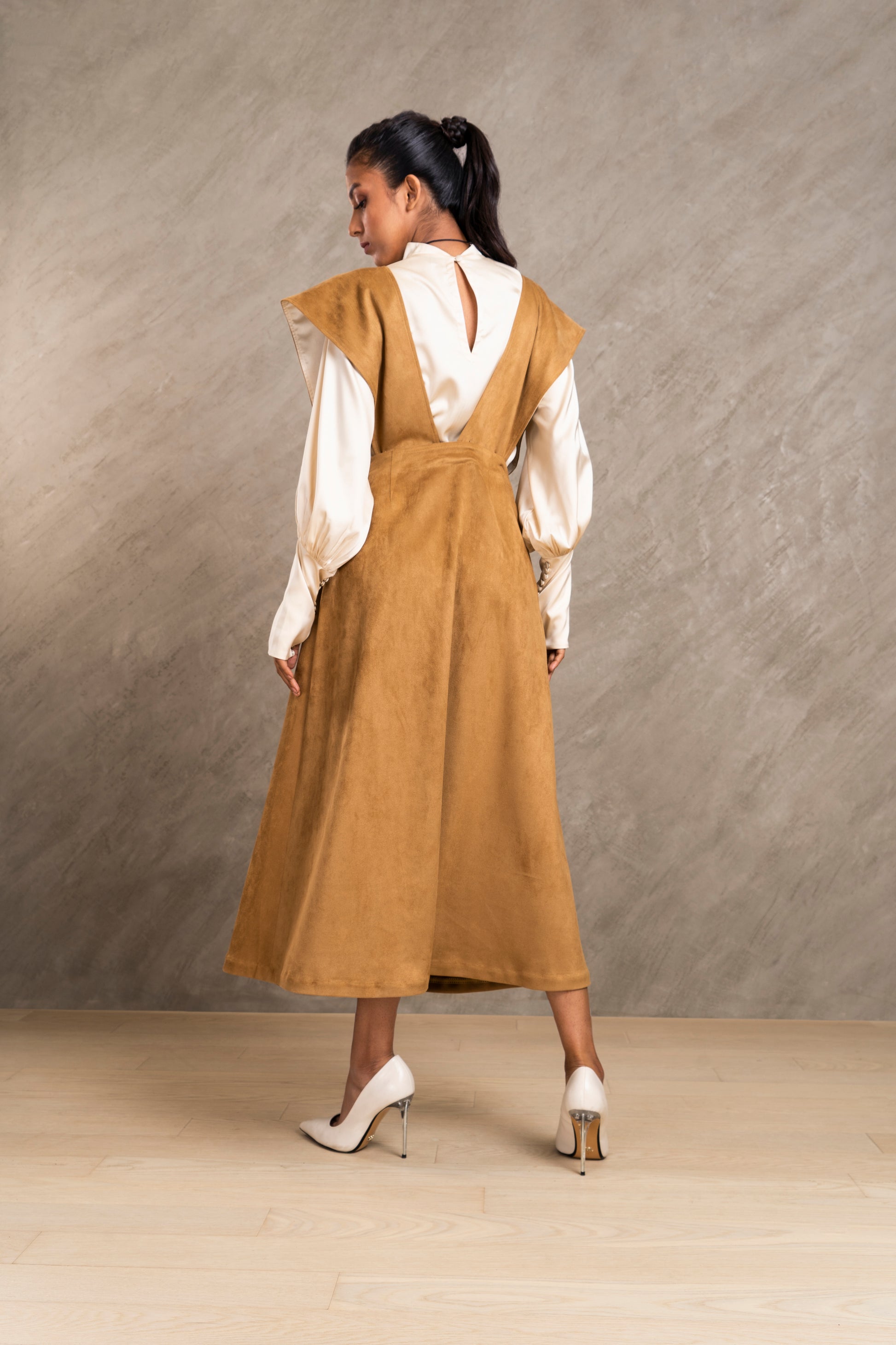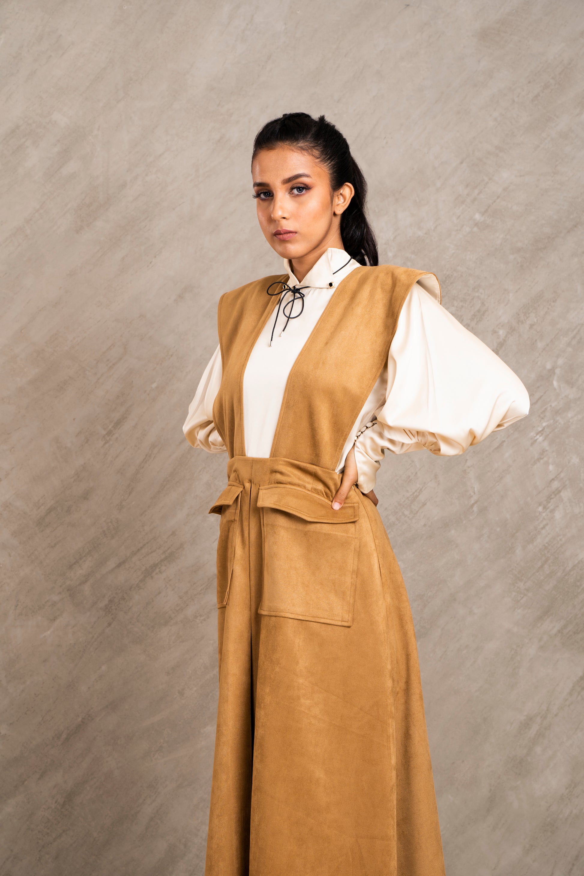 Rock in our super soft tan suede skirt dress with detachable wide shoulder straps and big comfortable front pockets. Stay ahead of the trends by pairing this texture with Liz Satin Shirt