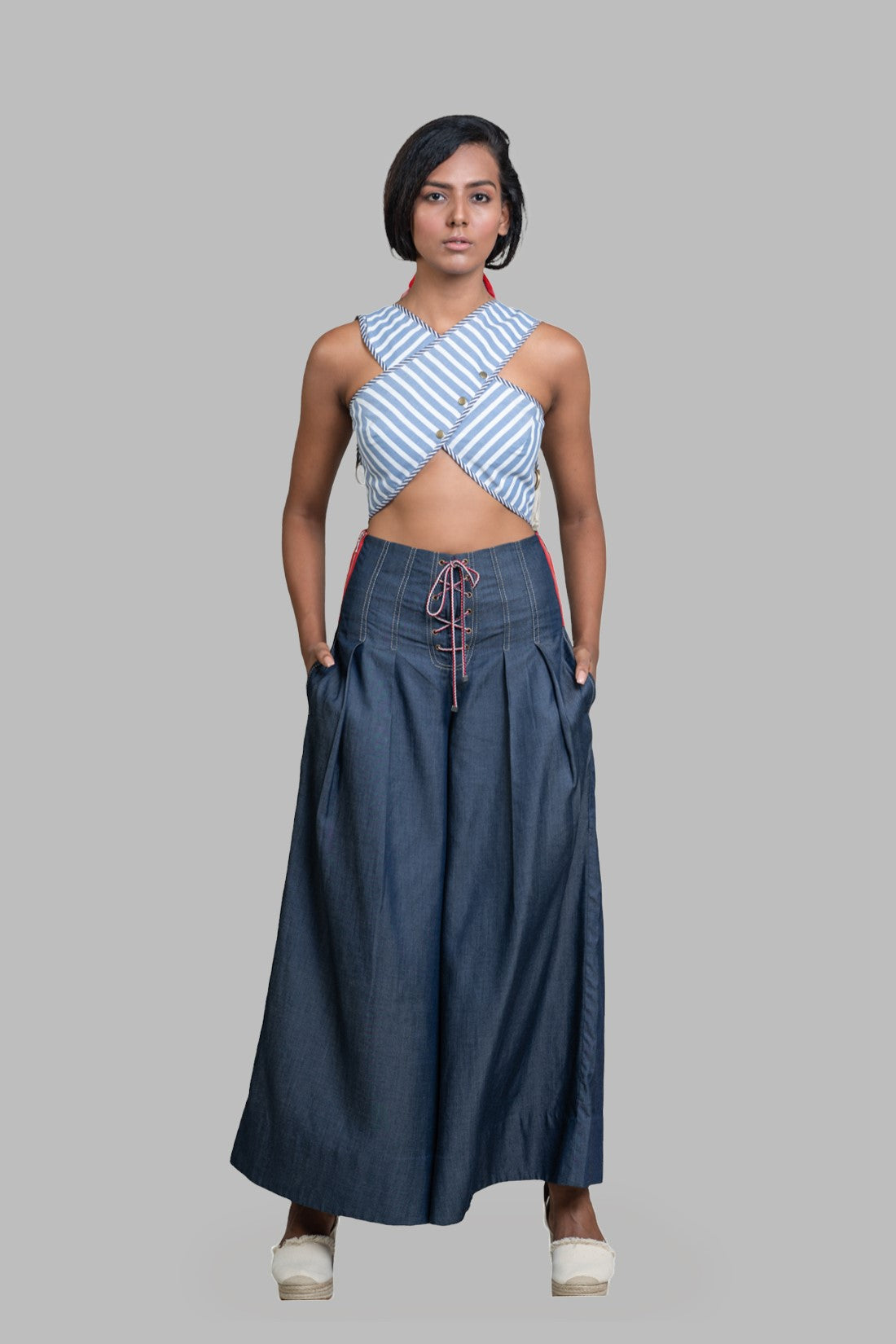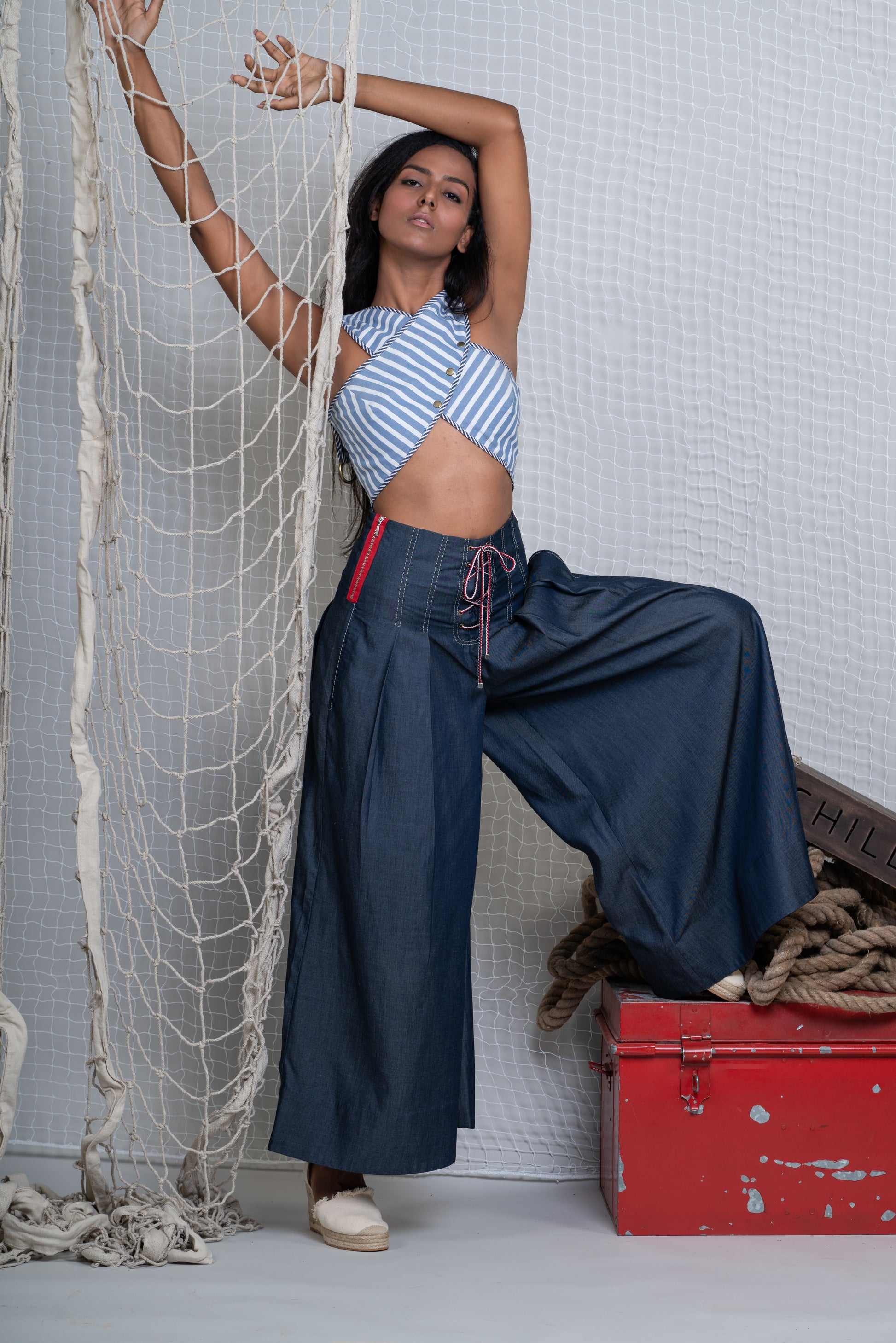 High waisted flared pants with tie front details and pleats, red metal zipper on both sides with pockets