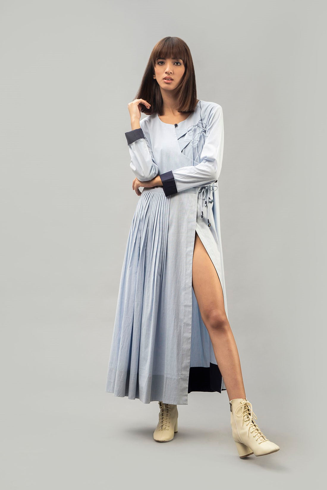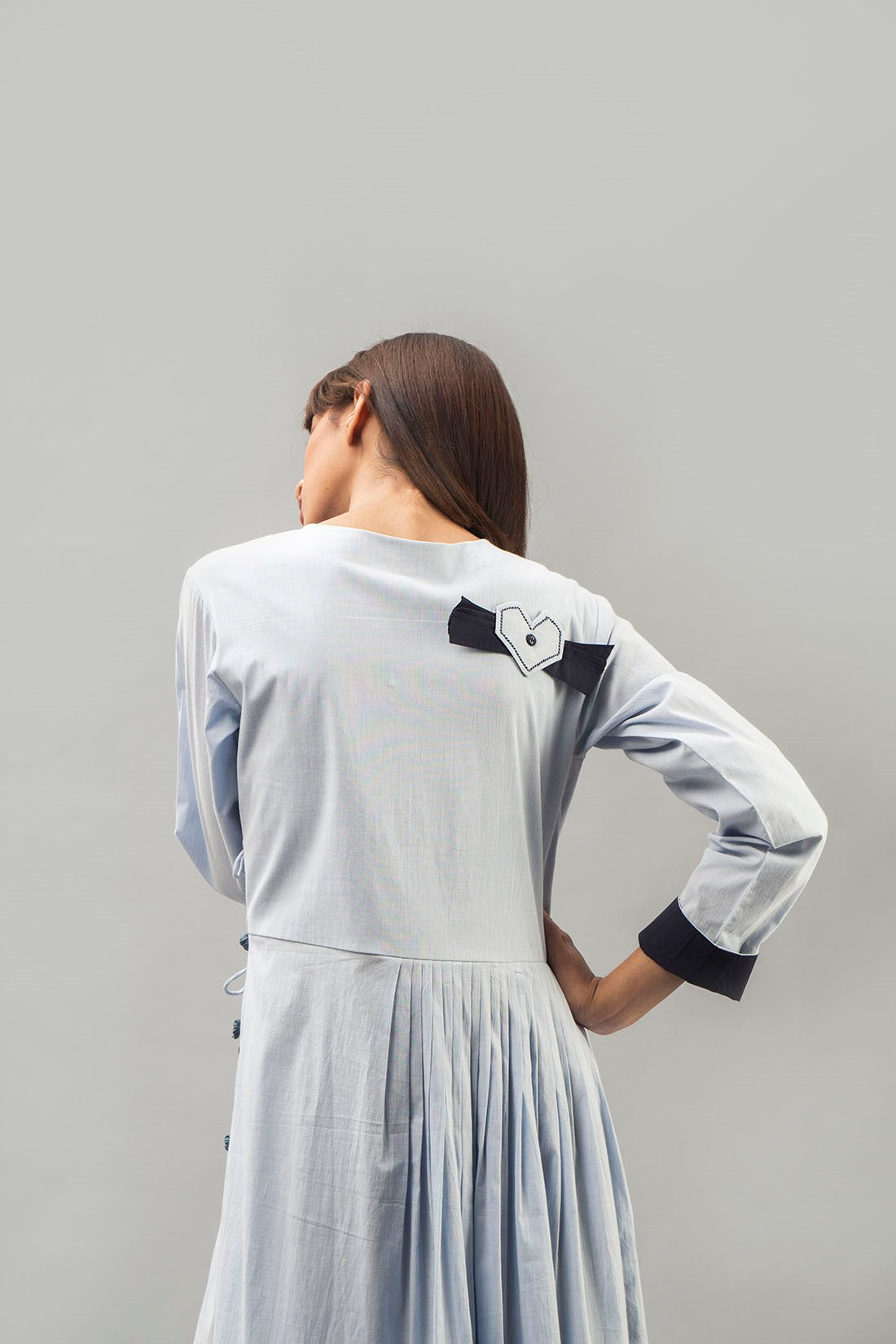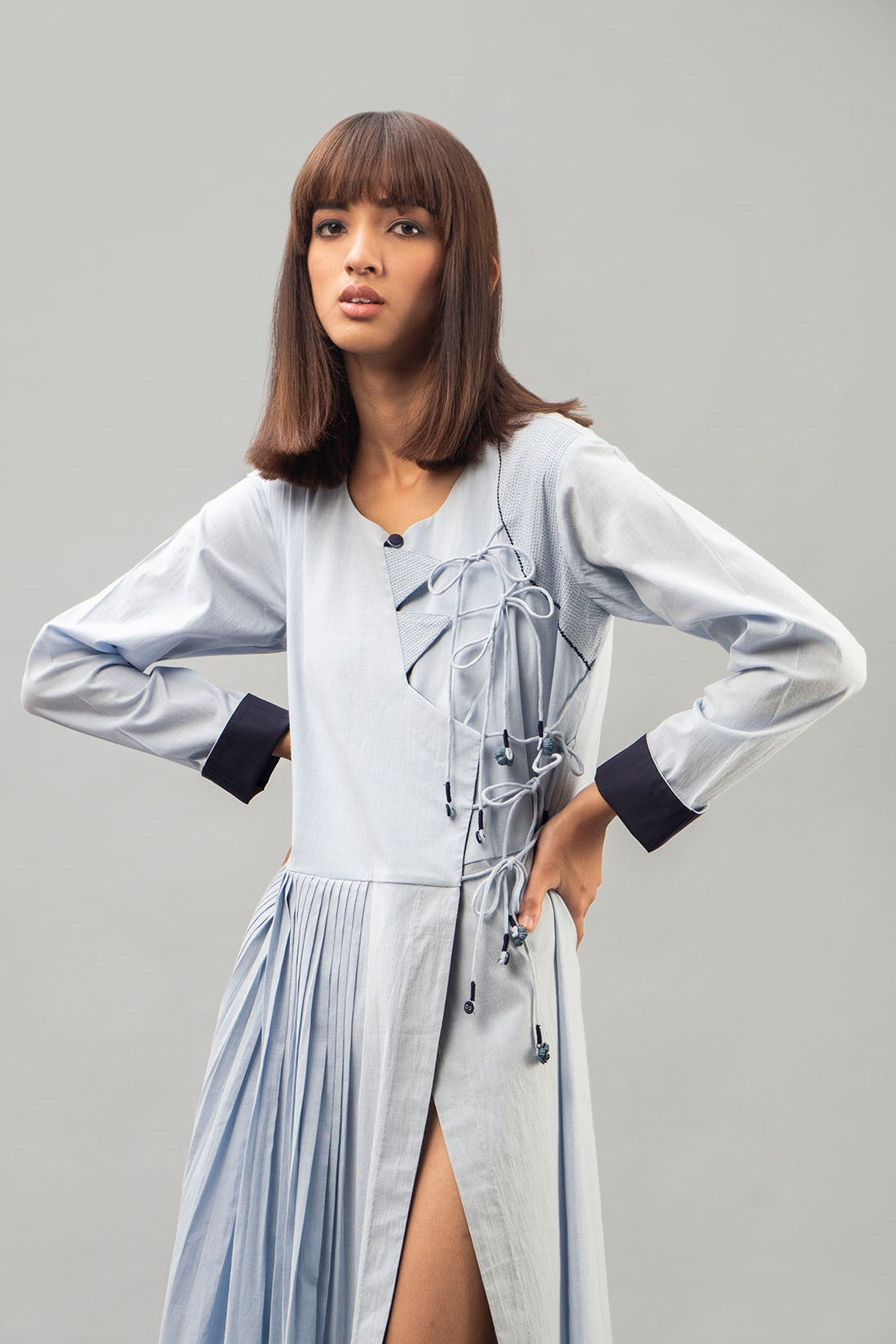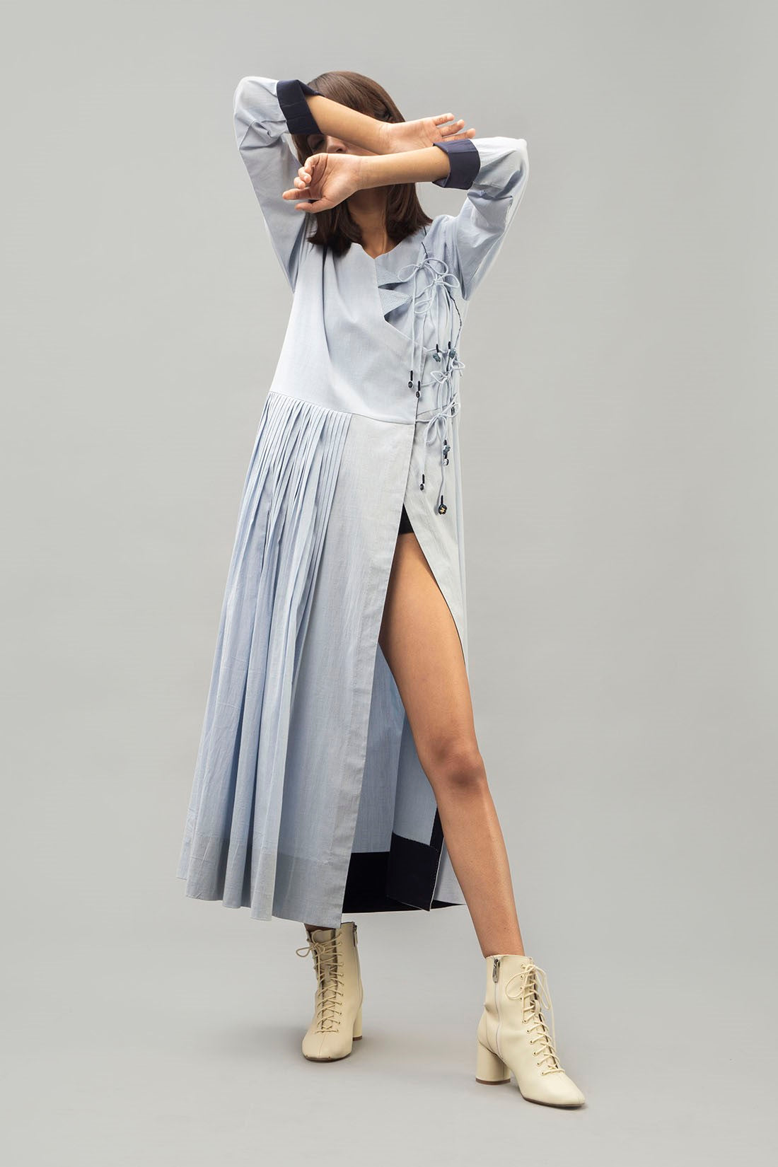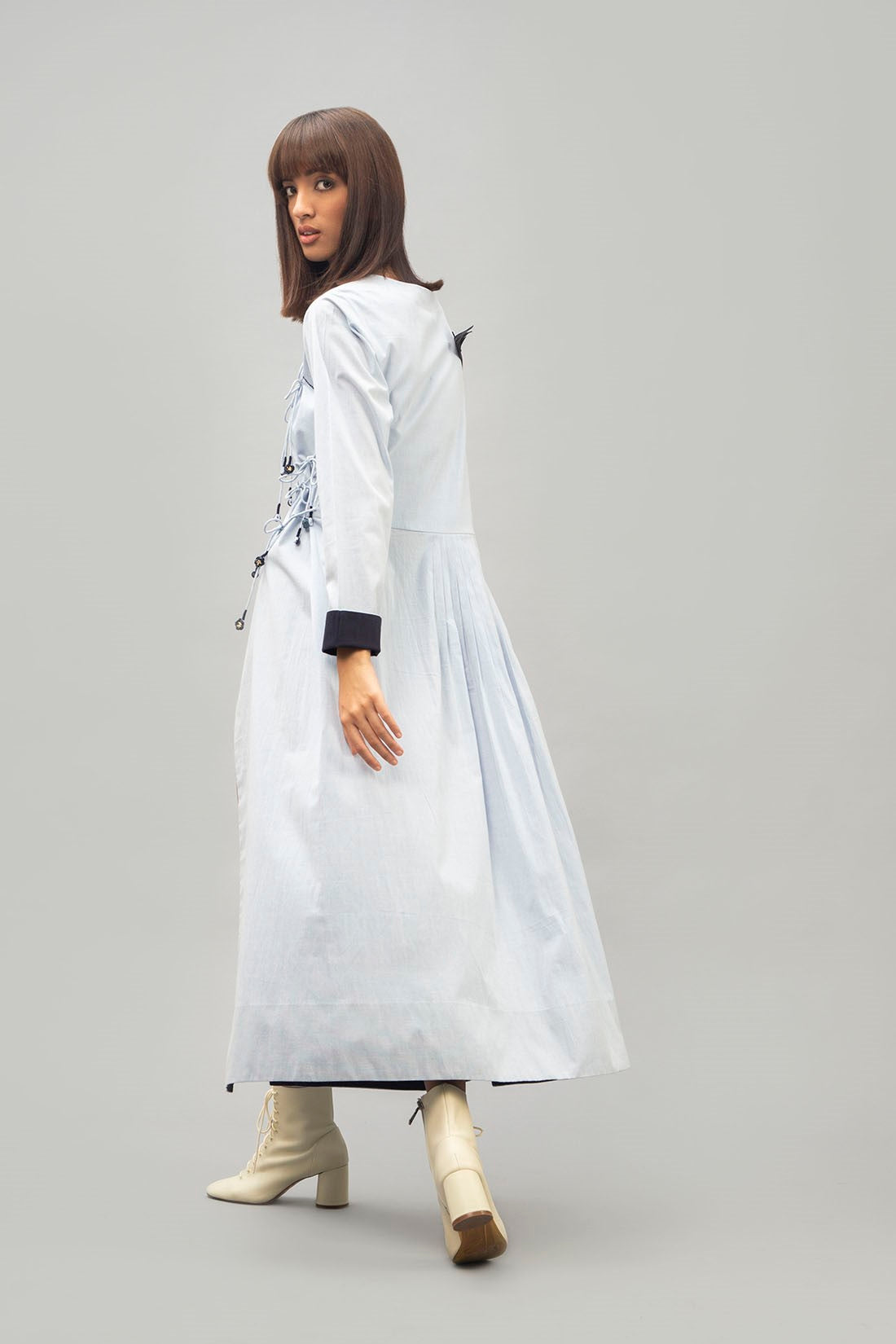 Long dress with pleats from the waistline that features cord tie zigzag details on the front and handmade fabric details at the back
