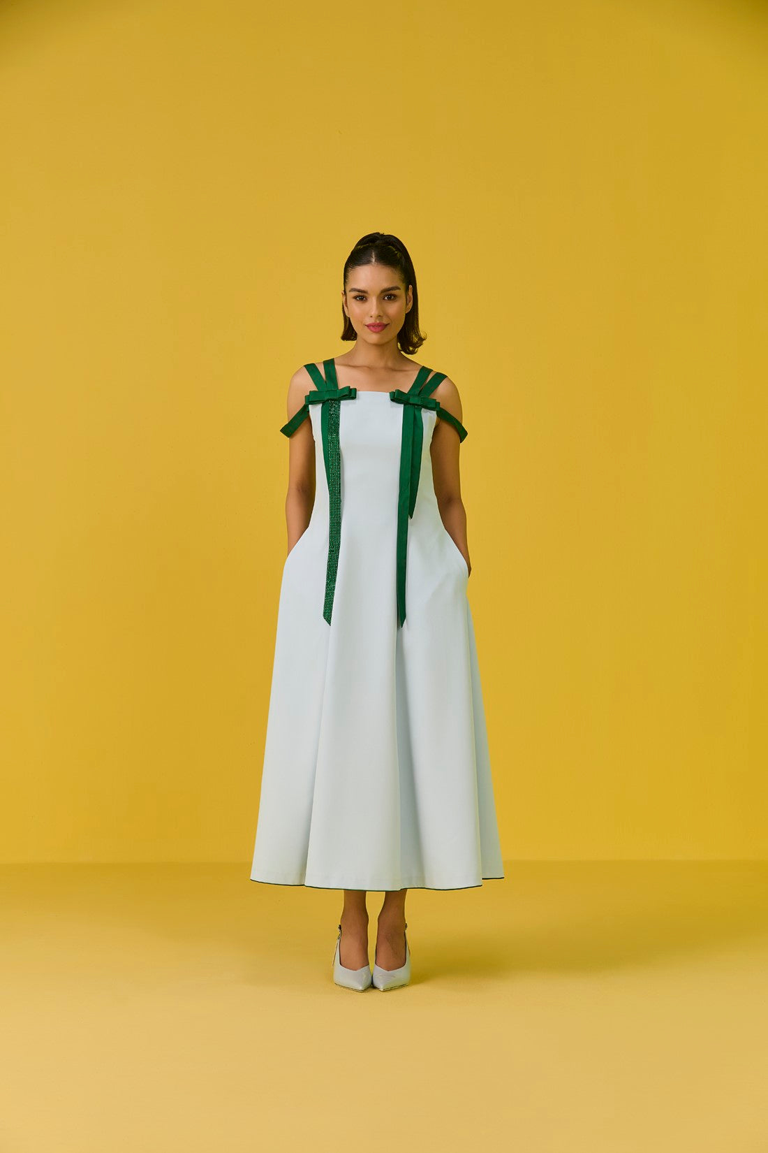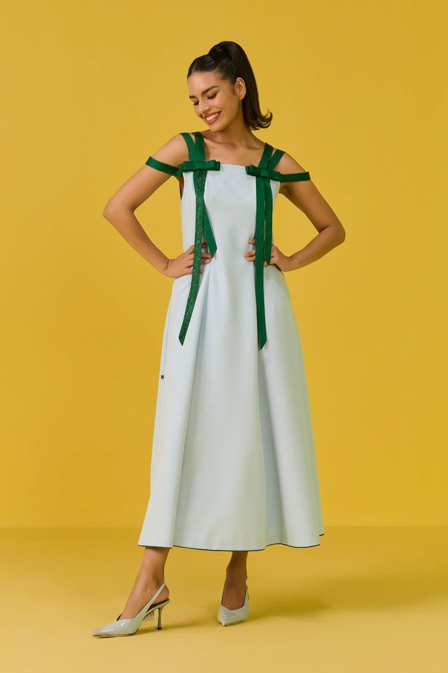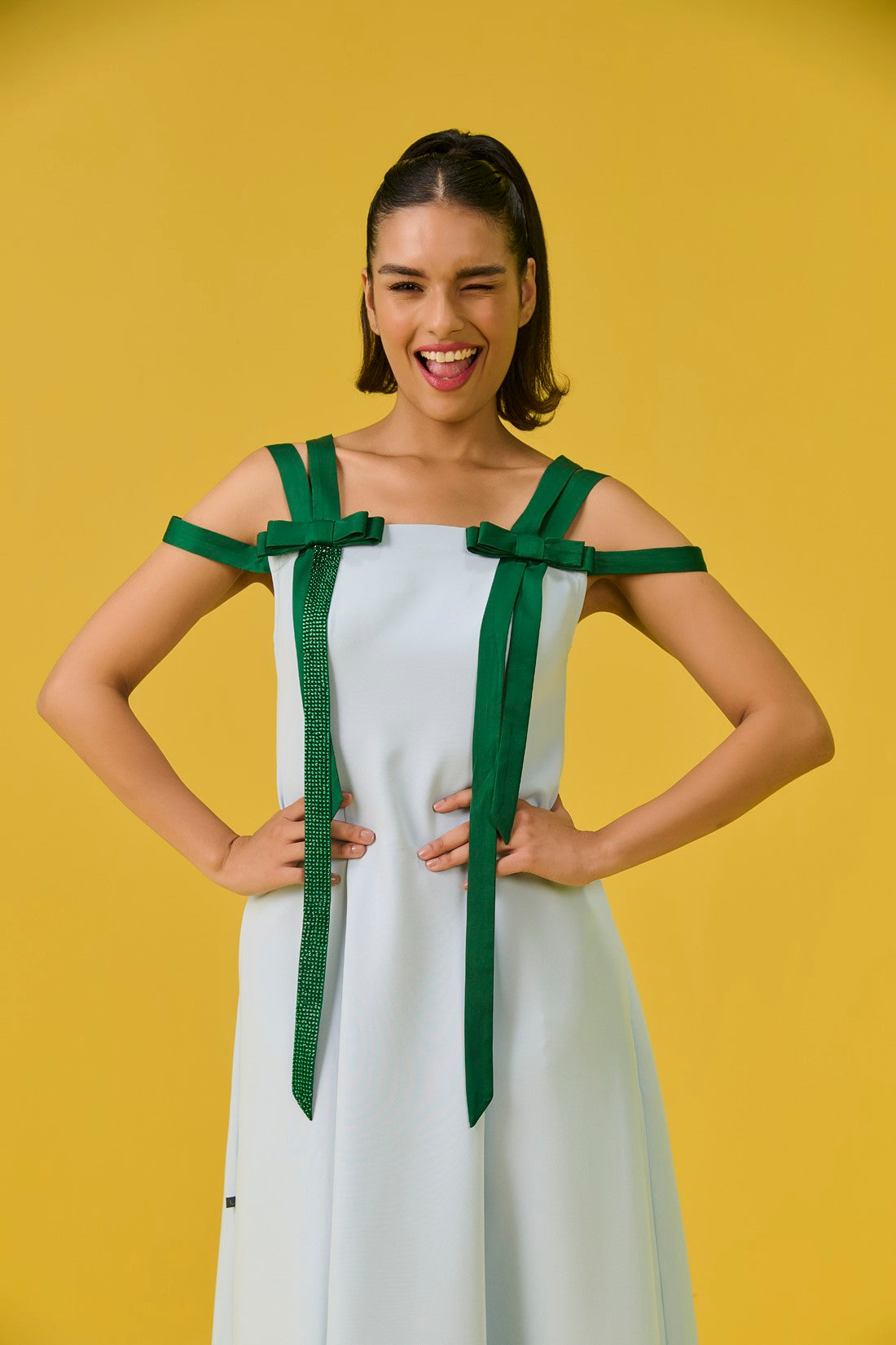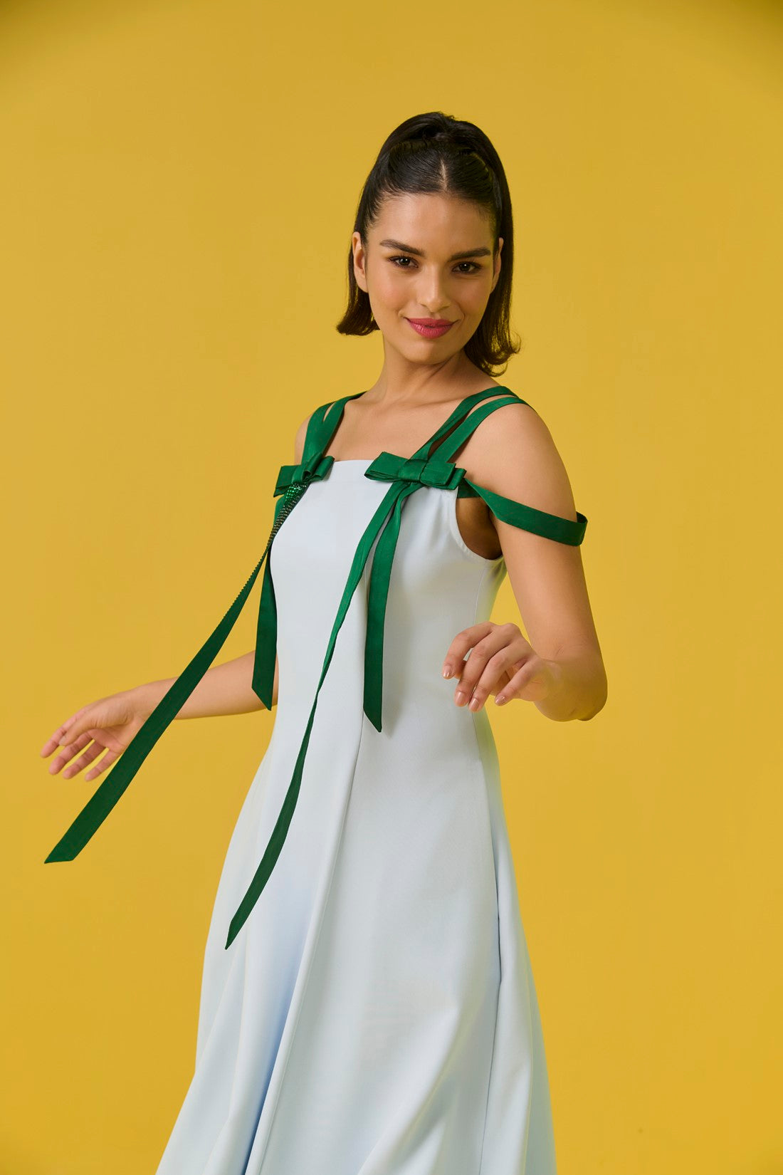 Turn heads in this stunning long flowing dress. The dress features multiple shoulder straps in contrast colour, tucked together with delicate bows. Sparkling rhinestones are artfully placed to catch the light and enhance the dress’ sophisticated allure. Perfect for proms, evening events or formal occasions, this dress offers a timeless glamour with contemporary twist.