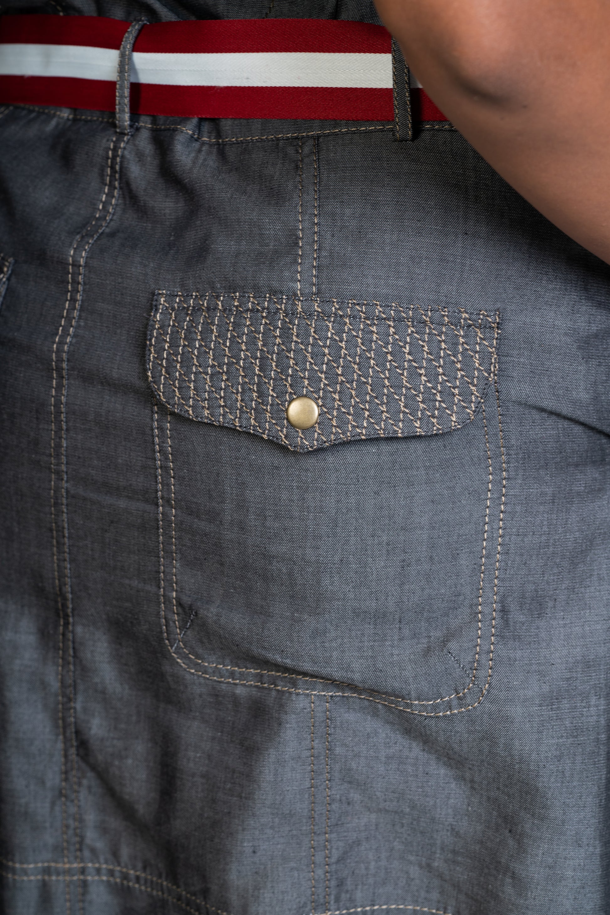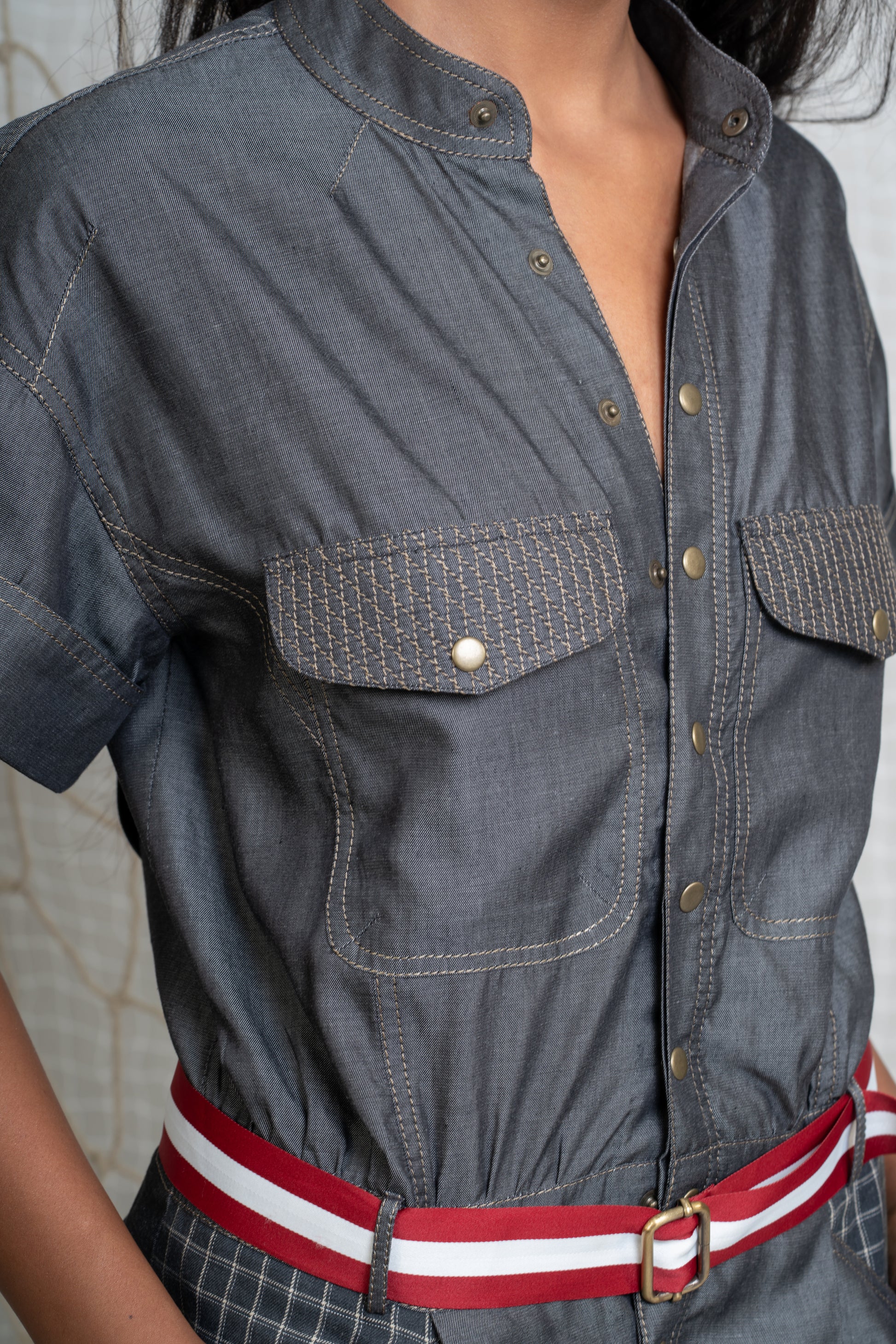 Slim fit denim shirtdress with double layered red stripes adjustable belt. This edgy casual dress has metal snap buttons and patch pockets with flaps and double stitch details.