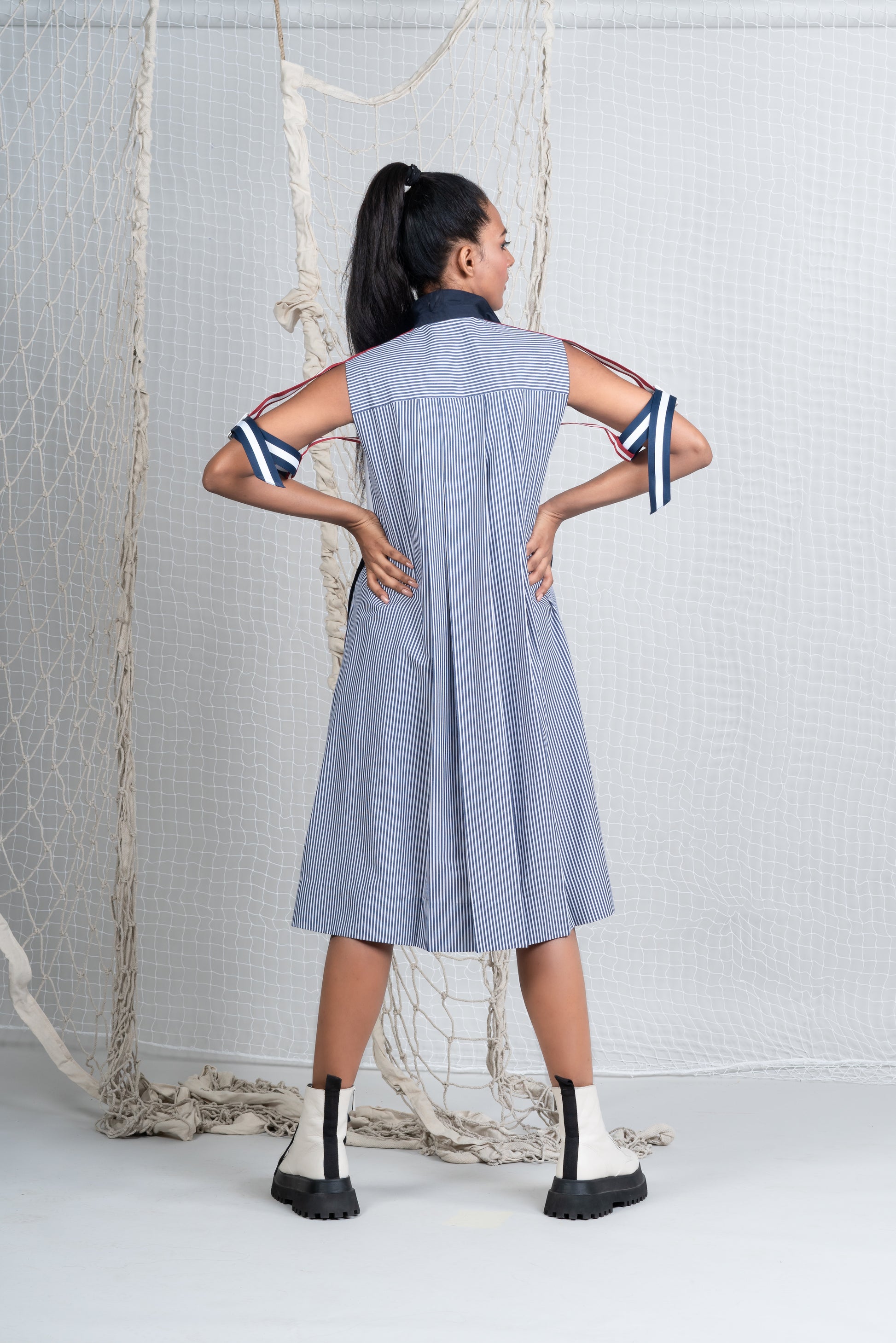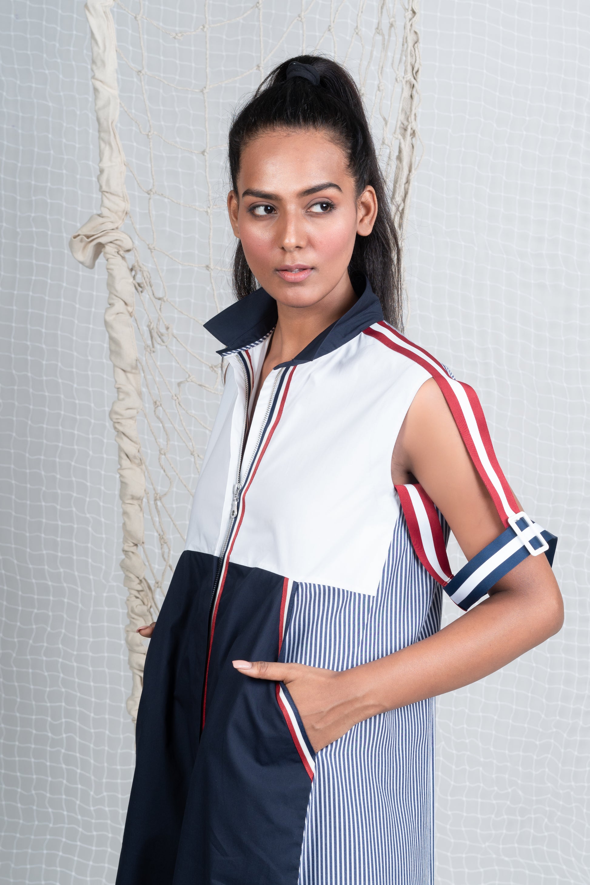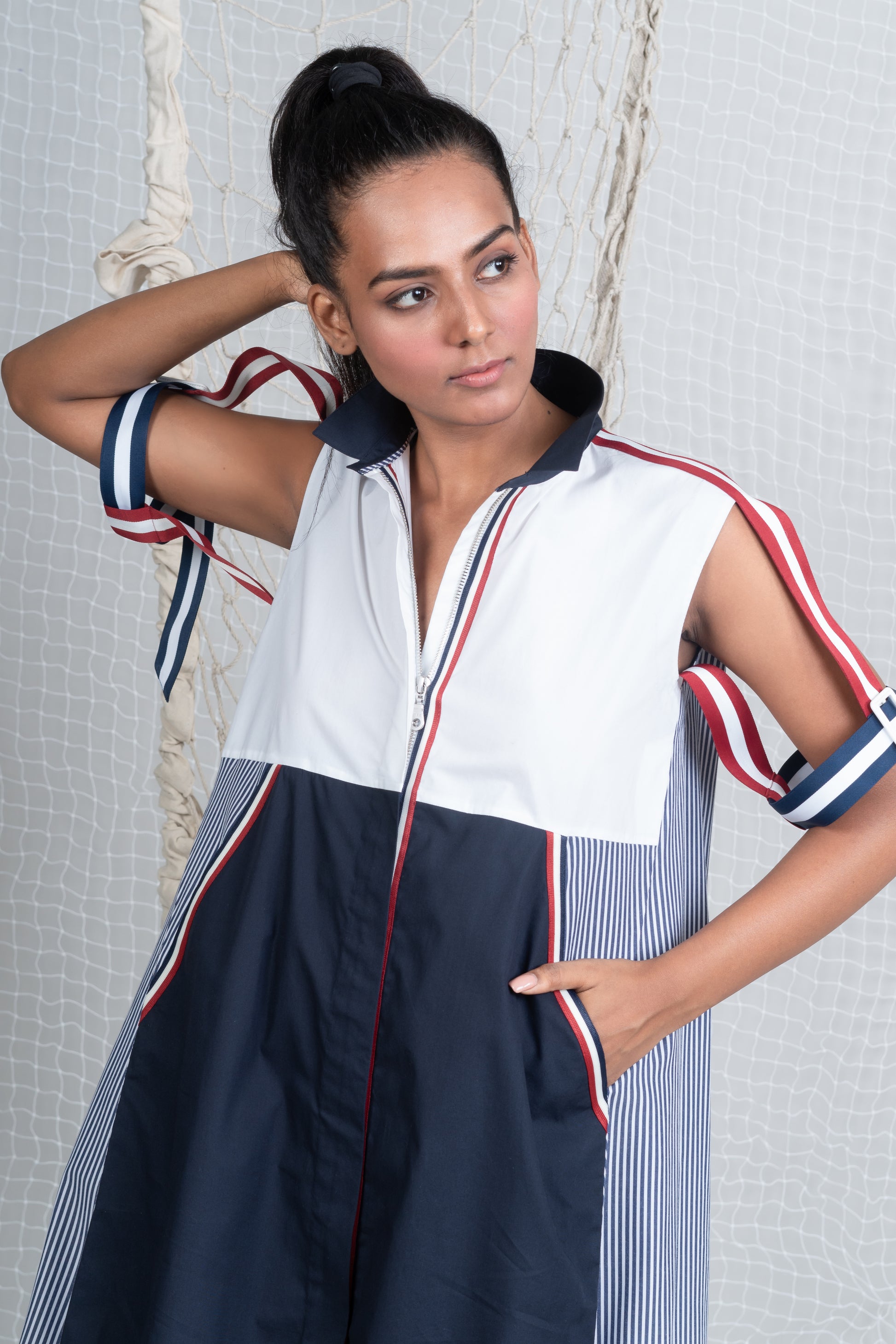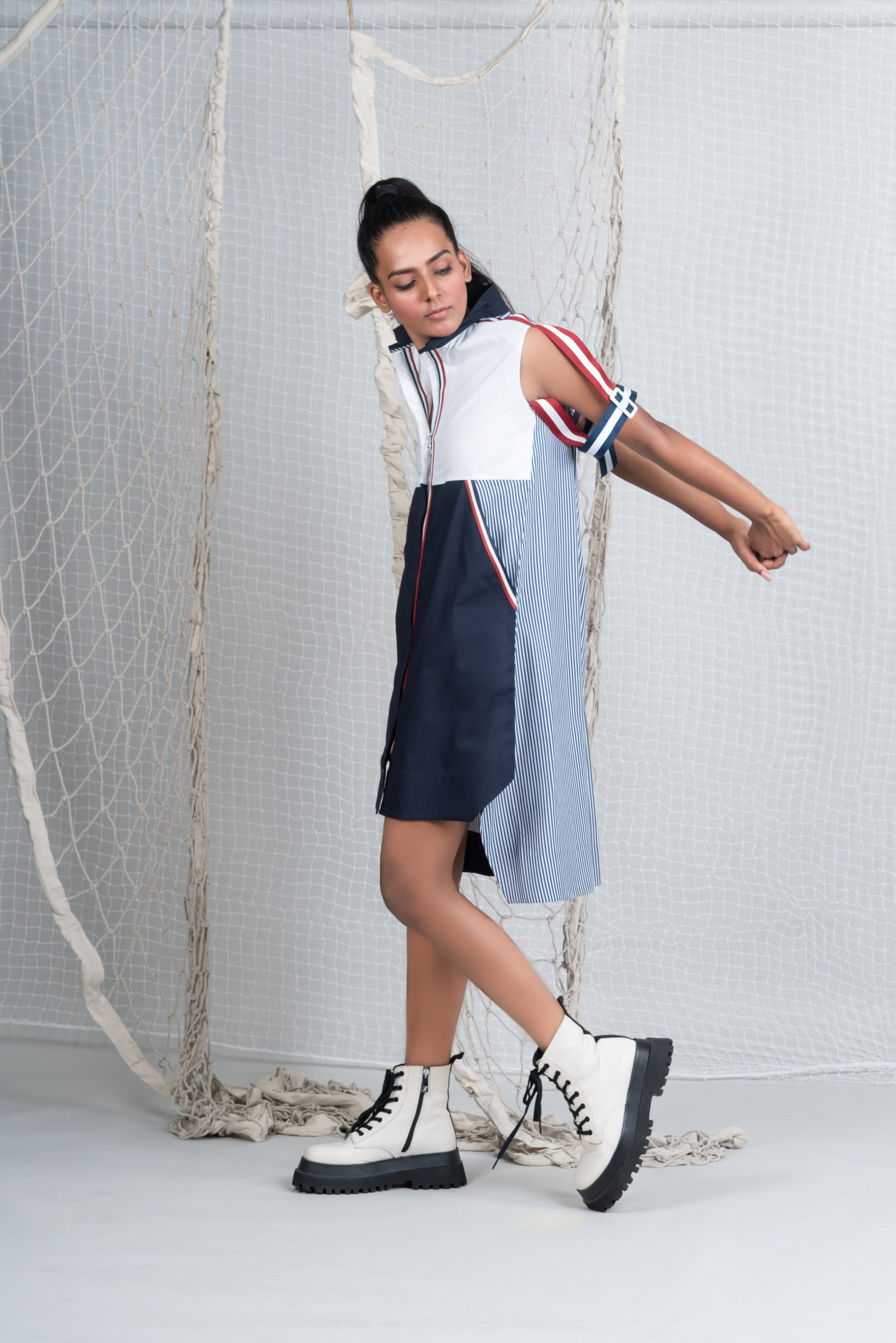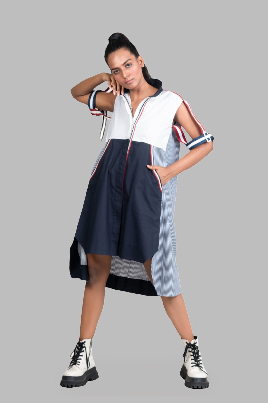 Colorblocked hanky hem zipper dress with a kangaroo pocket design & cutout belted sleeves with white buckles