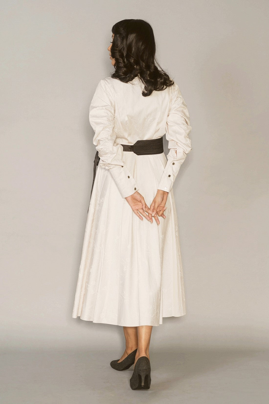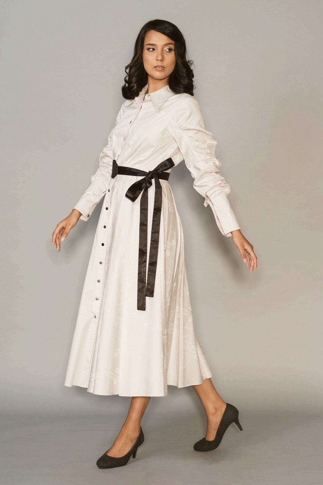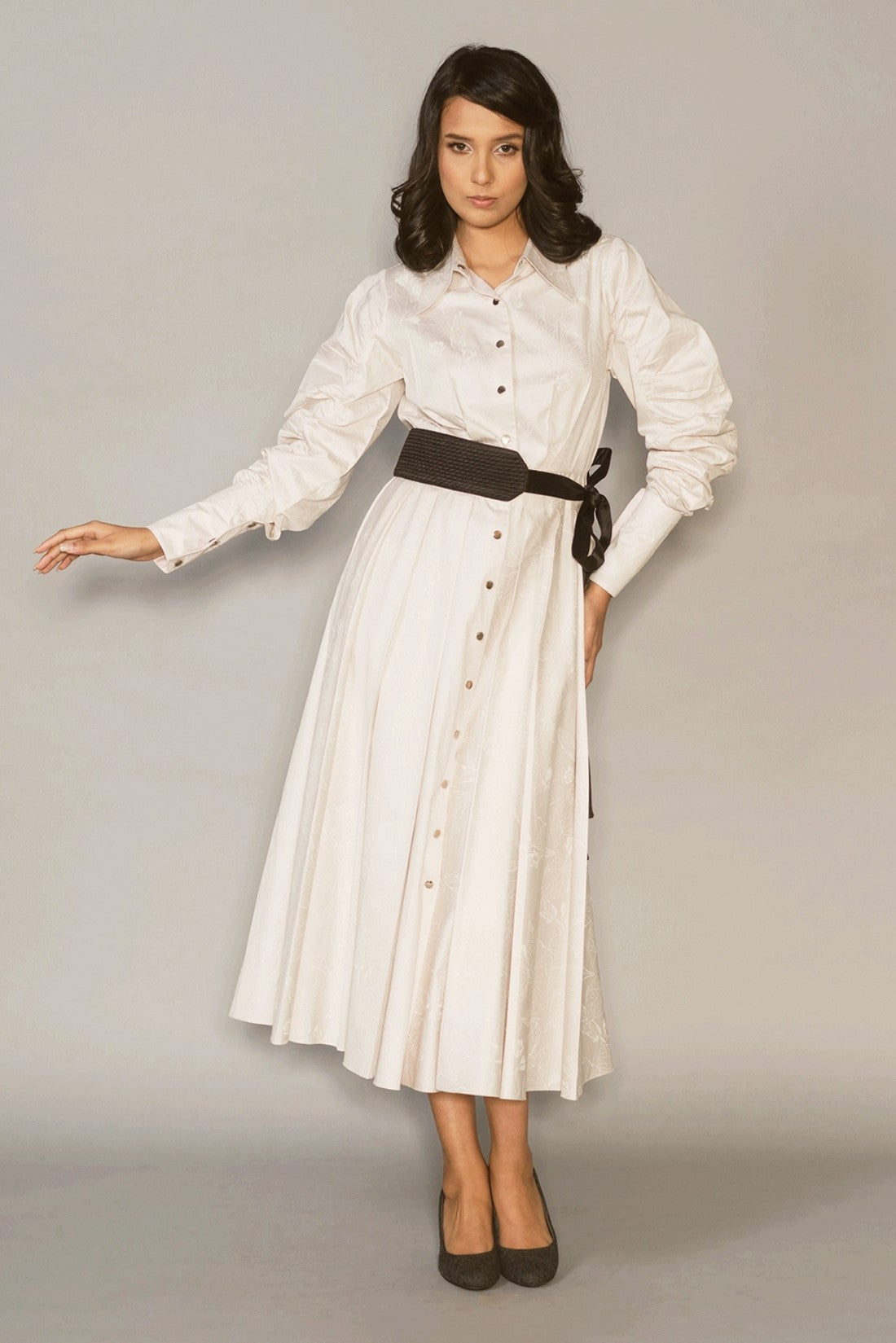 This long shirtdress exudes sophistication and style, radiating intelligence. The textured belt accentuates the waistline for a flattering silhouette. The ruched sleeves add modernity and attention to detail, making it a smart and chic choice.