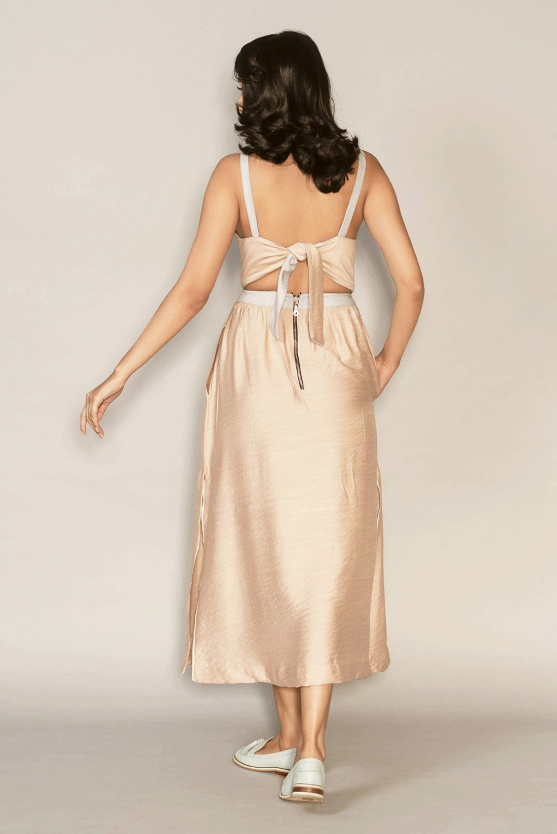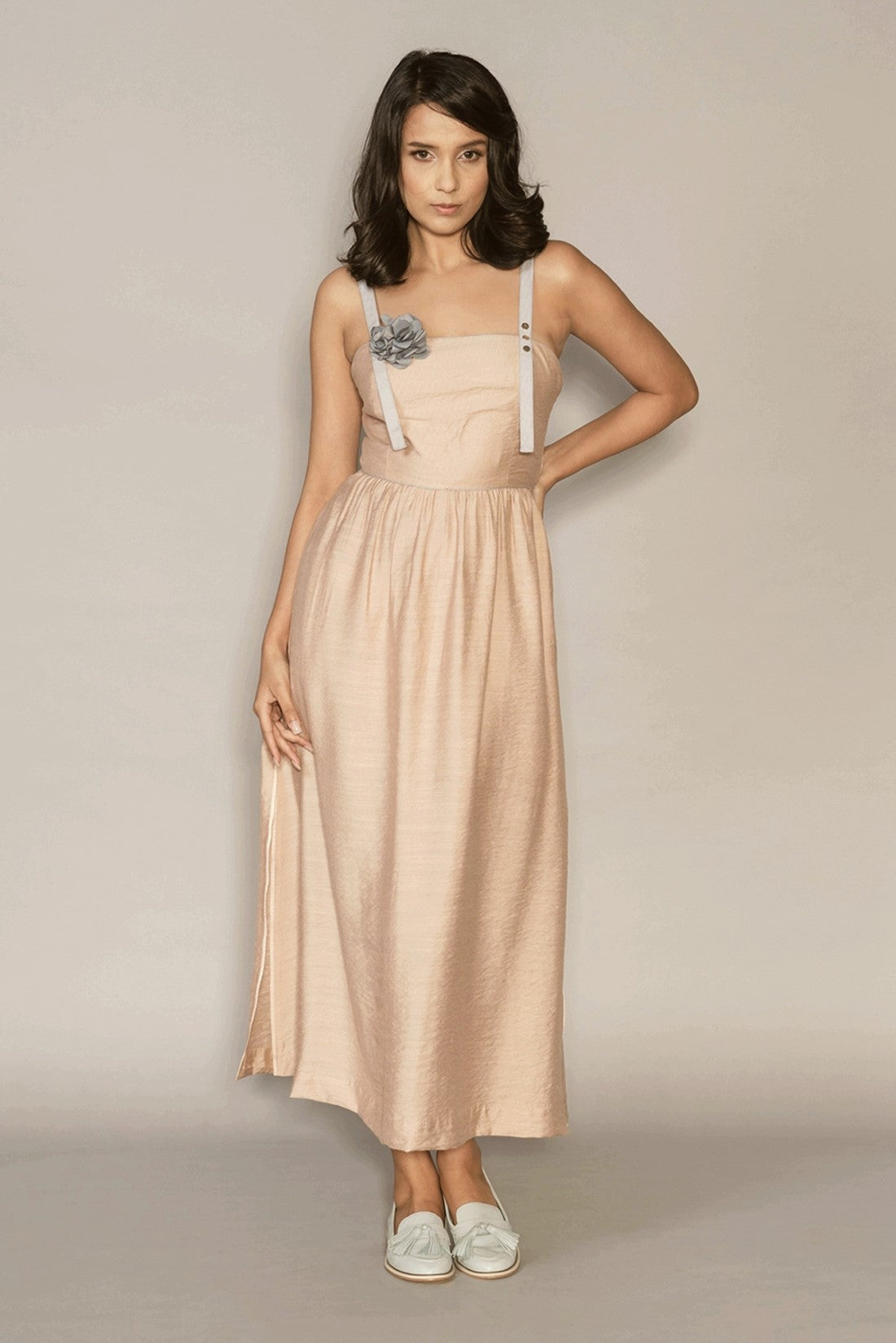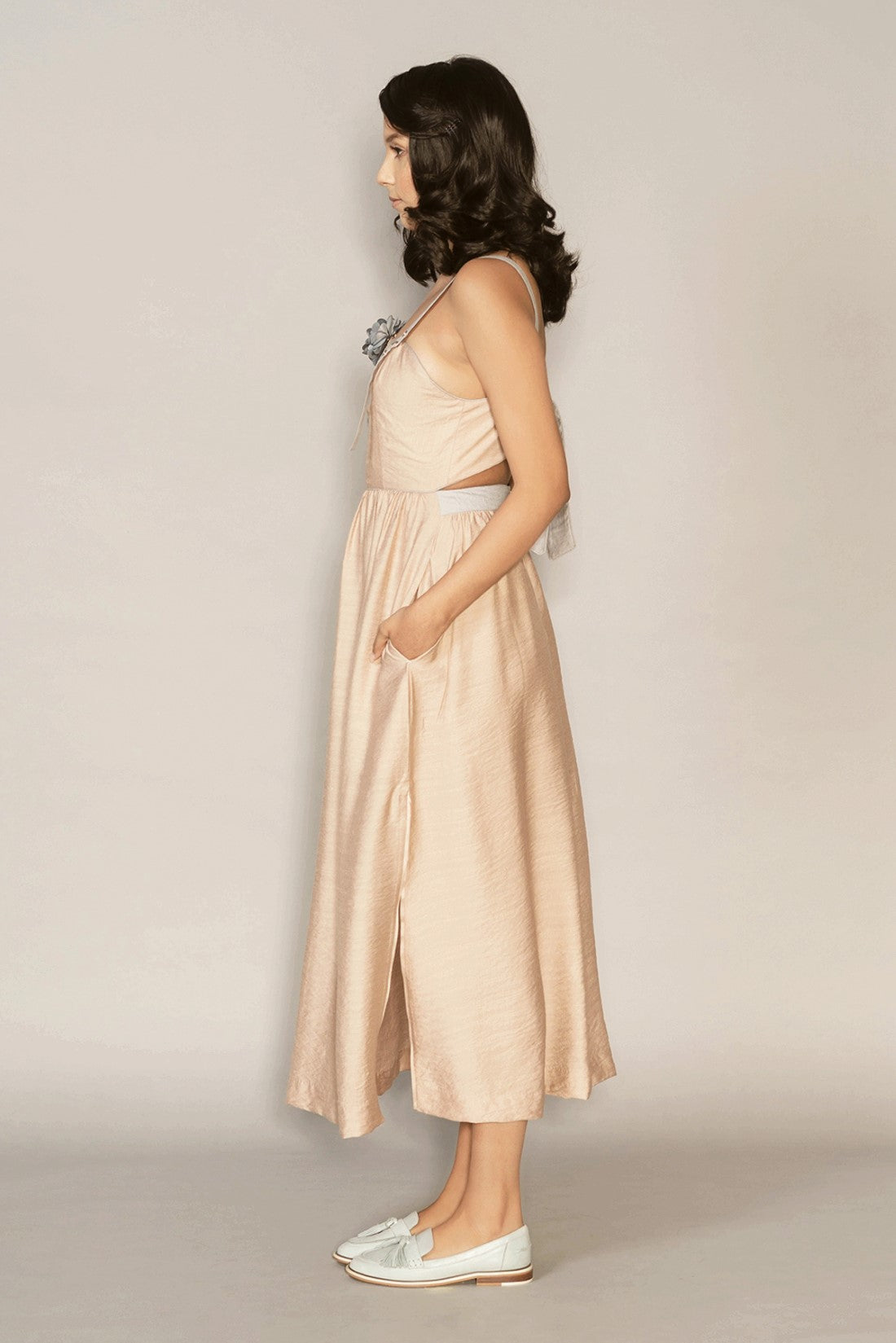 This tie back midi dress is a delightful choice for a fun and vibrant summer look. With a rounded hem top and adjustable shoulder straps, it offers a comfortable and flattering fit. The handmade floral brooch adds a charming touch to complete the ensemble.