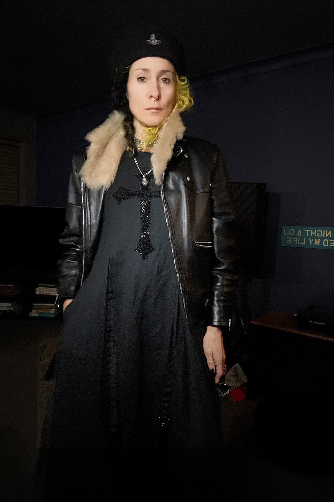 A bold black pleated linen dress with quirky charm—featuring an embellished embroidery patch and exposed zip closure for a touch of edgy elegance.