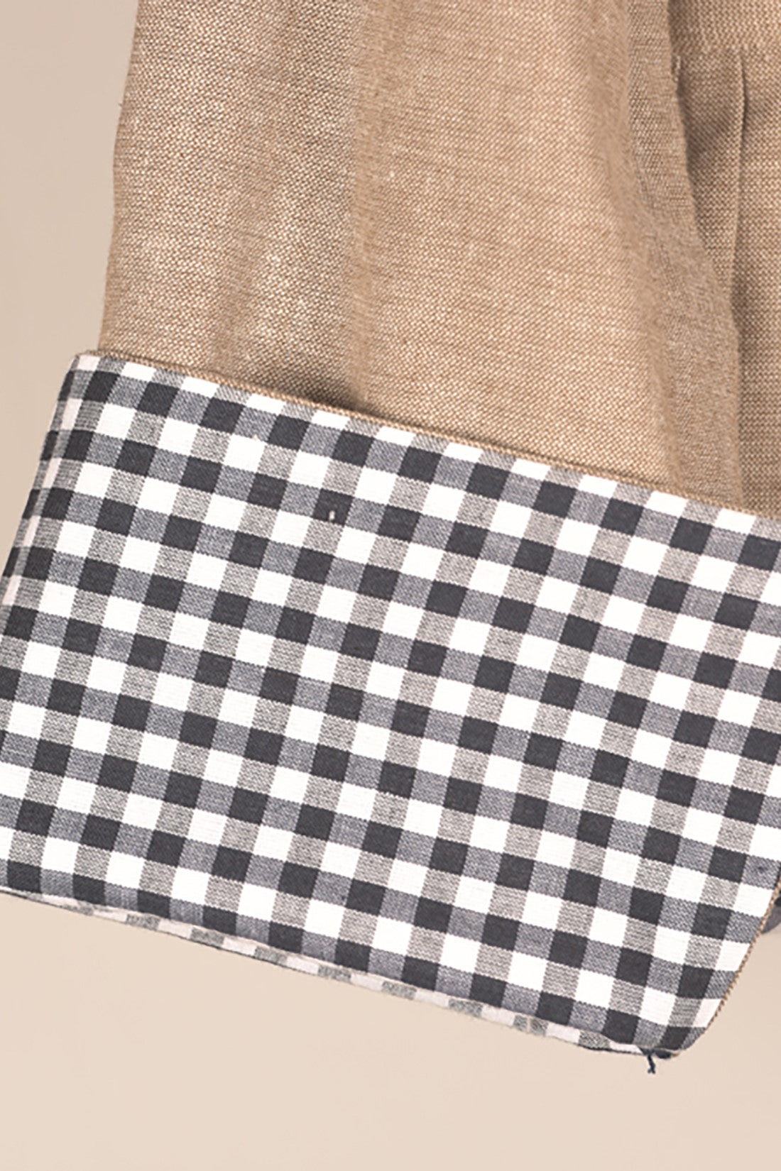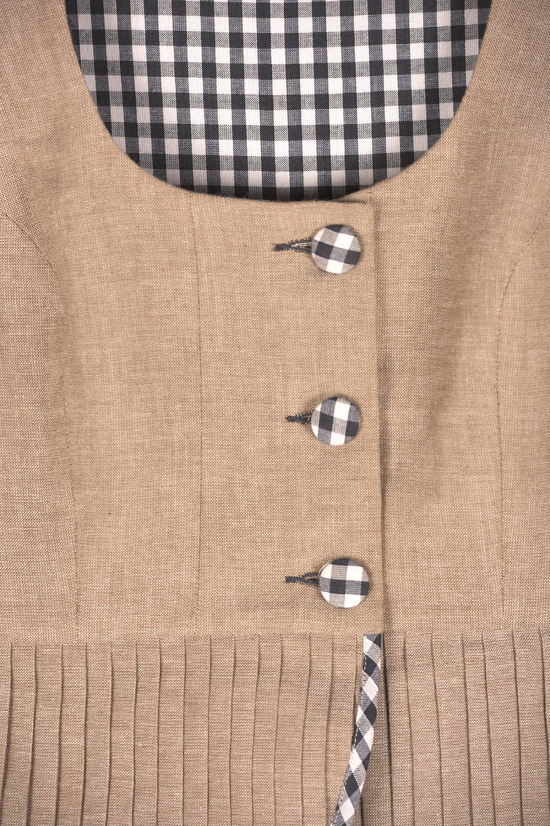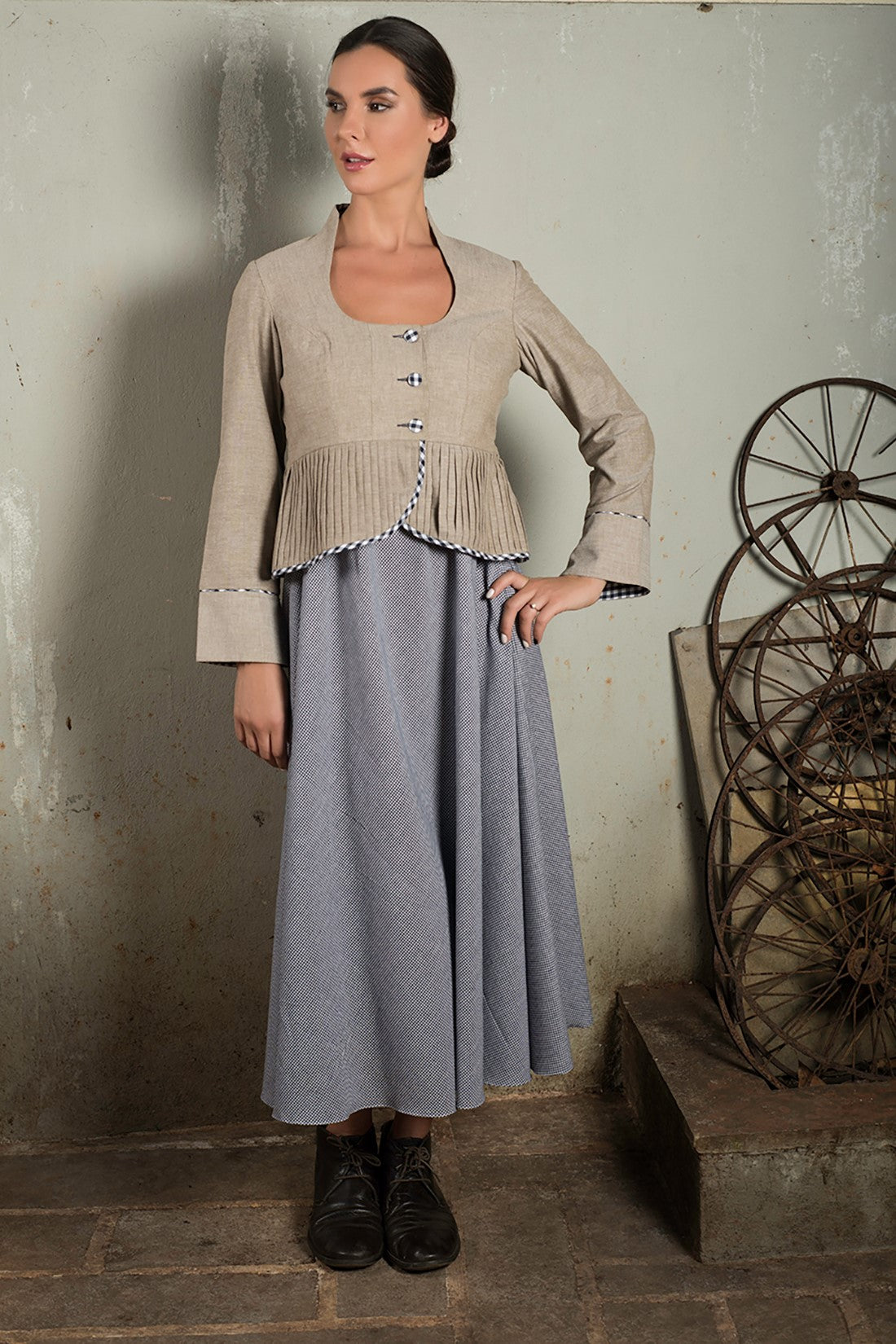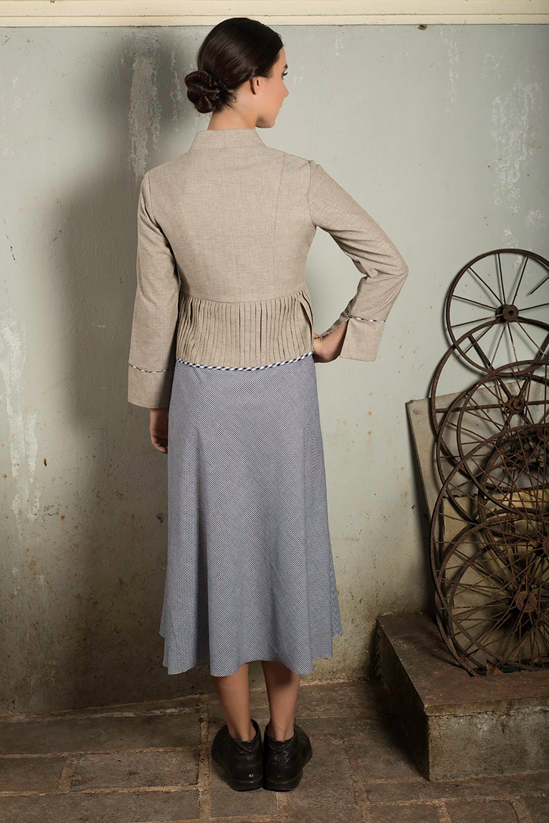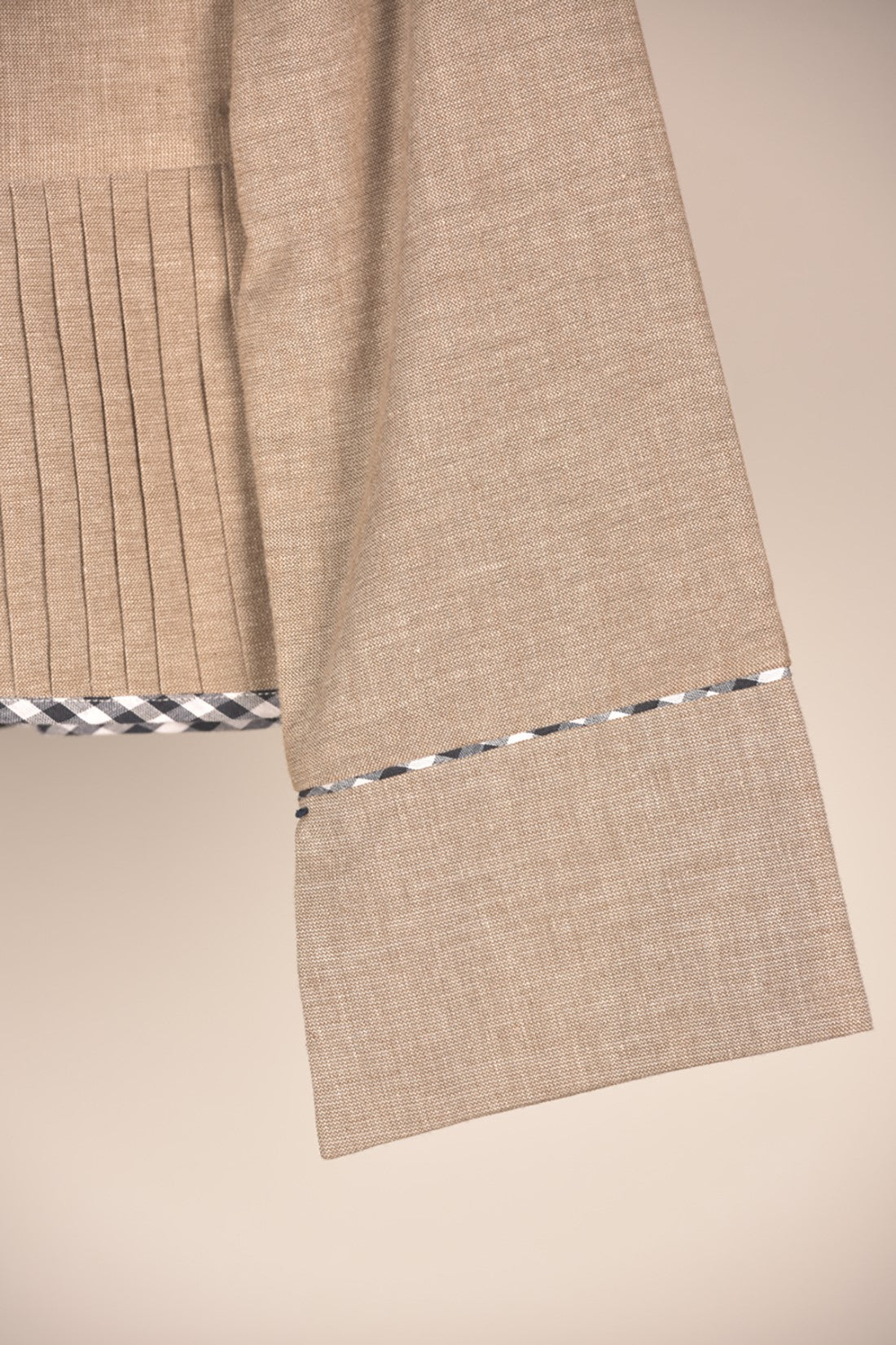 Short cropped jacket that features pleats and blue checks rim on the sleeves and bottom
