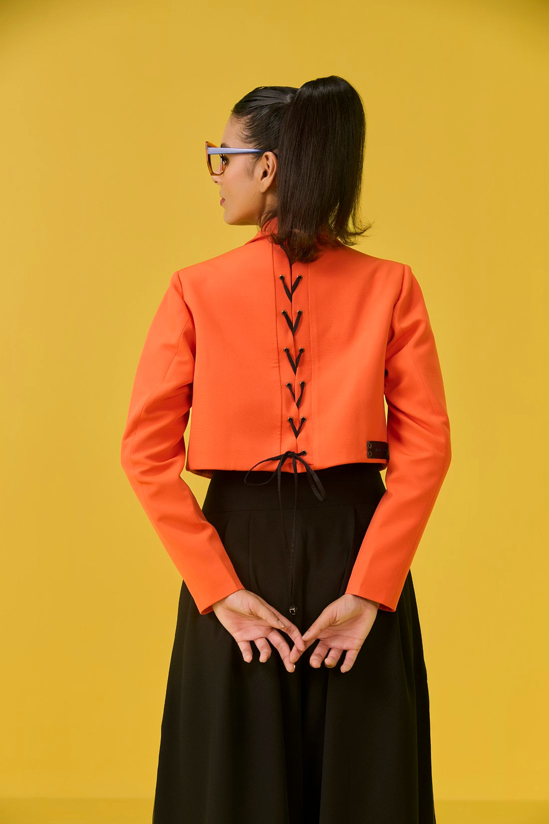 Elevate your look with this bold, fashion-forward silhouette. This cropped coat features exaggerated, oversized lapels. The center back is detailed with drawstrings running along its length. Structured yet experimental, this statement layer blurs the lines between tailoring and streetwear.