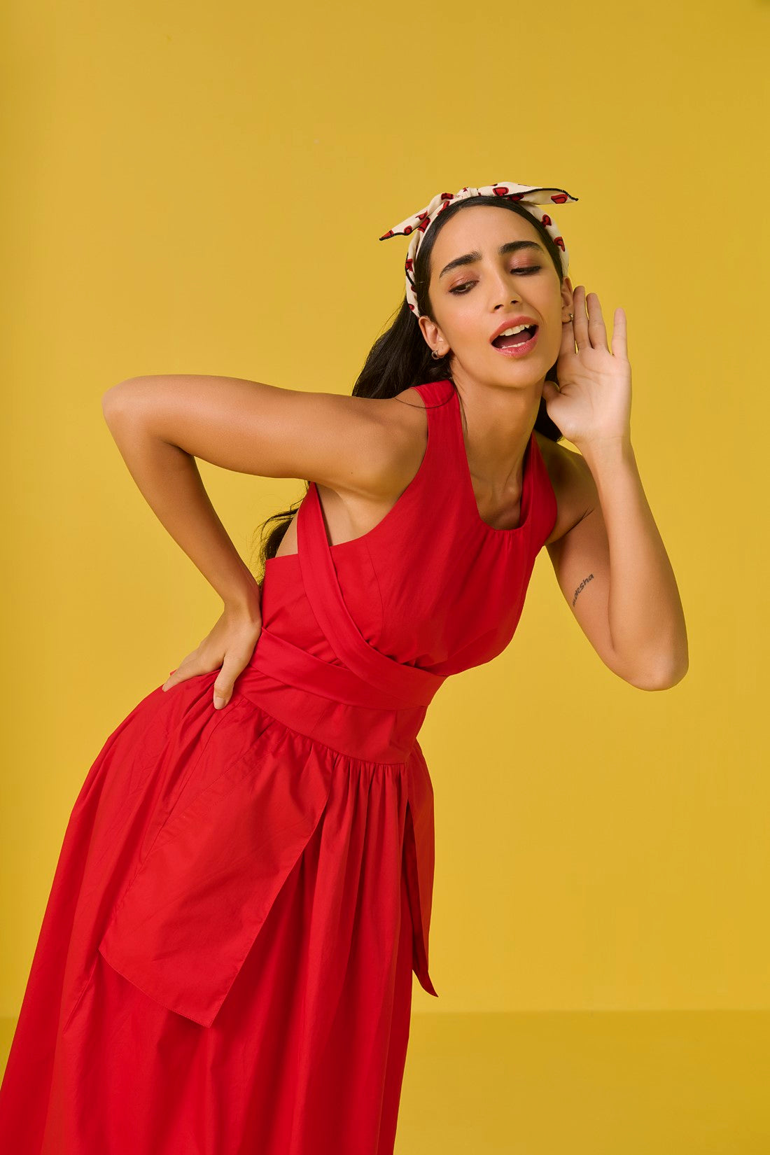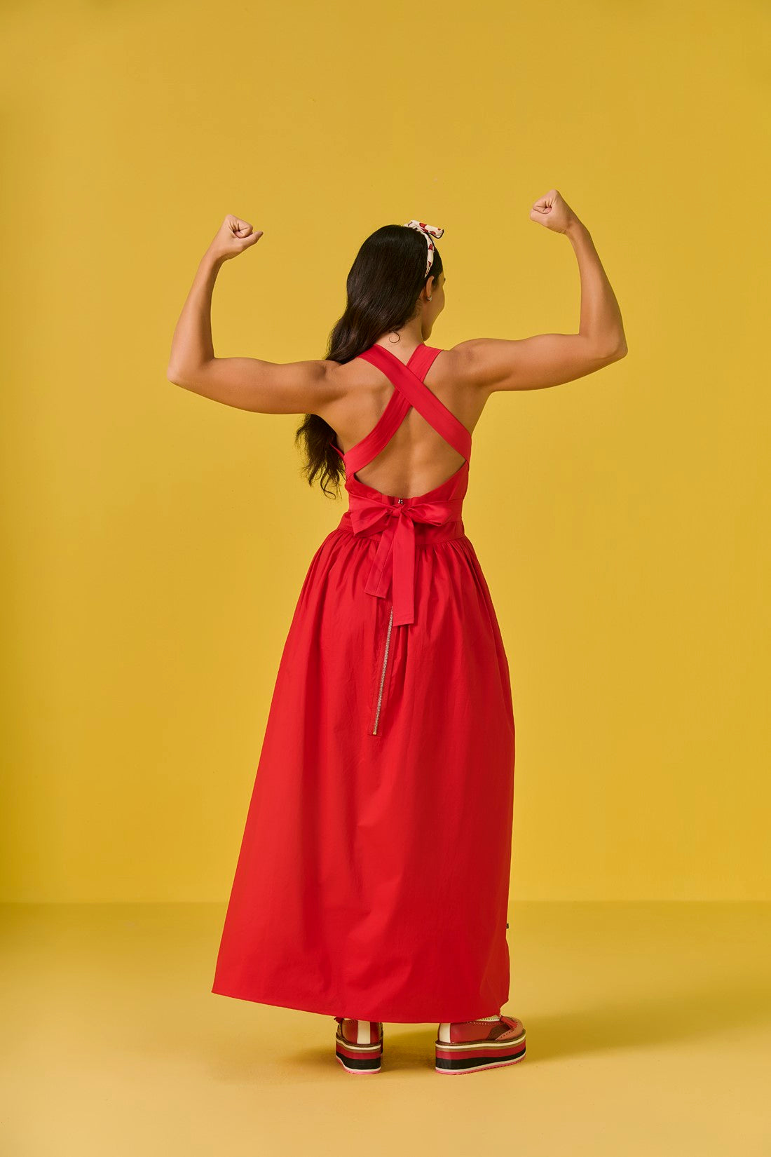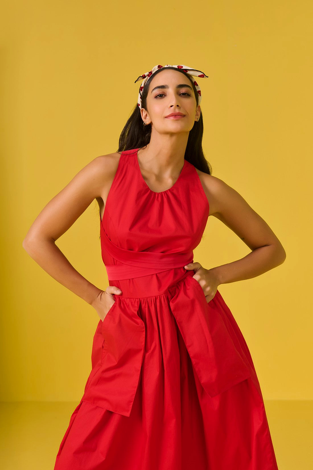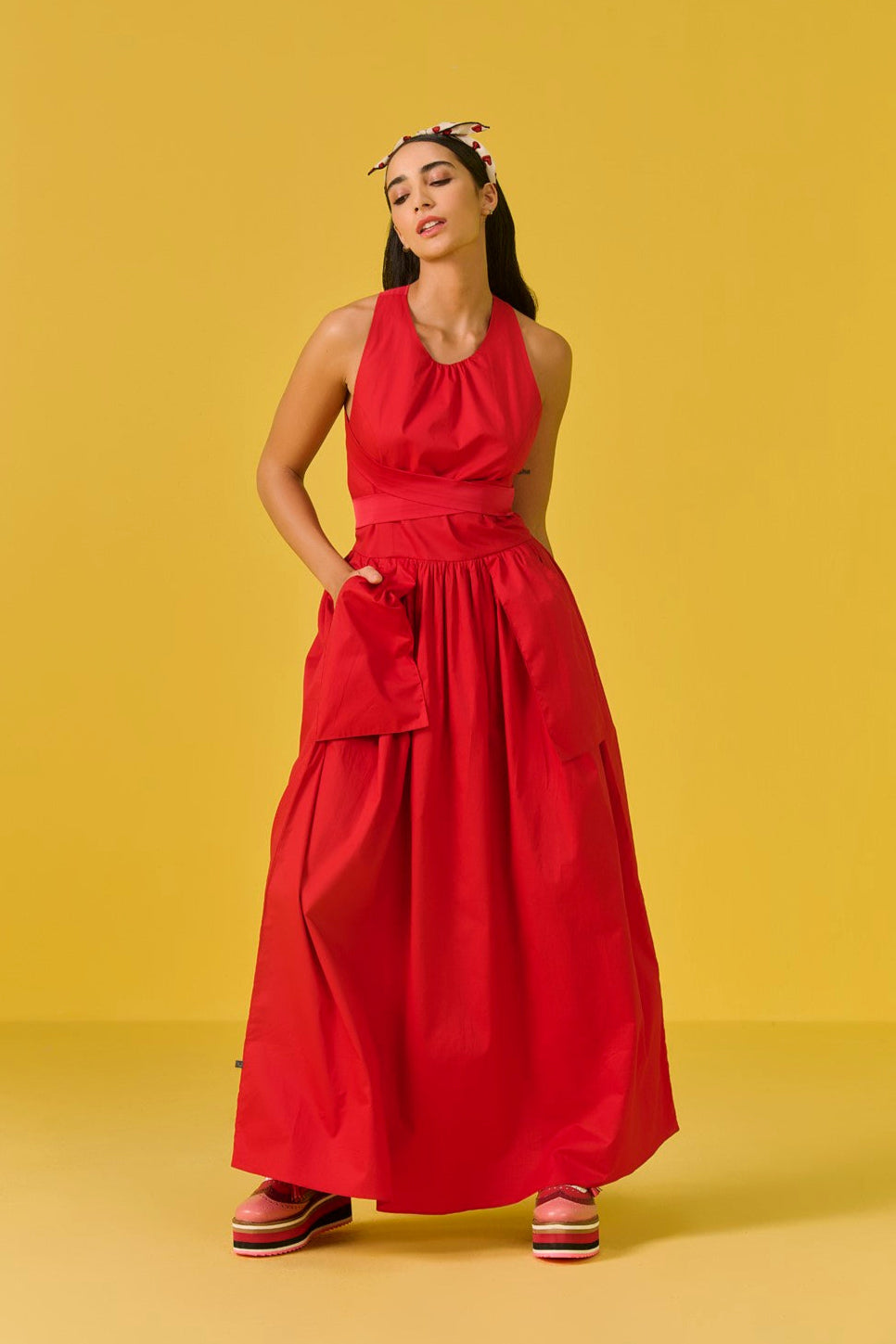 With a sleek backless design, this dress brings in drama from behind, with long tie-up straps at the neckline- you can style the dress your way. The dress has inverted pockets that boldly hang on the outside, flipping the script on ‘functional fashion’ with a playful twist.