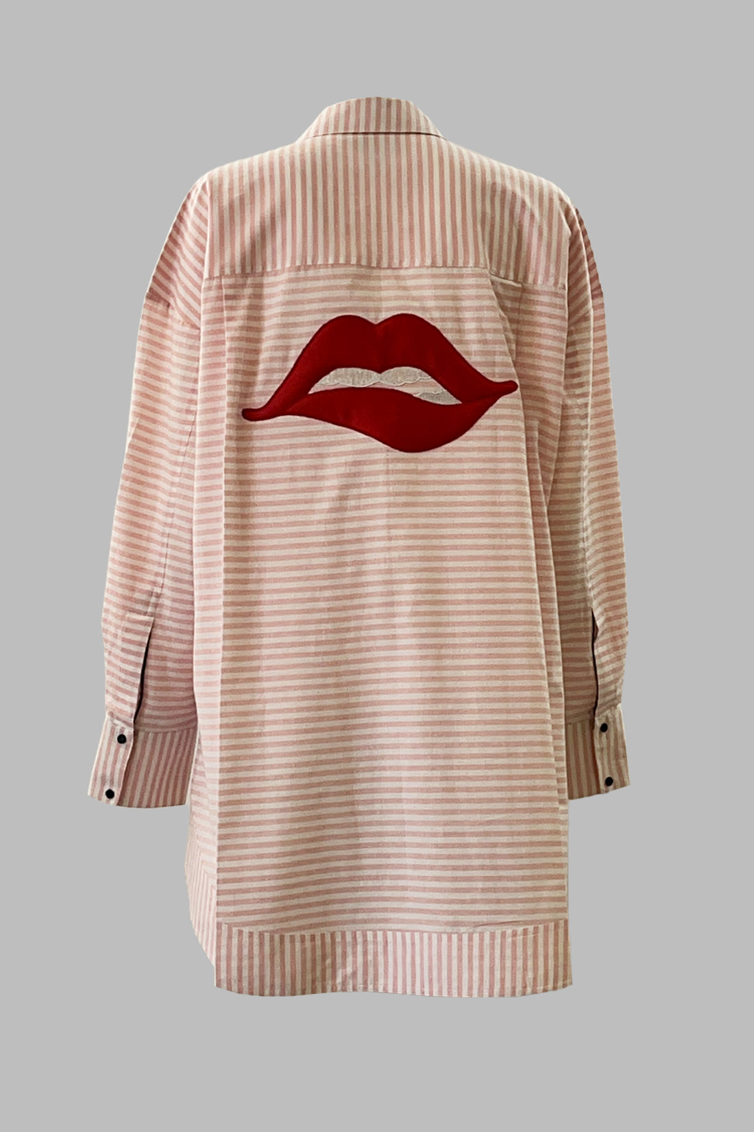 Elevate your wardrobe with our mid-length oversized shirt, featuring a chic embroidered lips patch. Perfect for work, travel, and those effortless after-work outings. This versatile piece is one of our current faves—stylish, comfortable, and ready to make a statement wherever you go