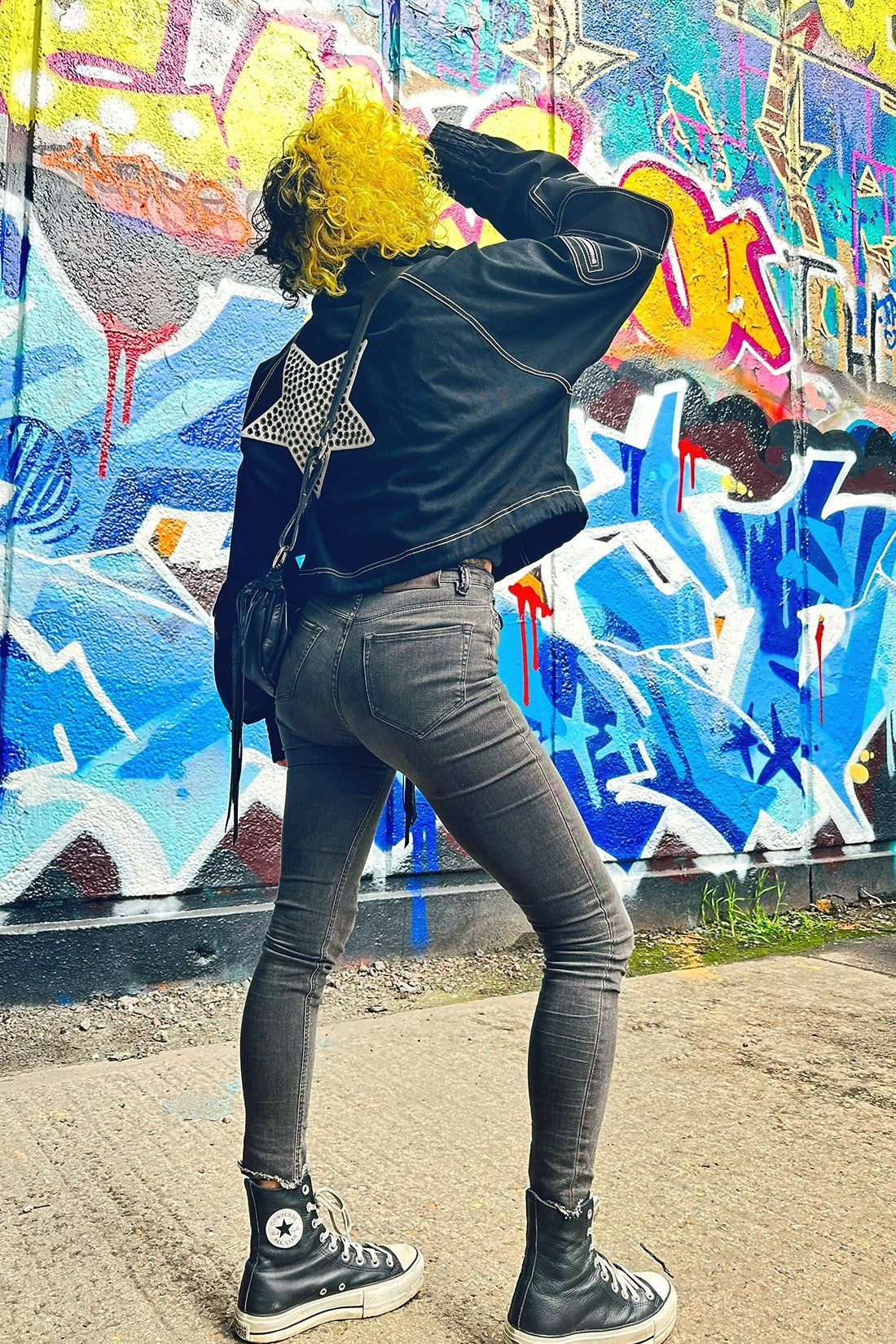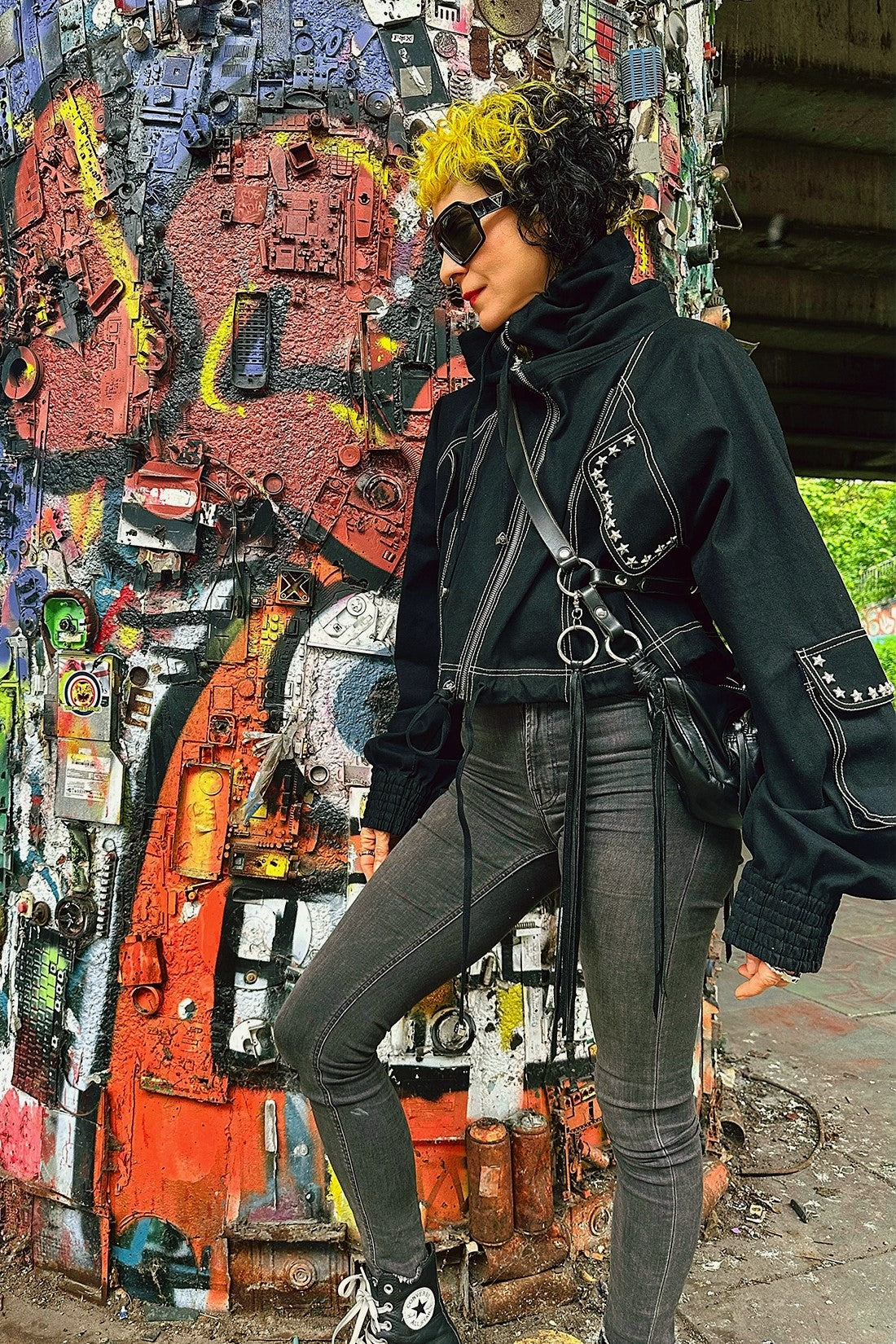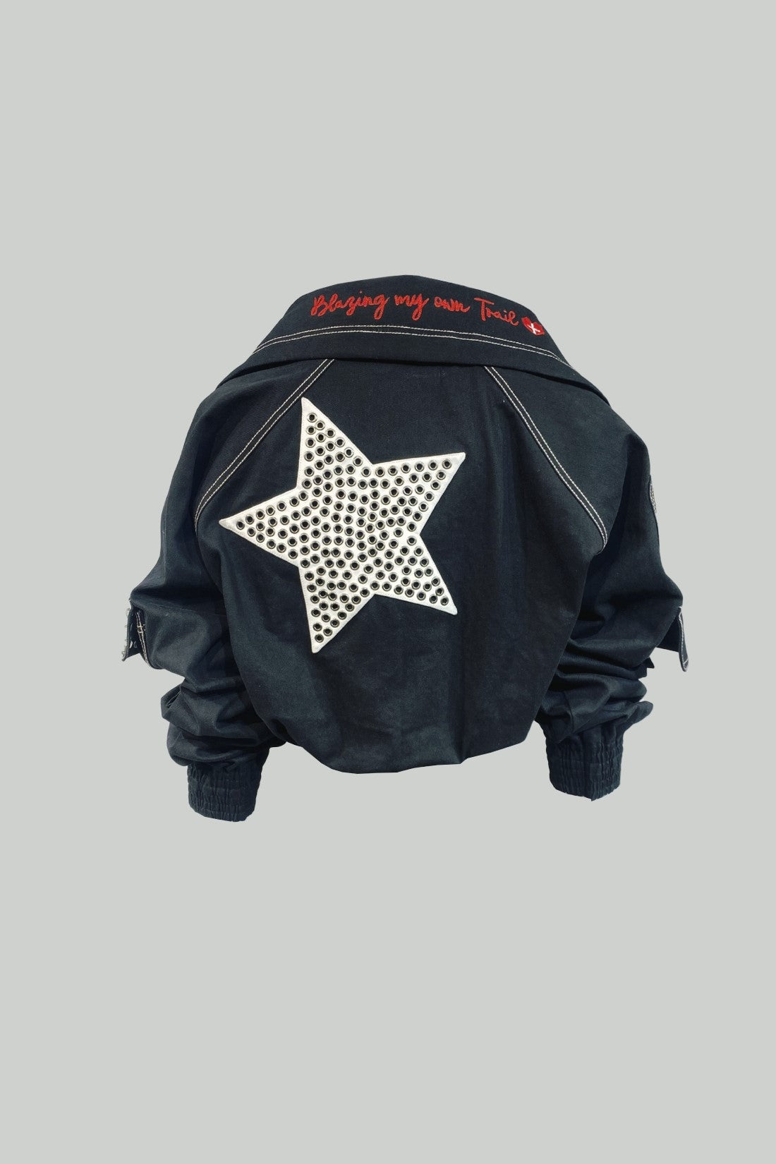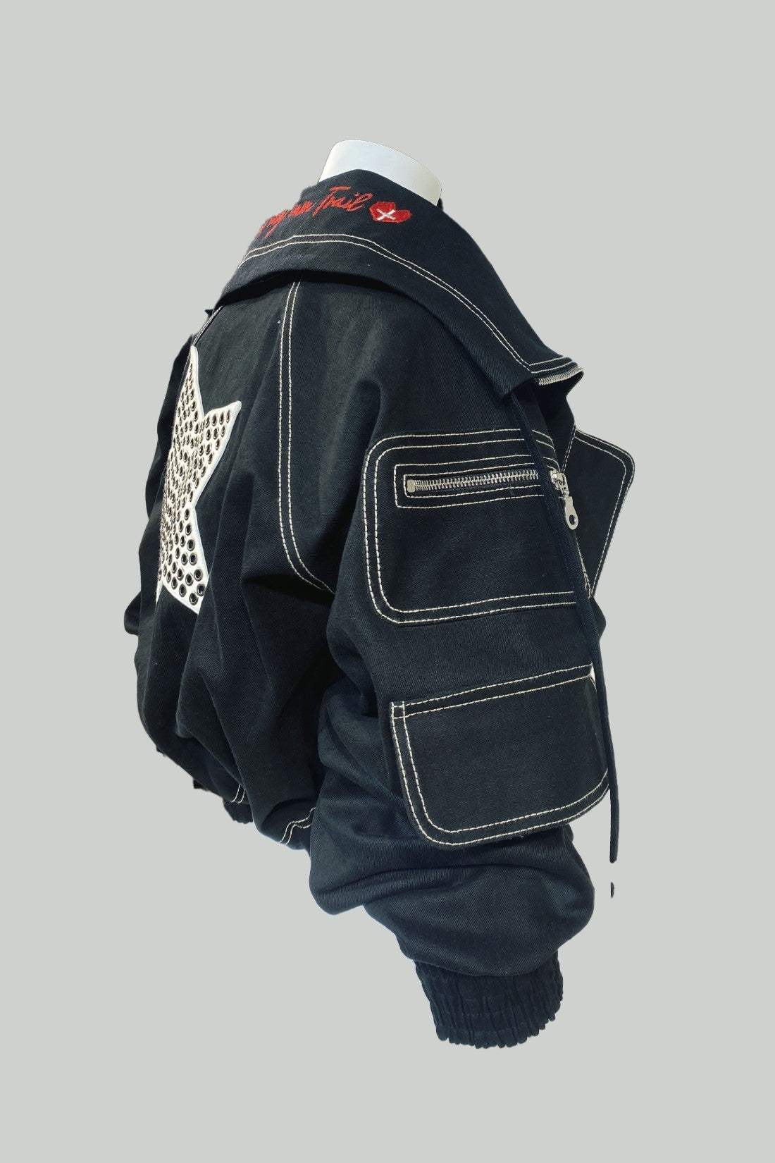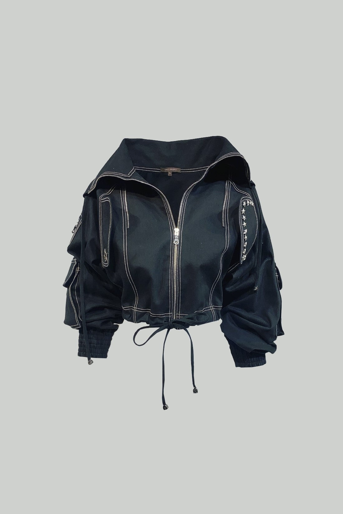 A trendy jacket featuring a long silver front zipper, zipper detailing, star-shaped metallic studs, a large star embroidery patch on the back, and drawstrings at the waist for a tailored fit.