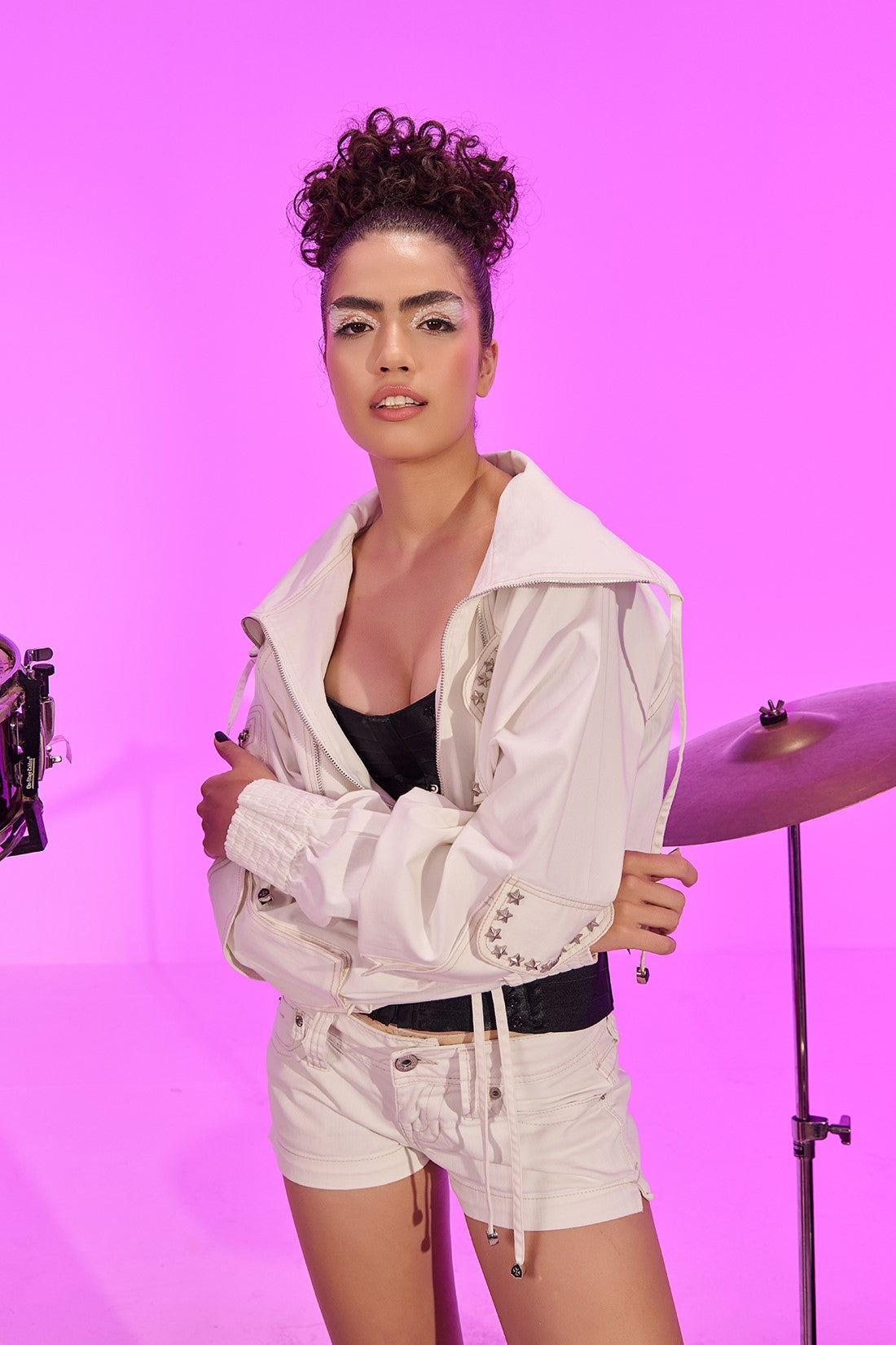 - The jacket is enhanced with zipper detailing and star shaped metallic studds