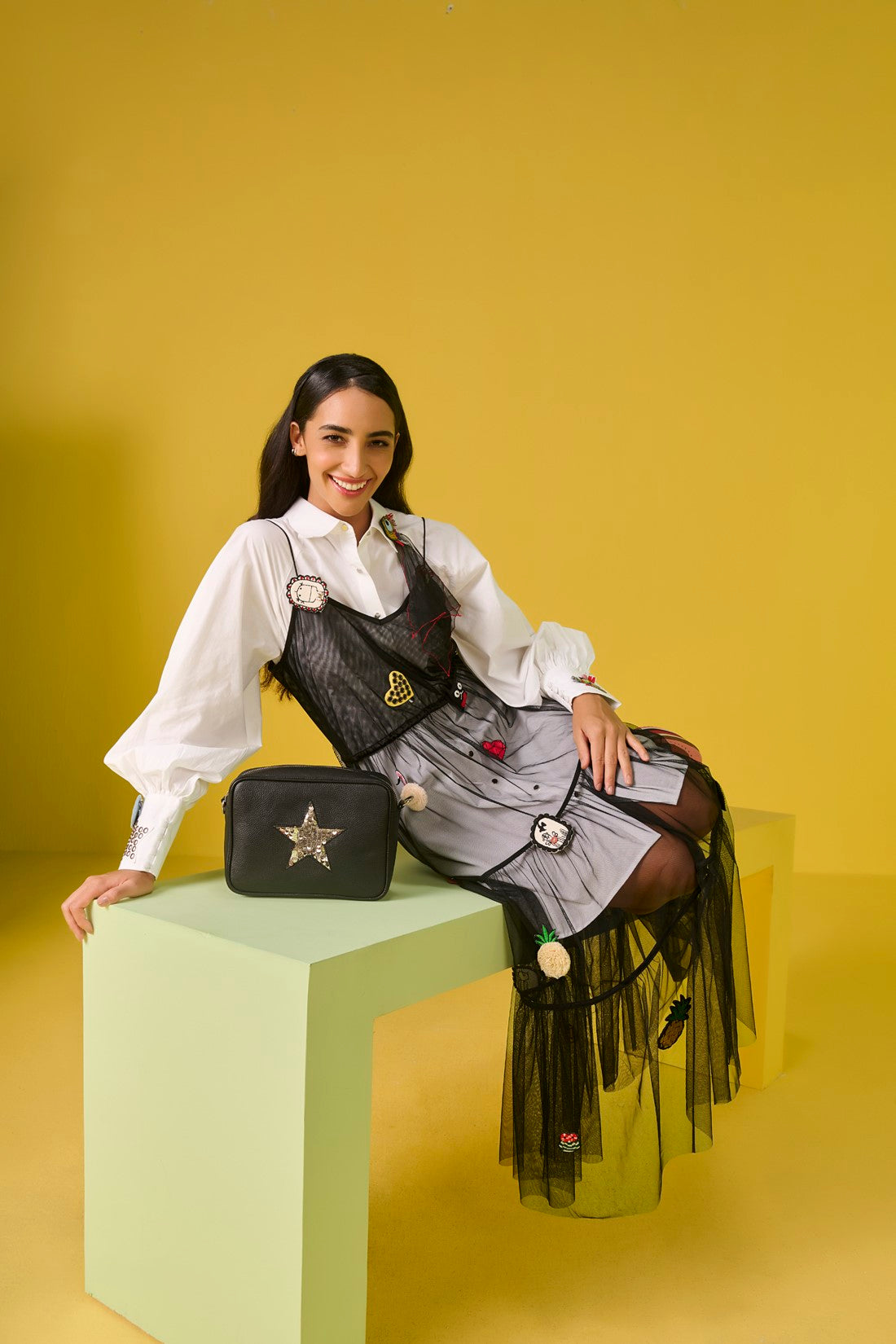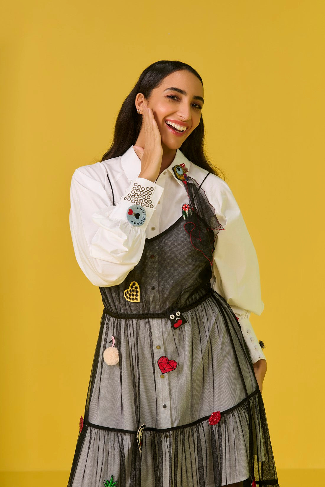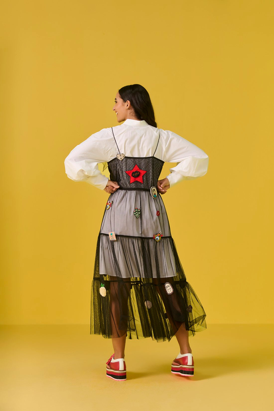 This breezy beach style dress is crafted with delicate net fabric into a graceful tiered silhouette. Enhanced with unique handmade brooches and artistic patches and confetti, each piece adds a personal, eye-catching detail that elevates the relaxed, coastal vibe. Perfect for layering over swimwear or pairing with our Janis-Joy shirtdress for a chic city look.