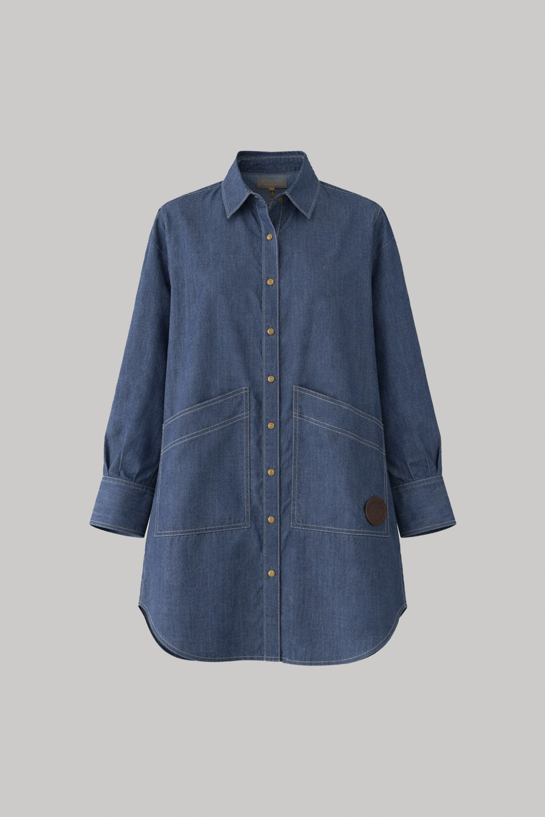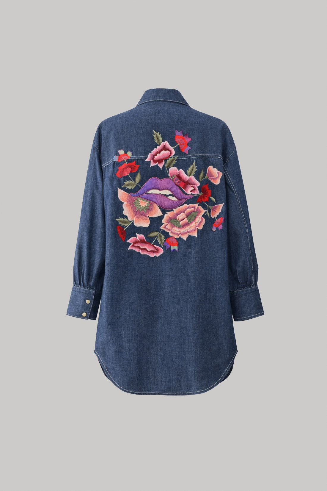 Relaxed-fit chambray boyfriend shirt in a soft lightweight denim-look fabric. Designed with a classic collar, button front, curved hem, and statement embroidered back detail for an effortless off-duty look.