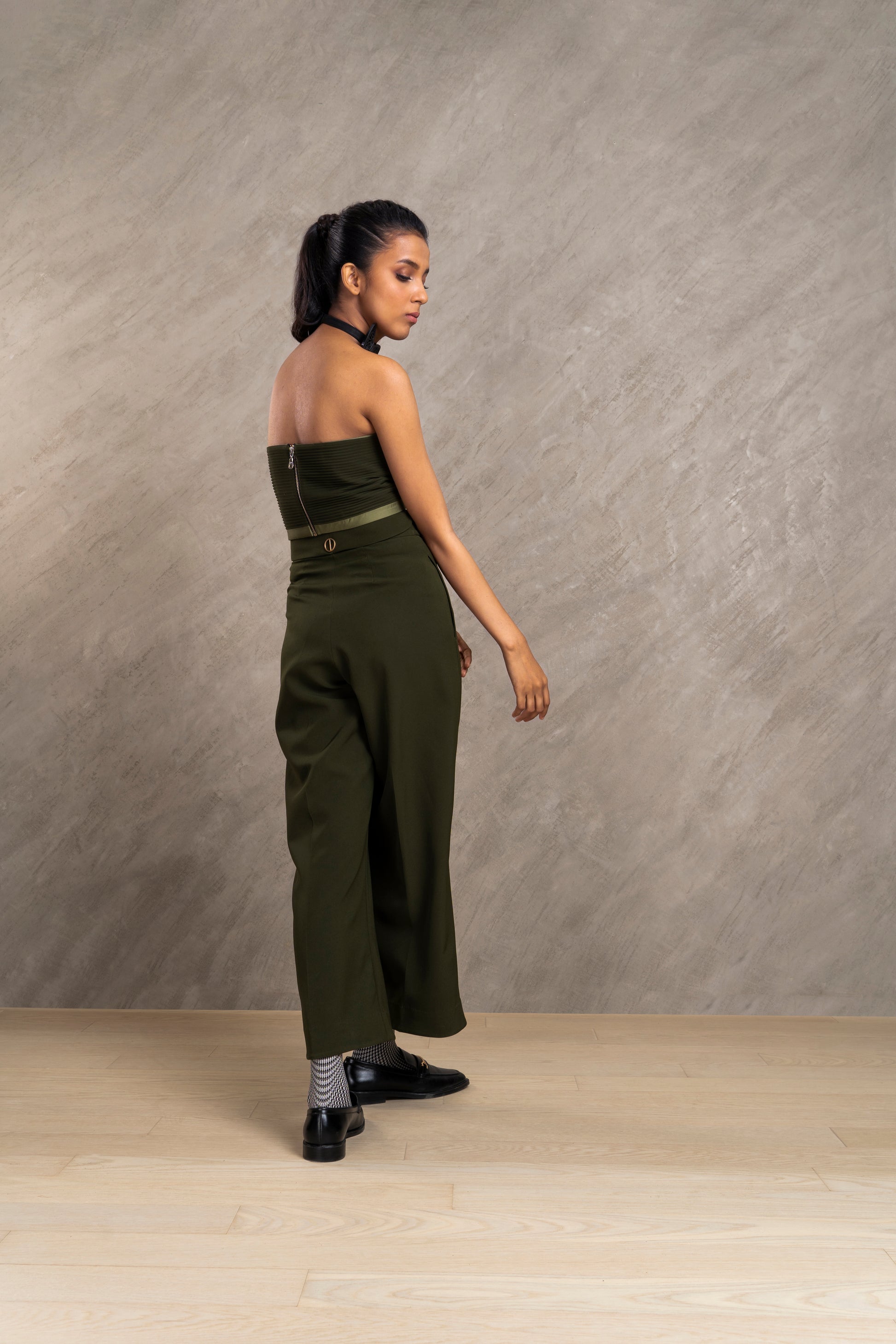 High waisted flare pants with front closing metal zipper featuring a collar fold detail on the waistband which can be accessorized by a belt; finished off with a gold button at the back.