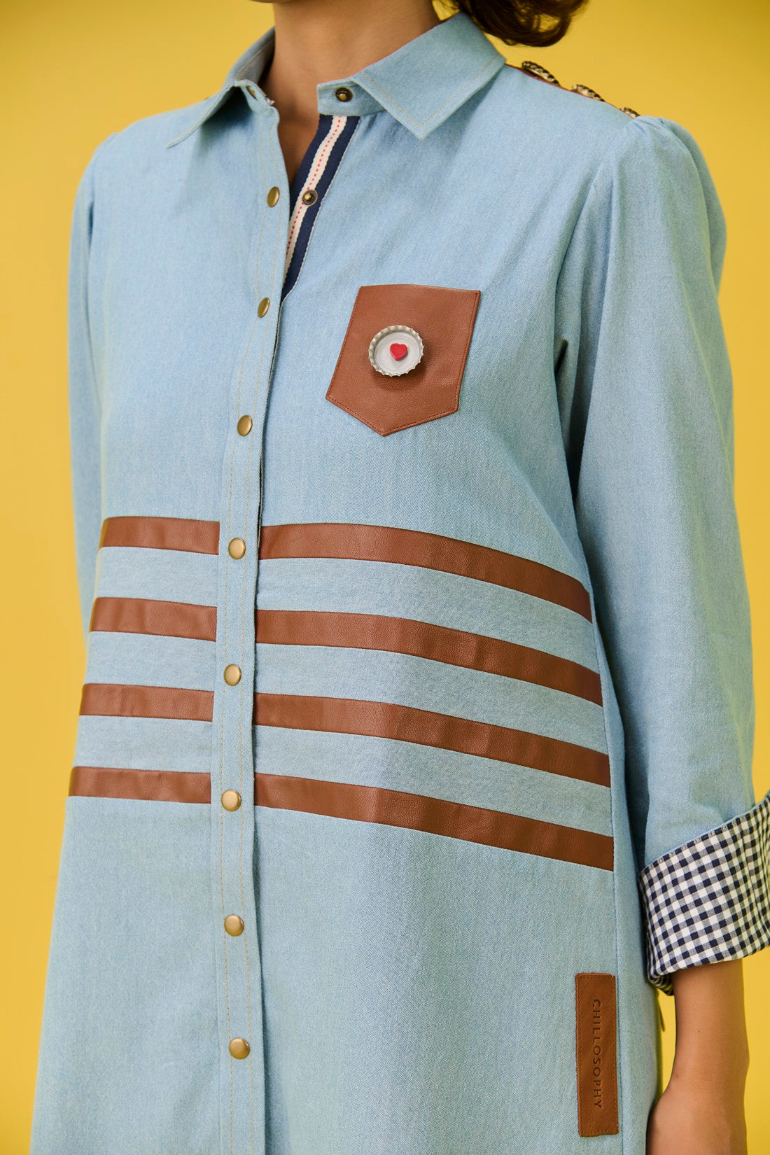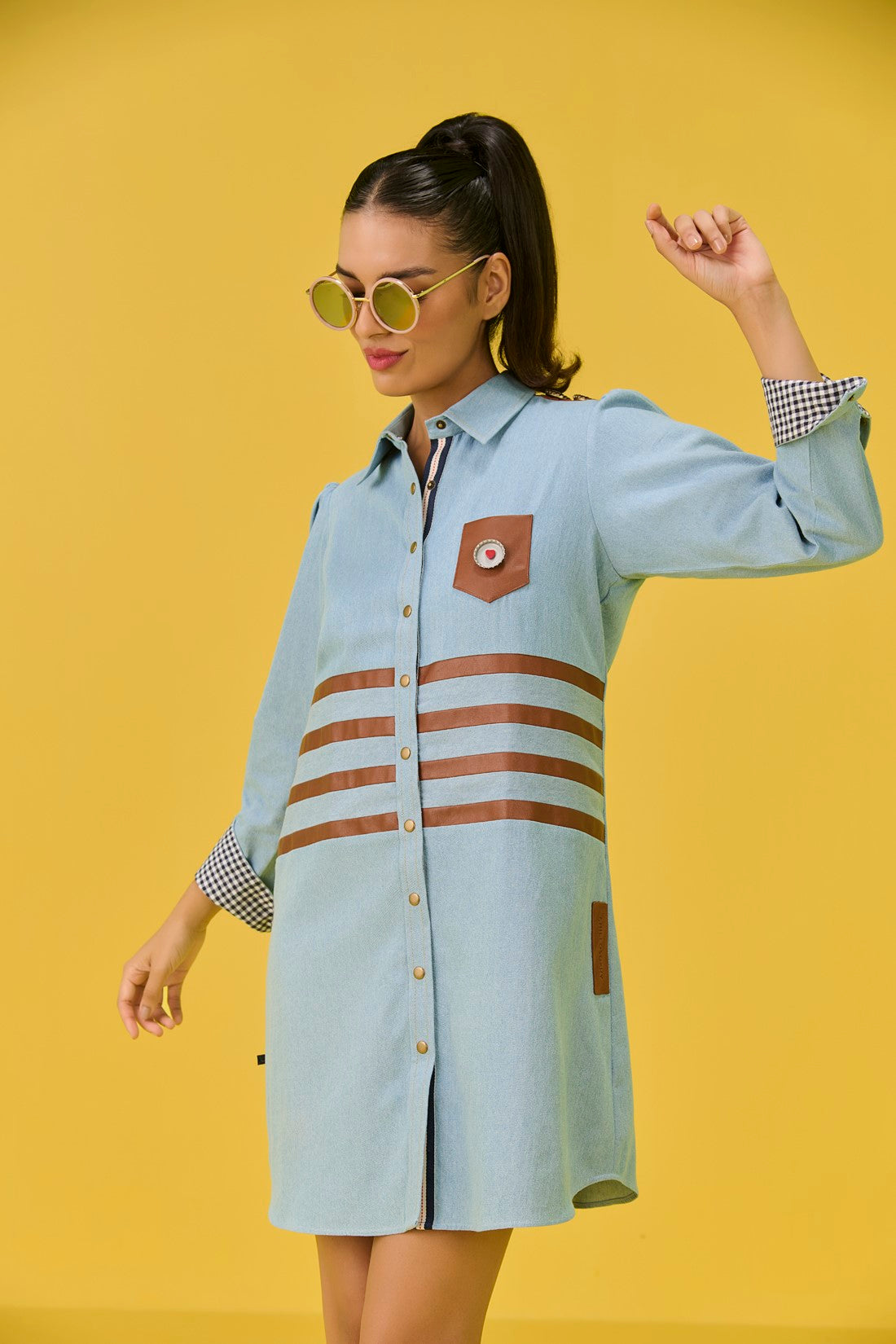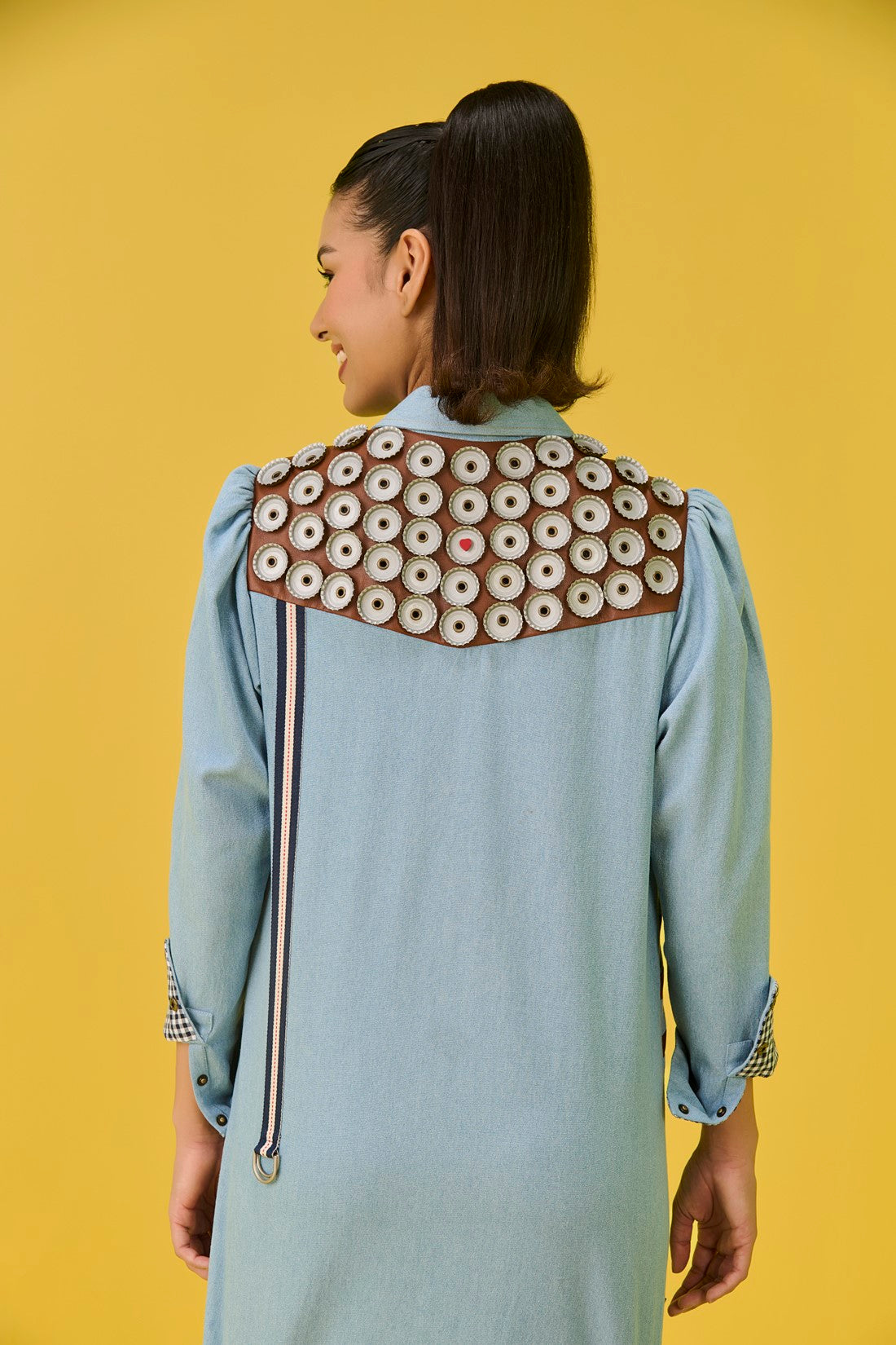 This short, comfortable shirt dress redefines casual cool with its innovative, intriguing feature and a surprisingly edgy detail: the entire upper back is meticulously adorned with a unique constellation of bottle caps set with rivets. Unleash your inner rebel with this ultra-quirky piece.