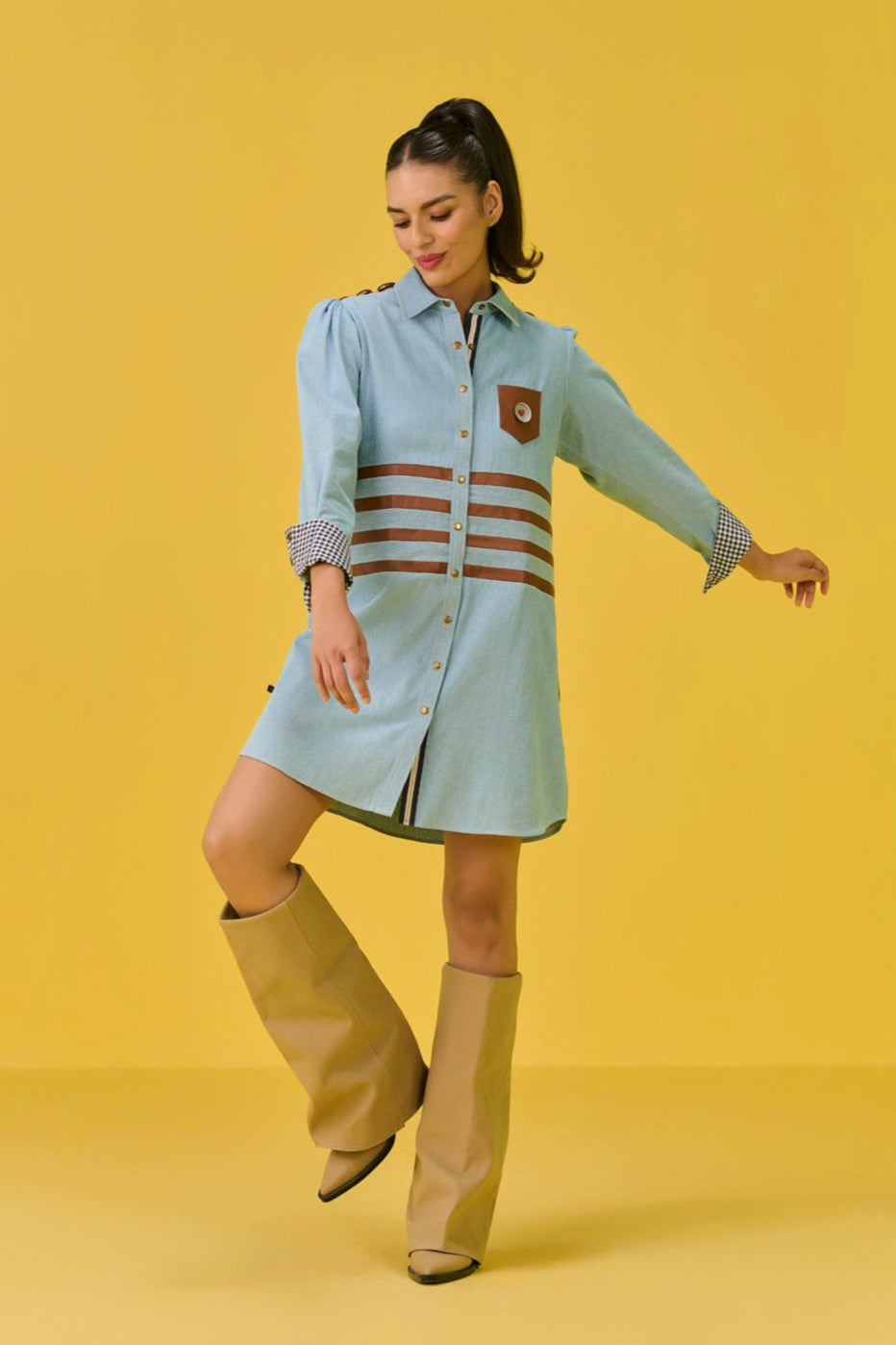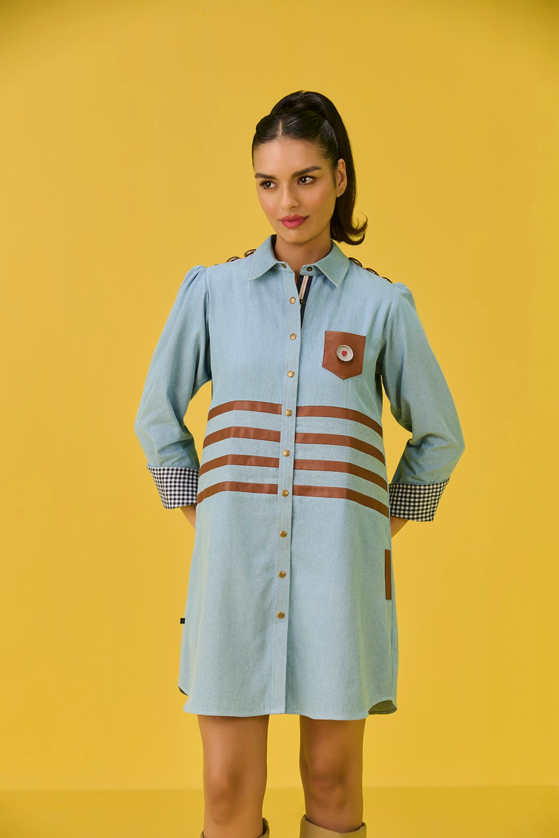 - Made of soft denim, this piece features long sleeves and stripes across the front in contrast fabric