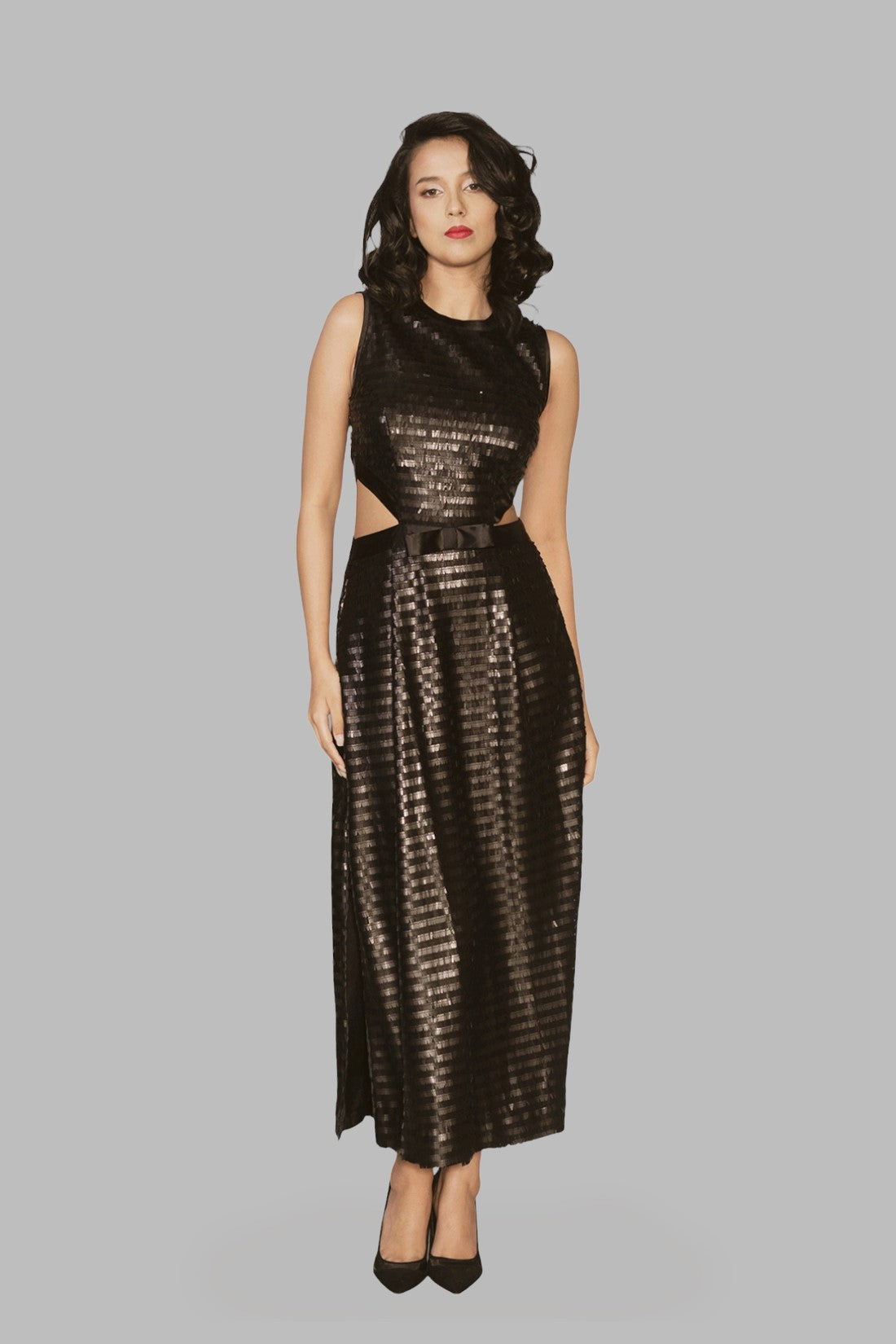 A sleek, form-fitting long gown featuring a captivating waist cutout and elegant side slits, accentuated by striking contrast edge lining.