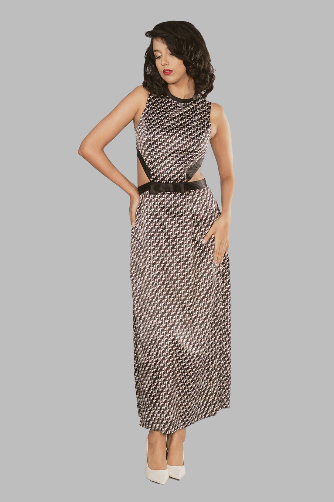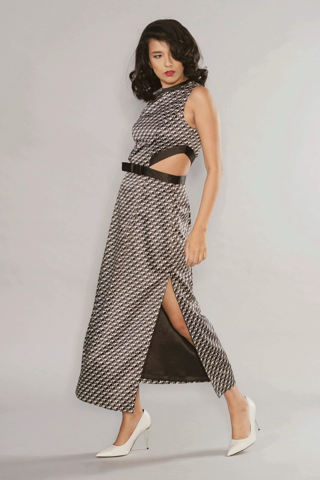 A sleek, form-fitting long gown featuring a captivating waist cutout and elegant side slits, accentuated by striking contrast edge lining.