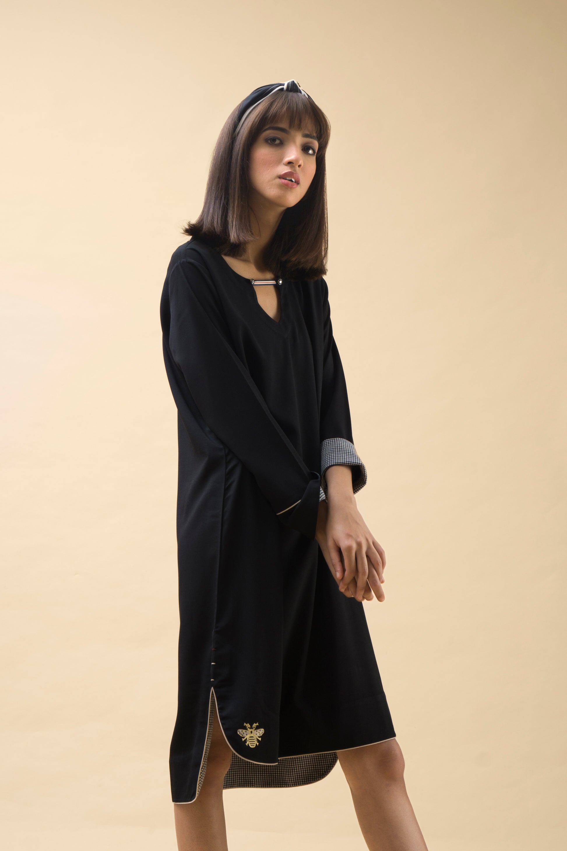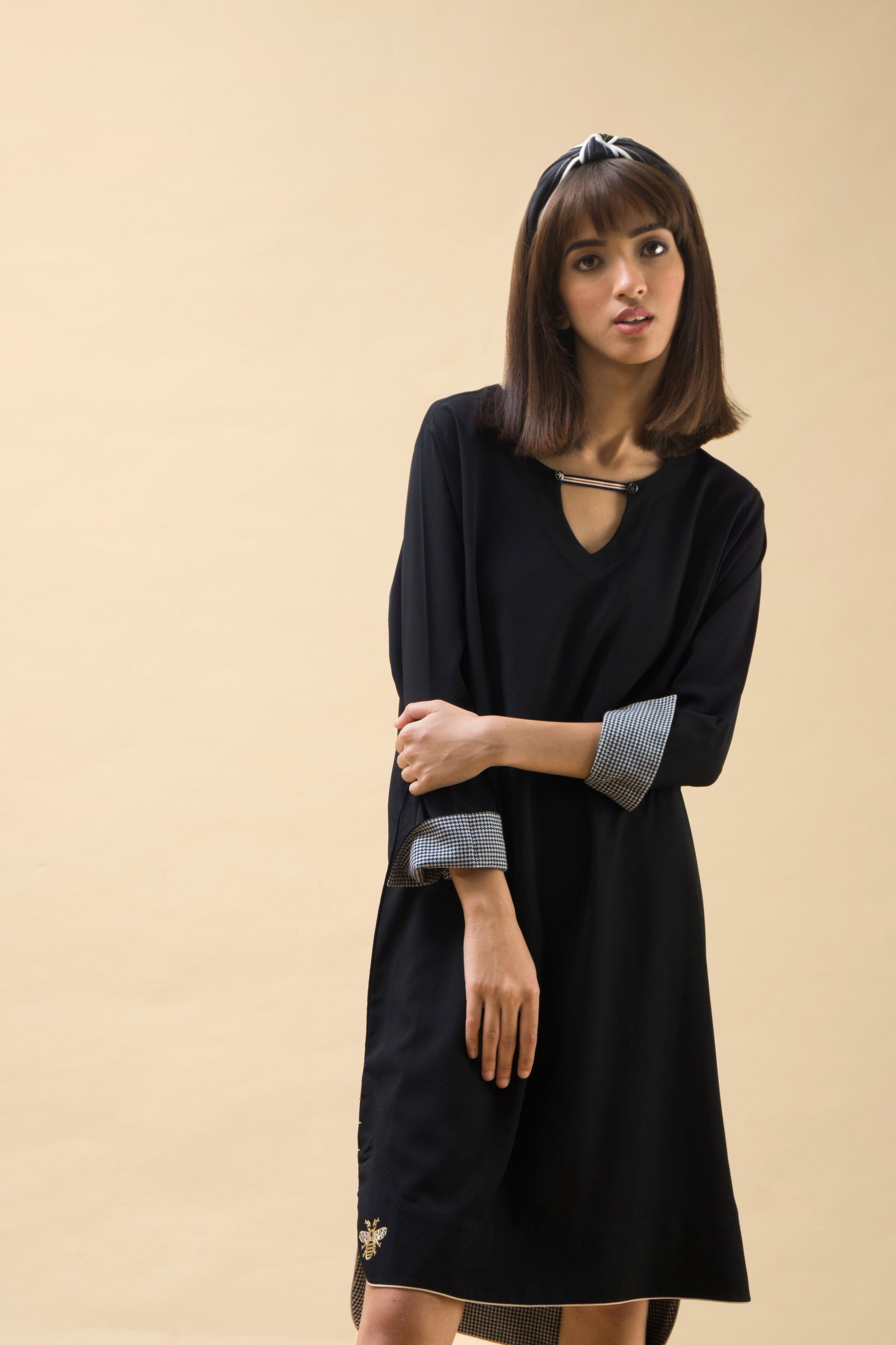 A mid length tunic with front hook details with finishes such as the rounded and piping details at the bottom and checks facing on the inside