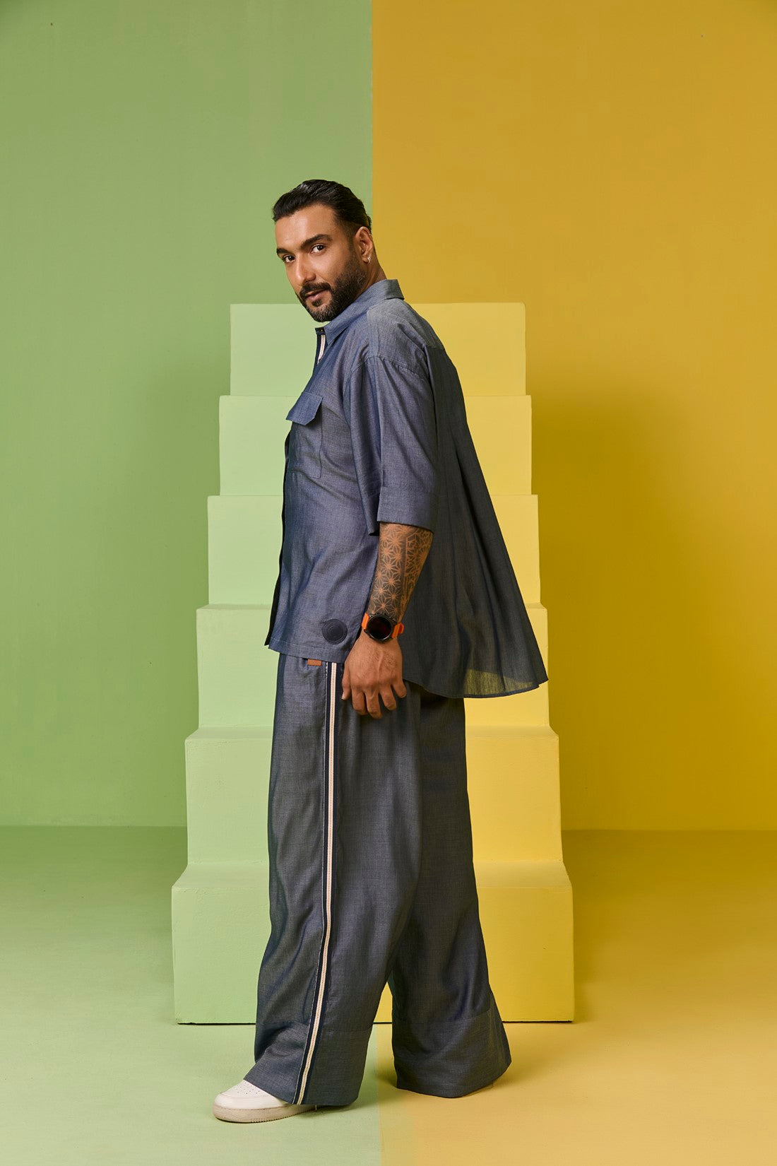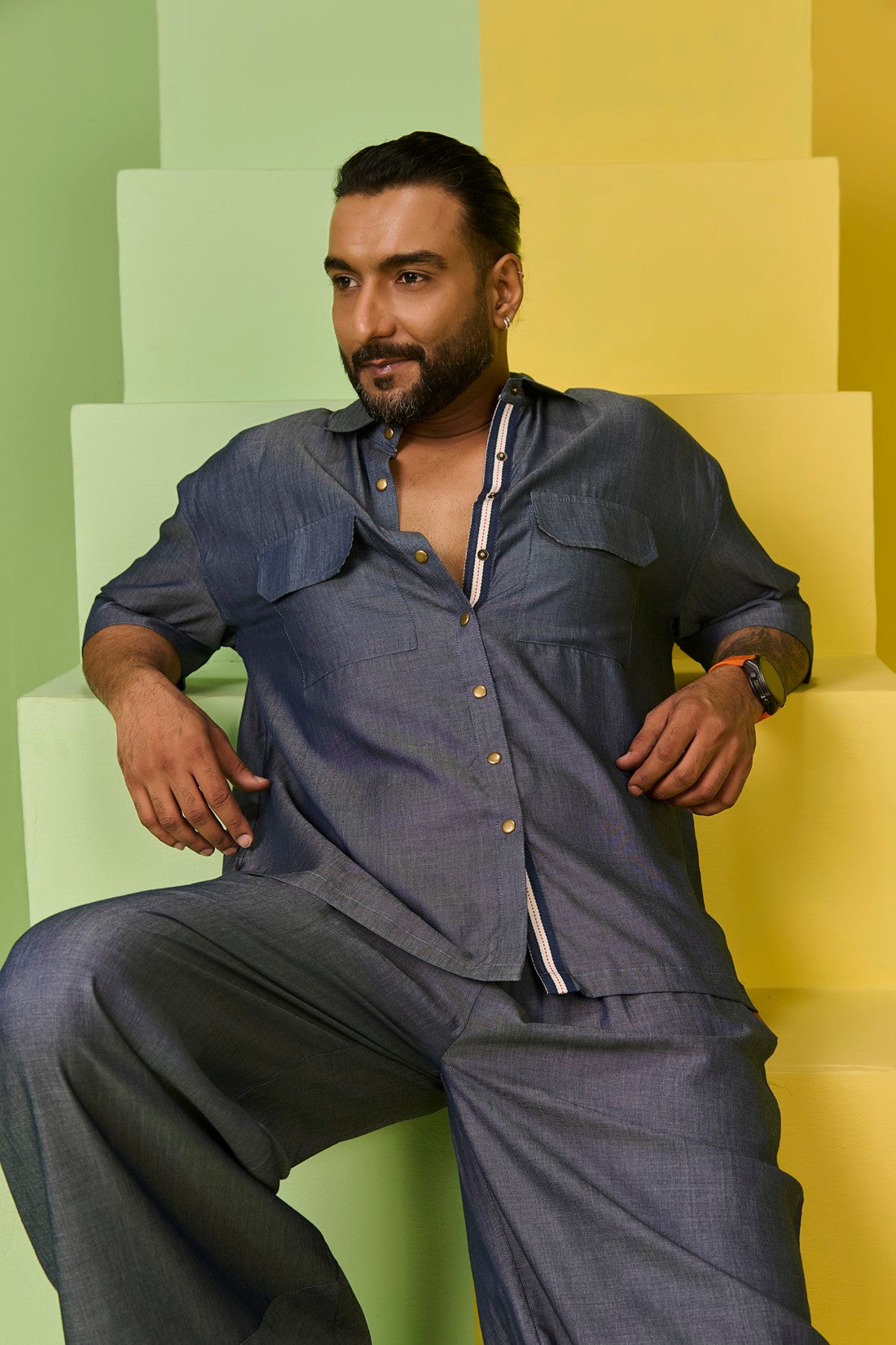 Cut for movement with a super loose silhouette, this shirt balances form and function. Two patch pockets add structure to the garment, each finished with contrast facing on the flaps. Finished with contrast colour lace on the inside of the button placket. Pair with ZONK trousers for a coordinated statement that blends comfort with attitude.