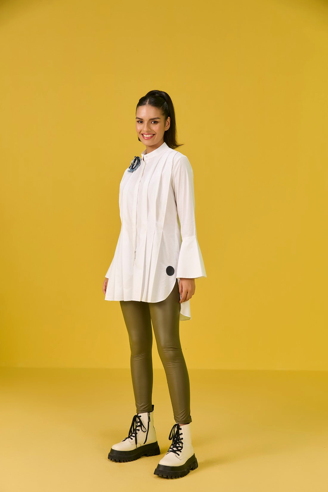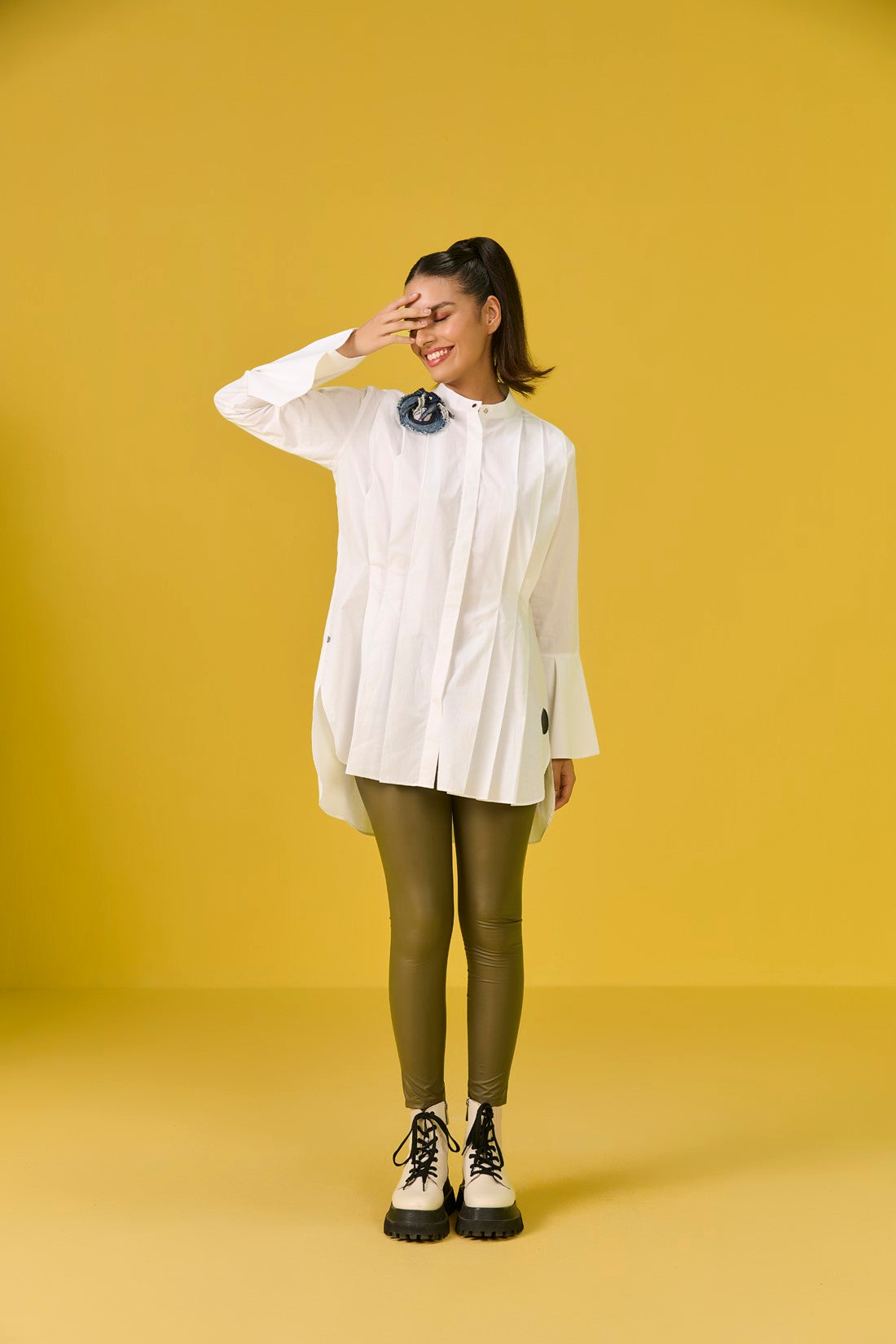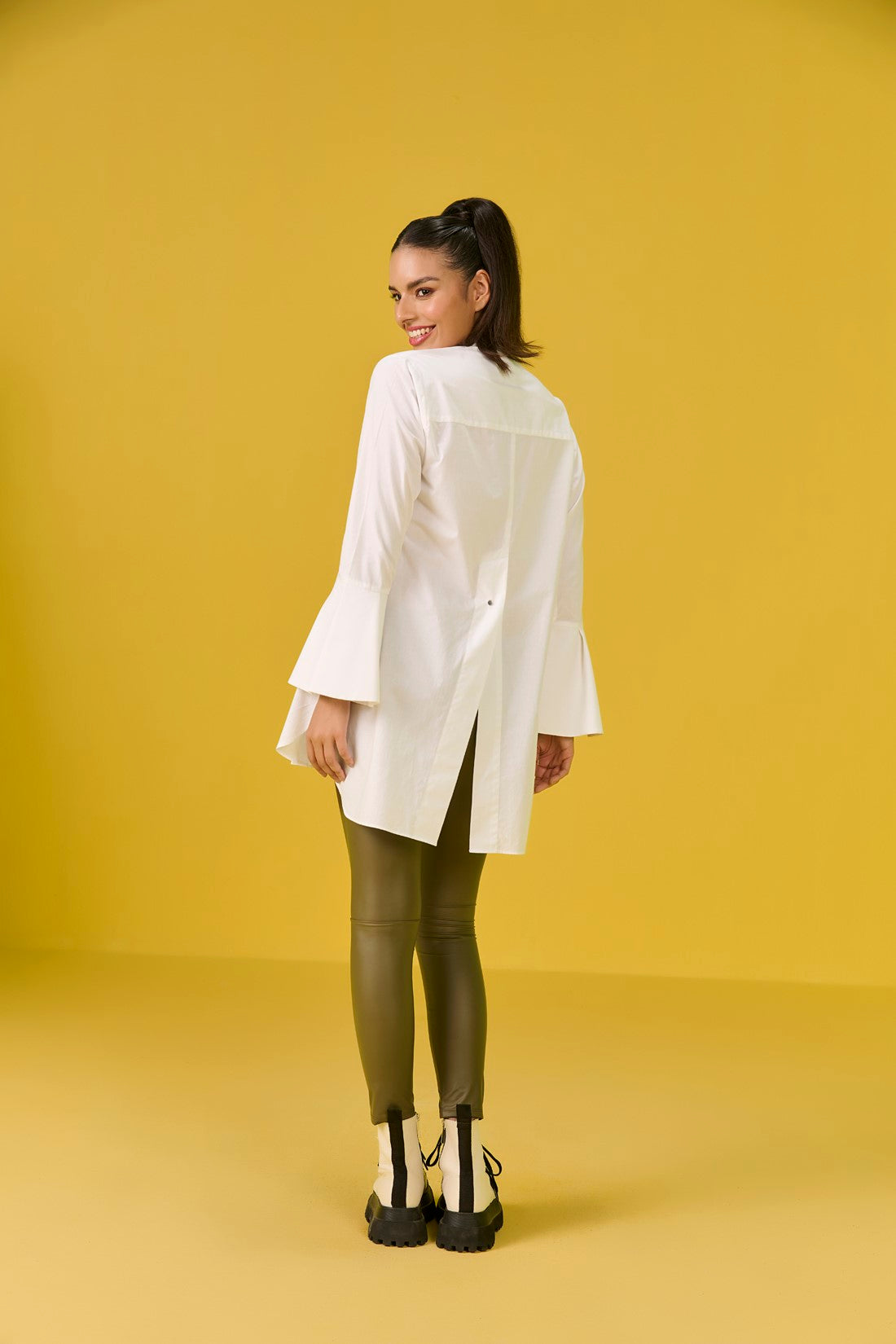 This long line shirt shows off neat box pleats down the front for a structured yet playful vibe, while a cheeky long slit at the center back lets you swish and swirl as you move. The bell sleeves bring a flirty, boho flair. Dress it up or down- it’s ready to twirl through any plan you’ve got.