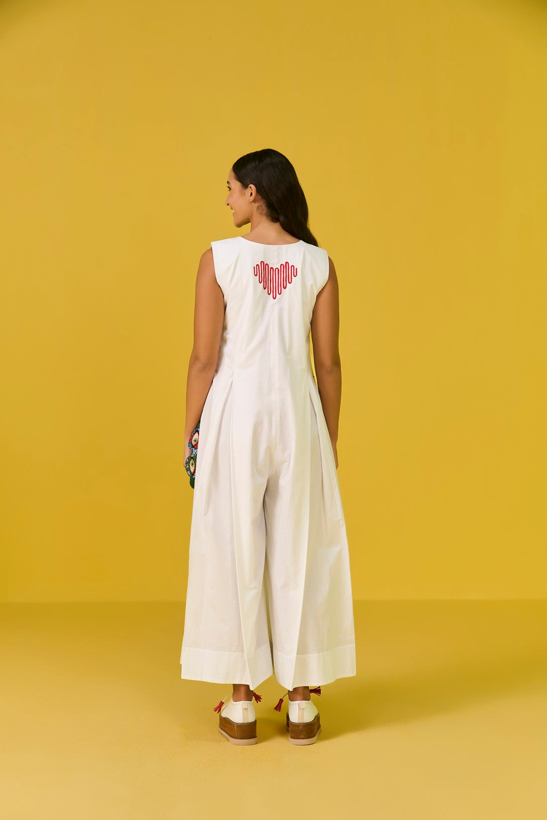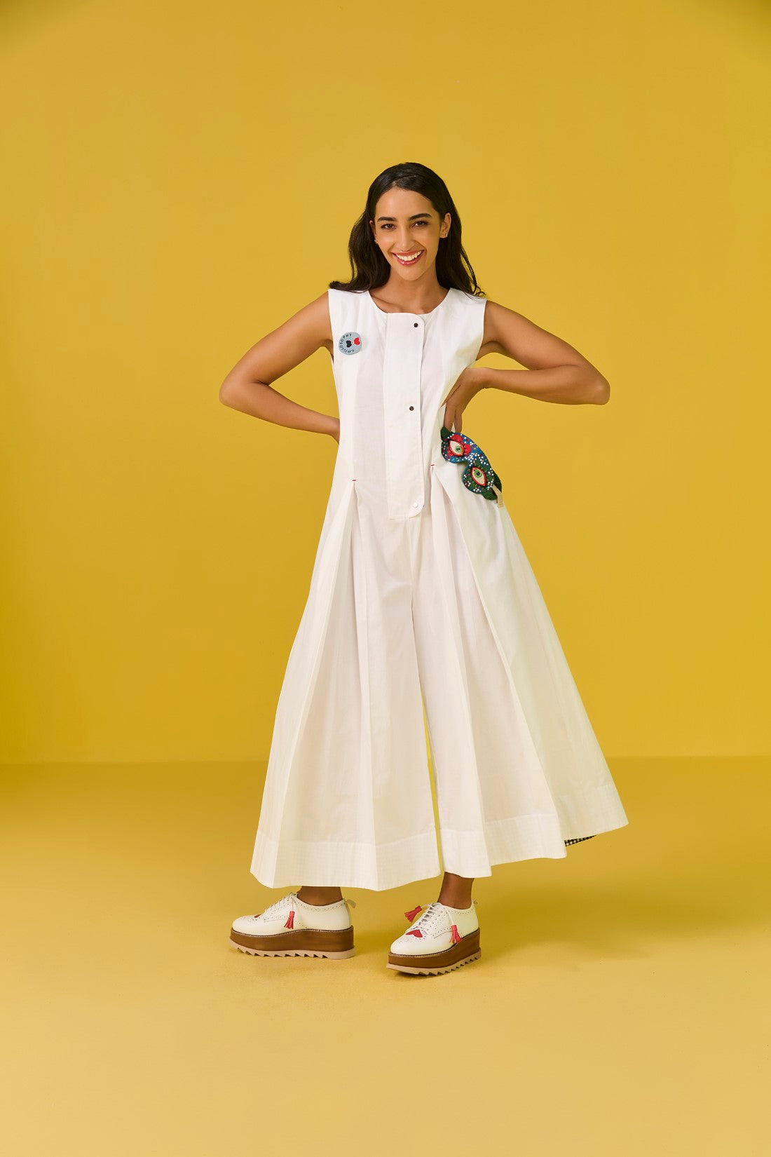 - Big box pleats along the length of the jumpsuit provides a comfort fit