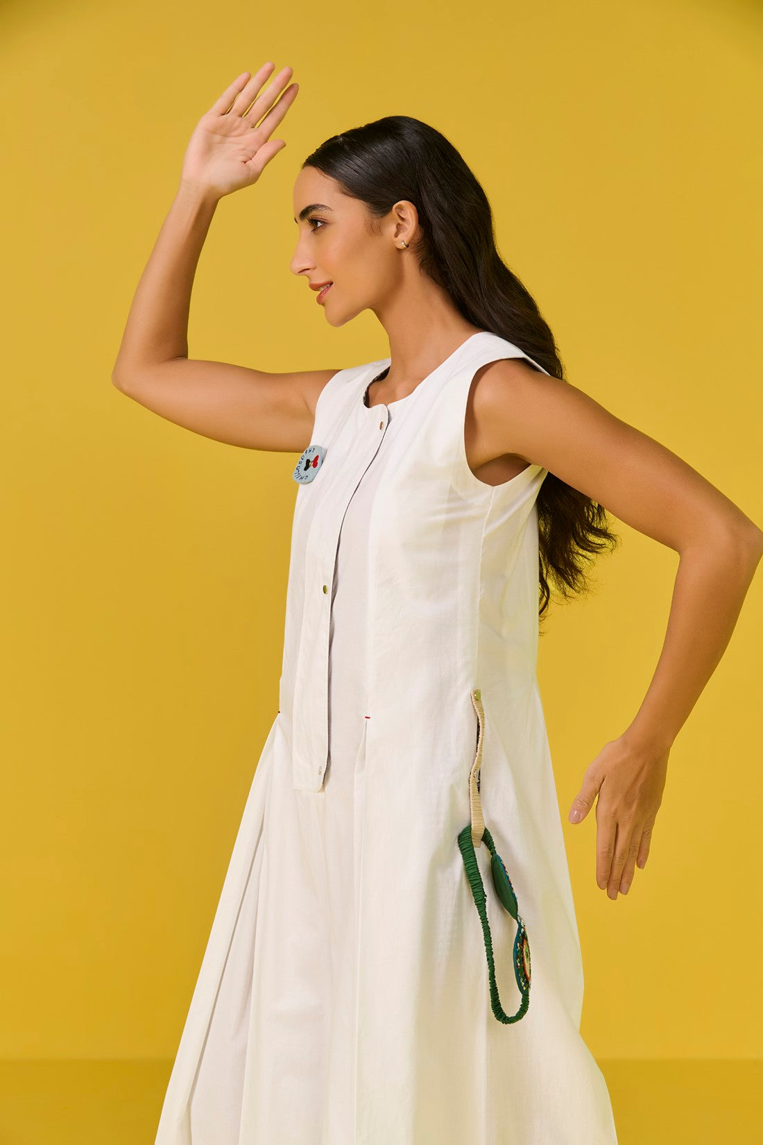 - A sleeveless jumpsuit with front button and zip closure